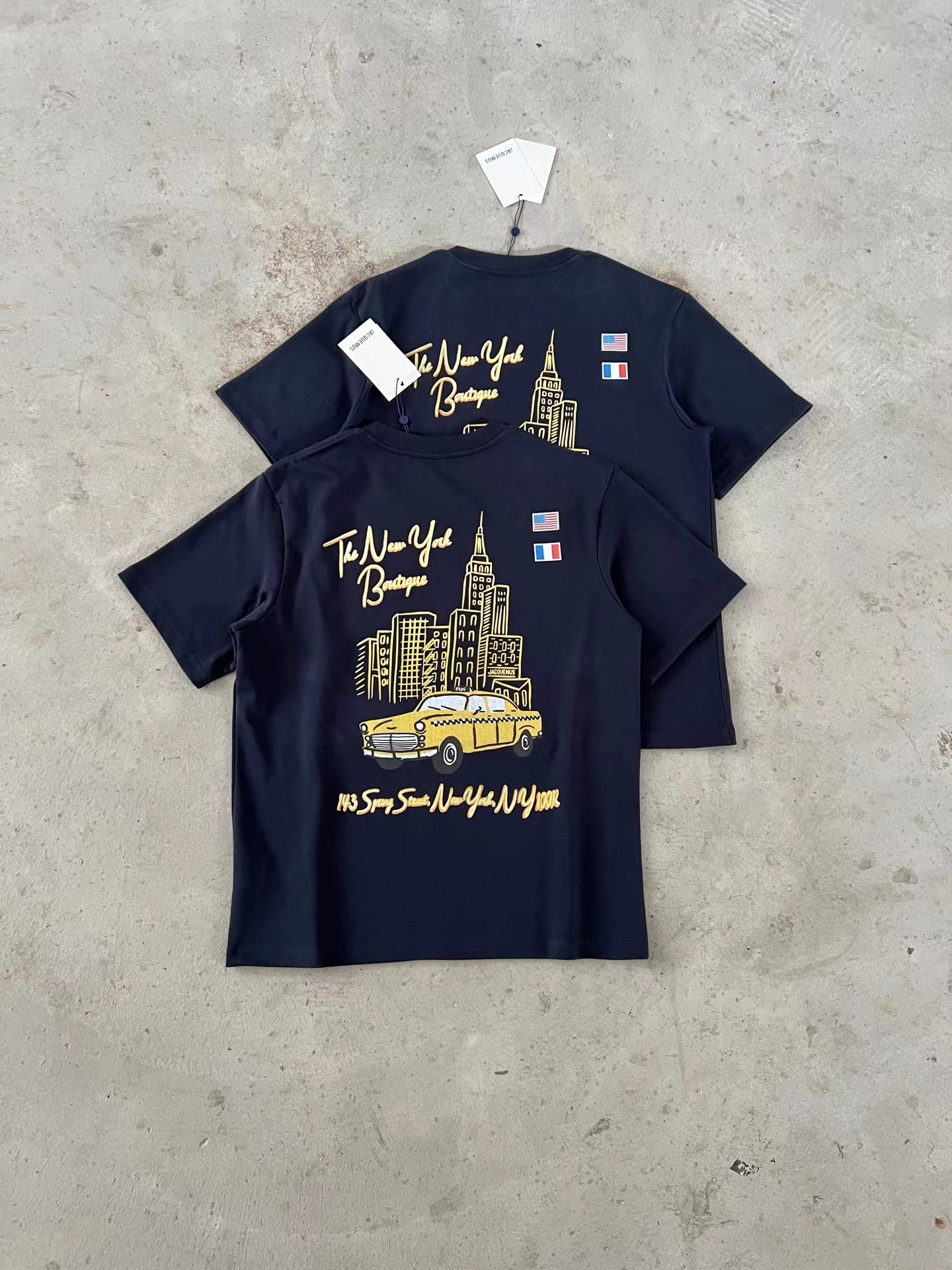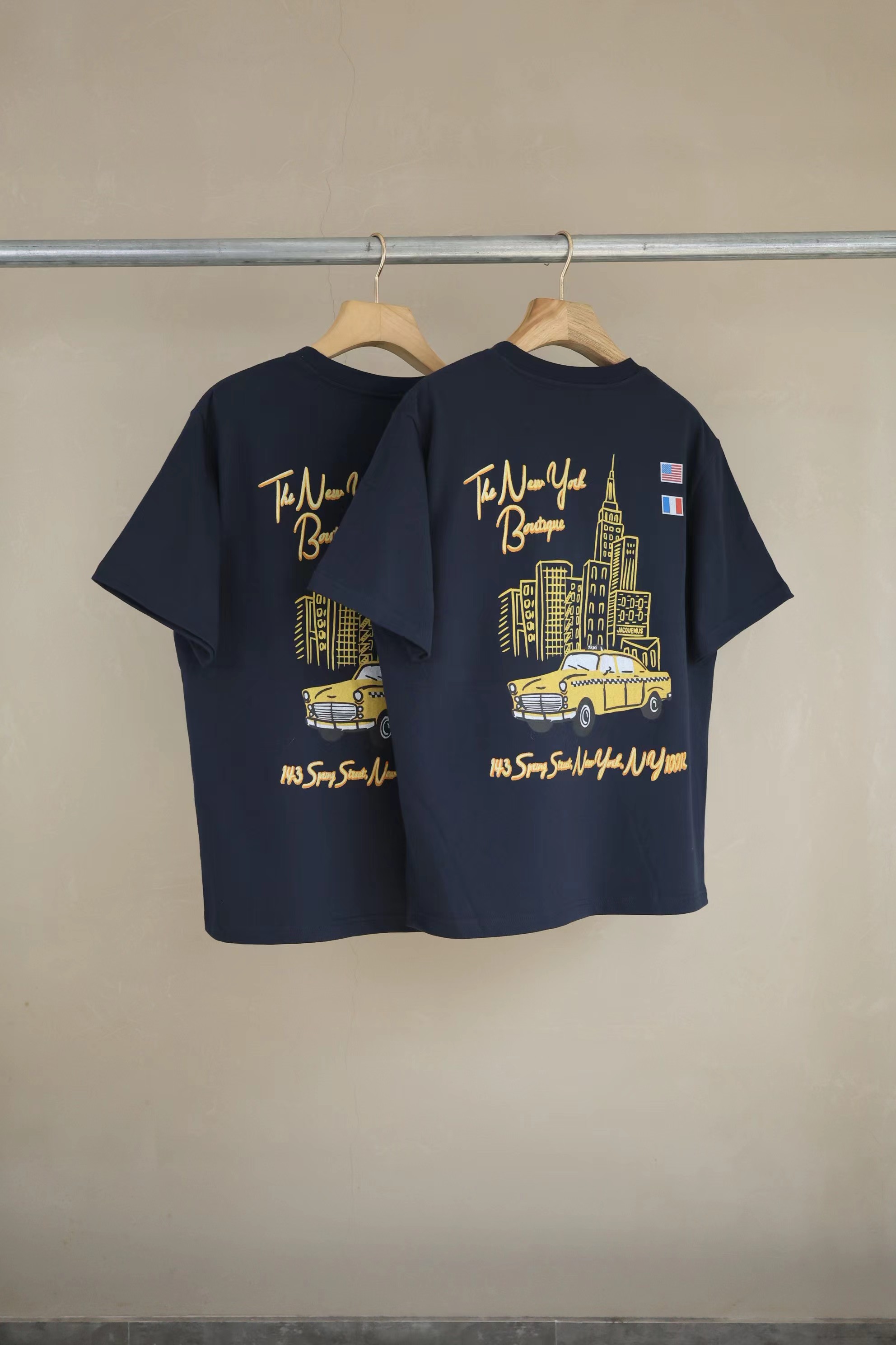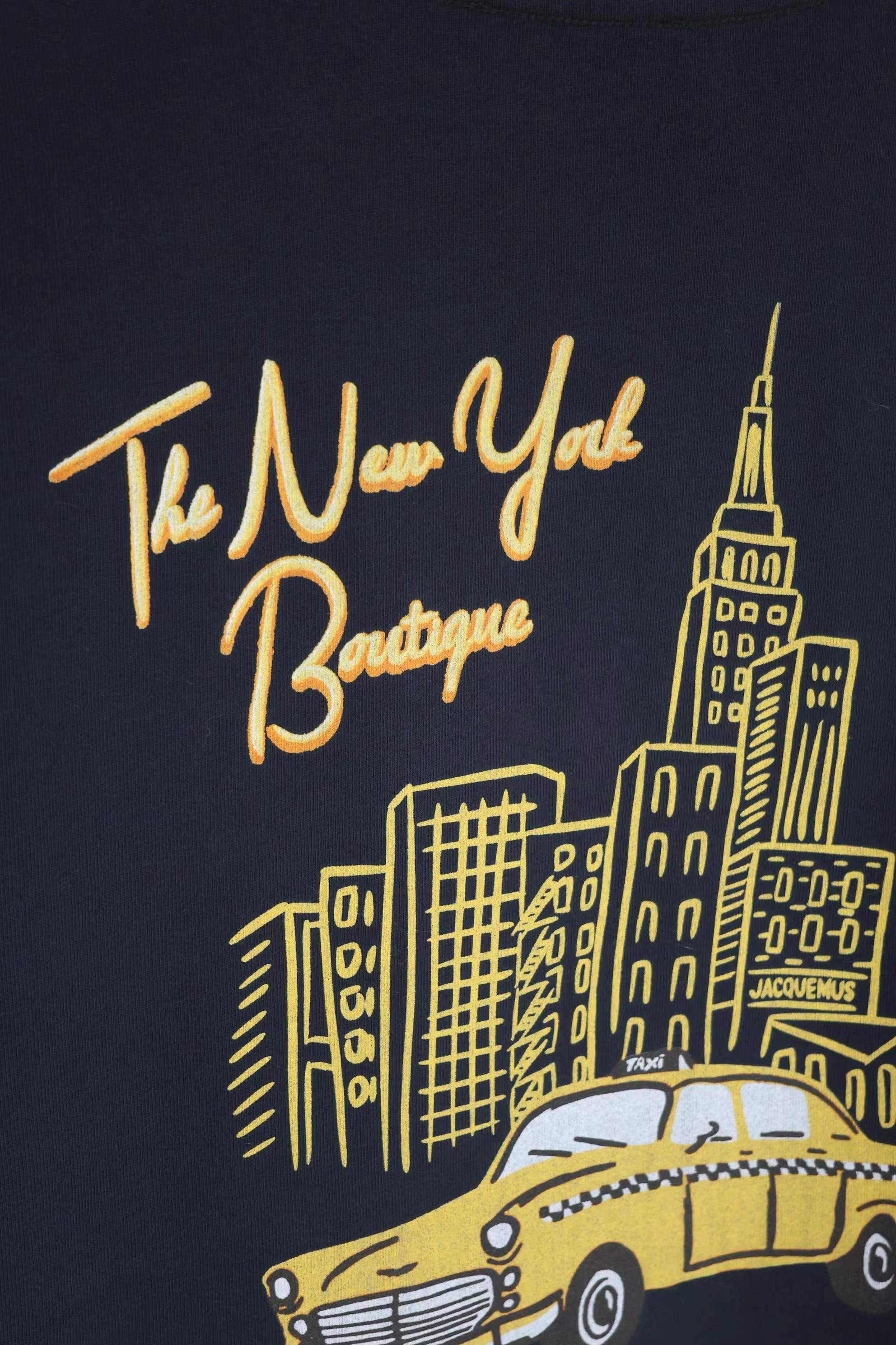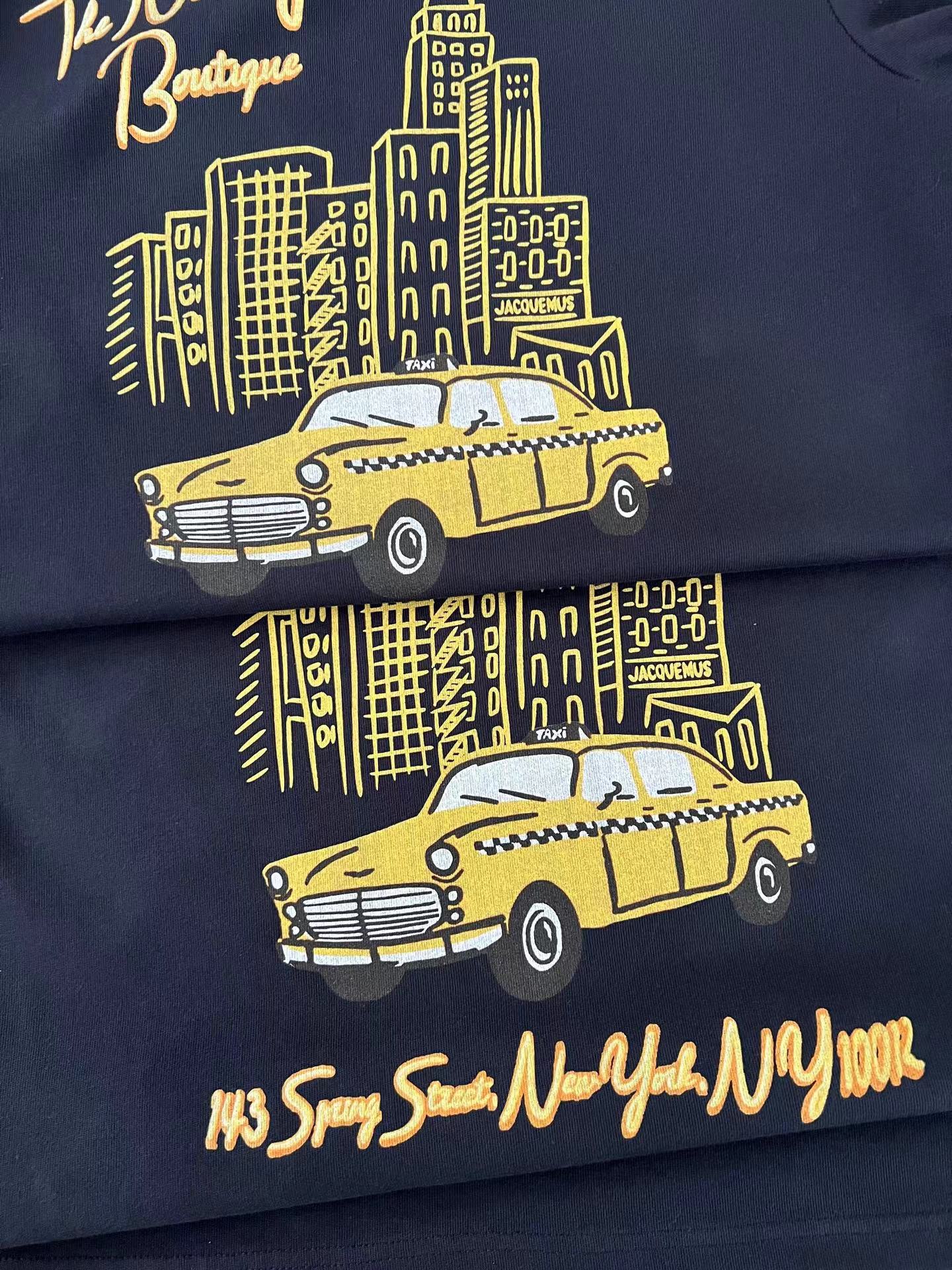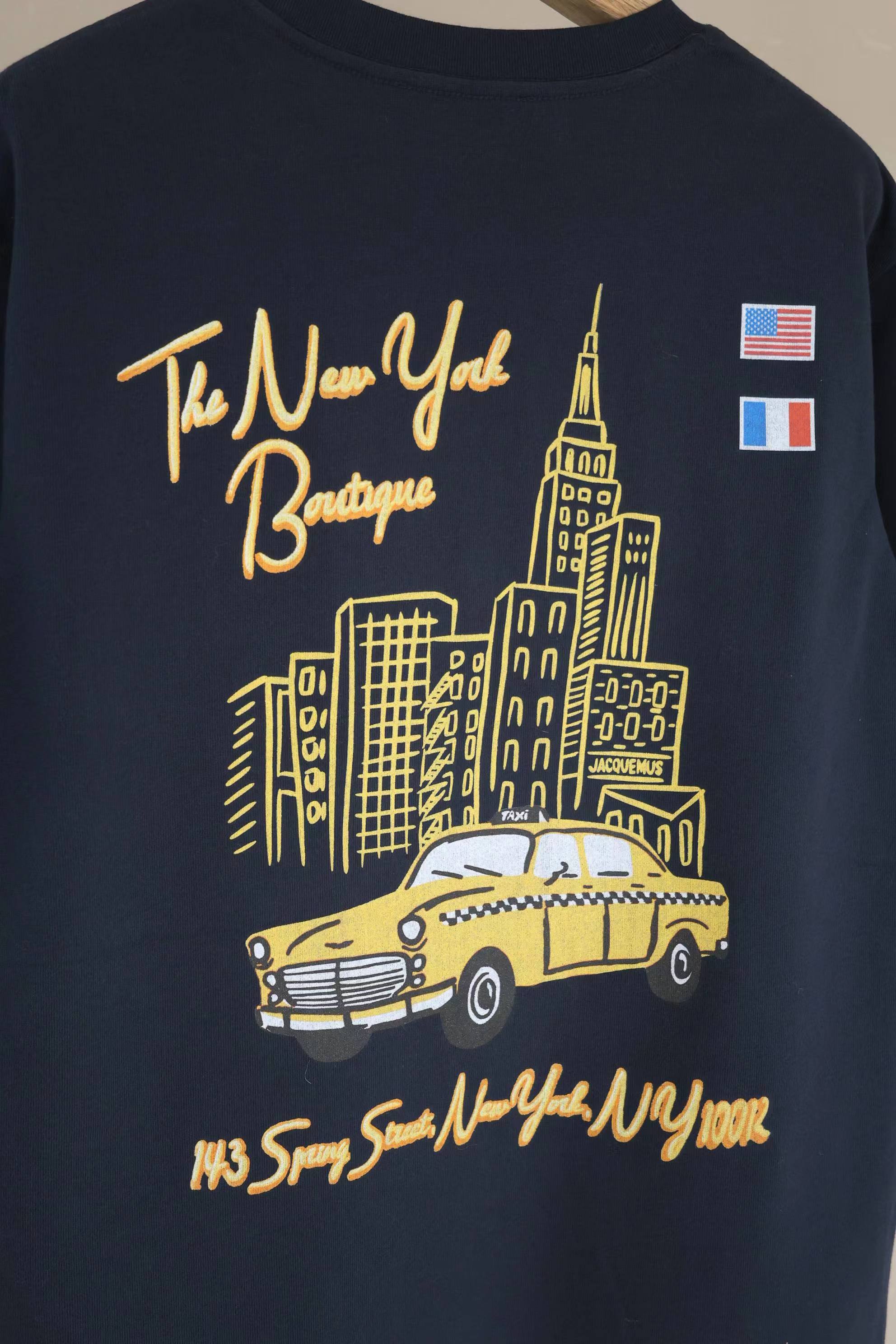 2026春夏新款纽约精品店限定印花短袖T恤,沉稳的藏青色,厚实的棉质感,宽松休闲版型,胸前简约干净,草写的品牌字母在胸口呈现,辨识度丝毫不减;后背大幅纽约主题印花, 纽约城市文化元素的氛围感十足