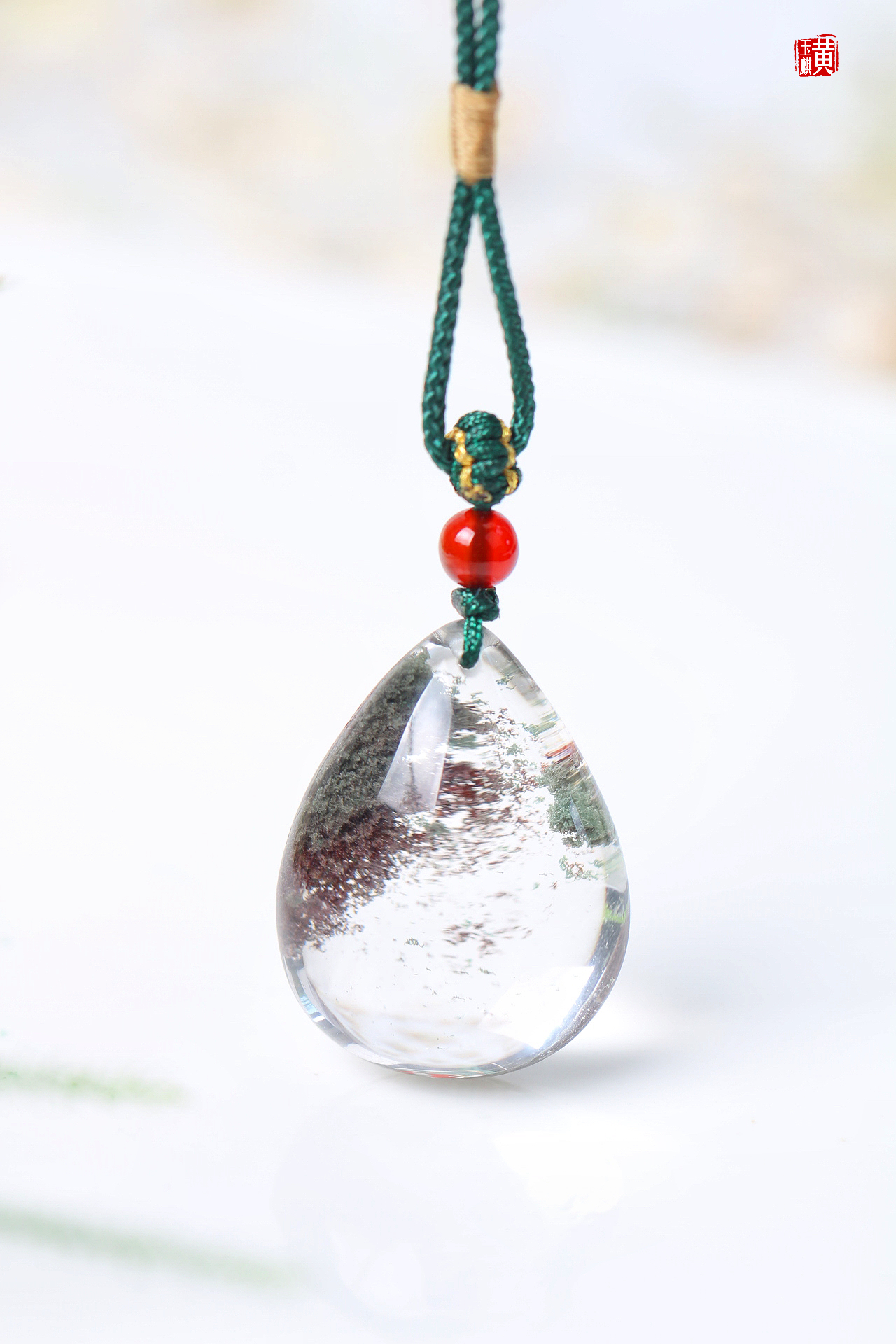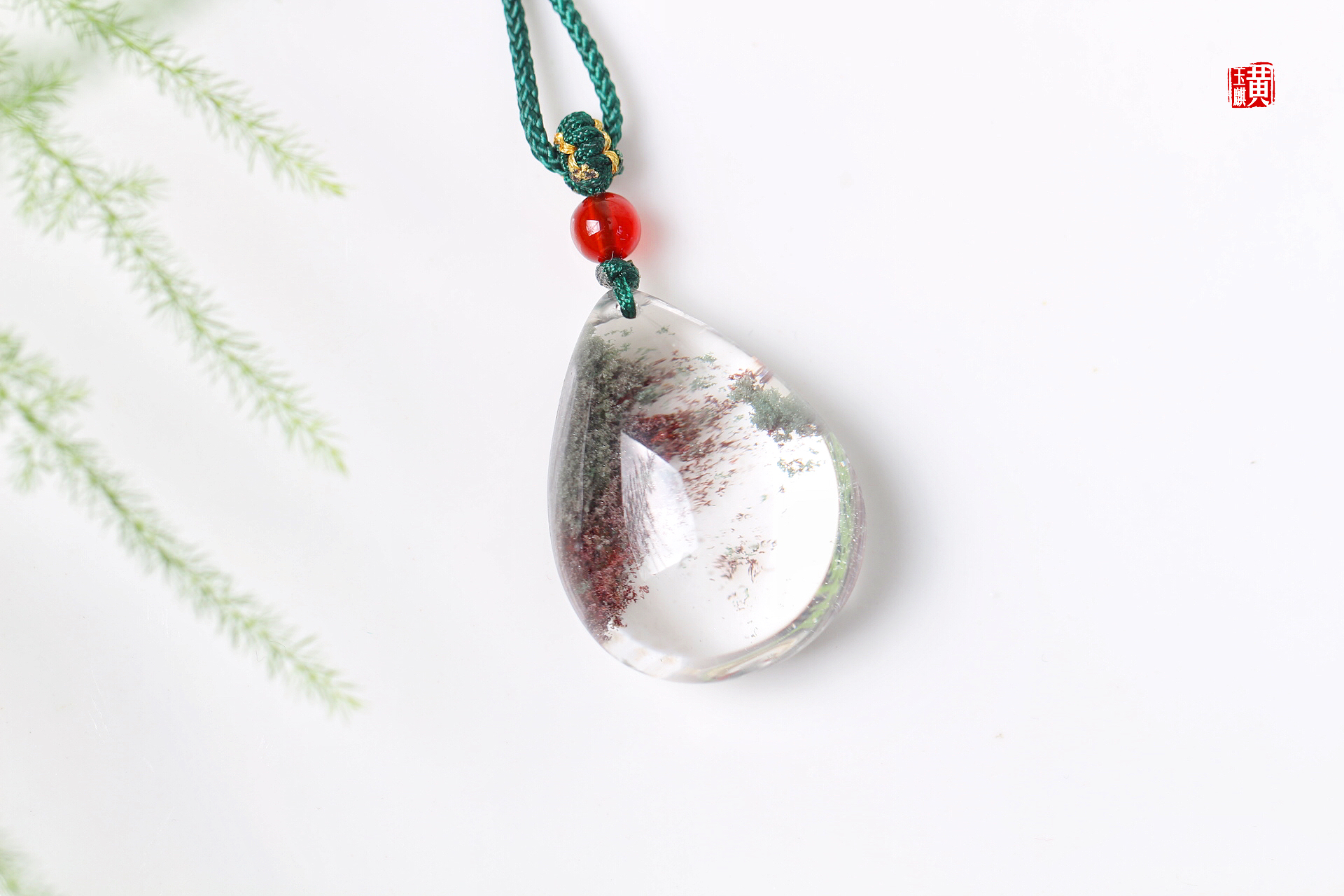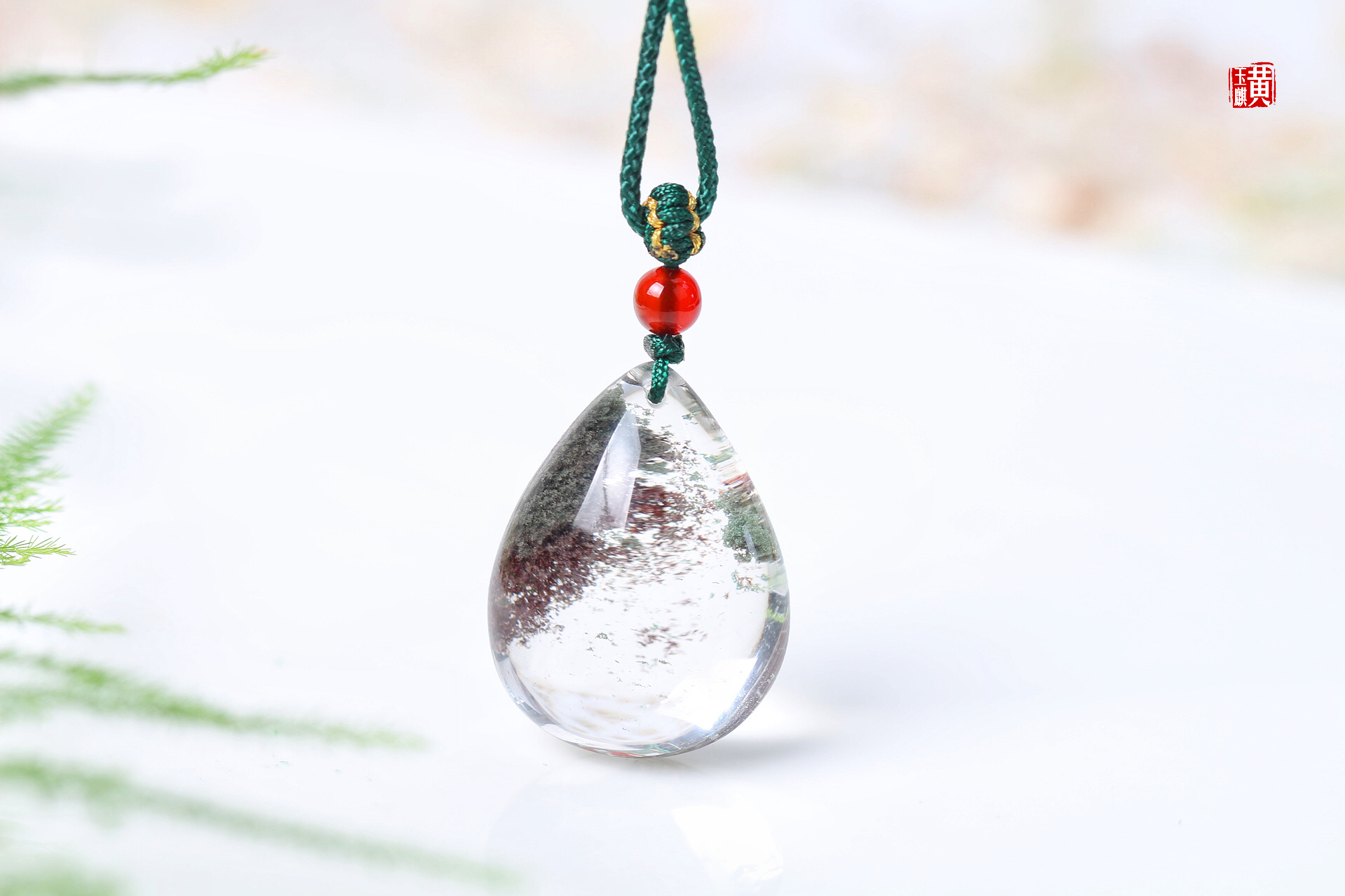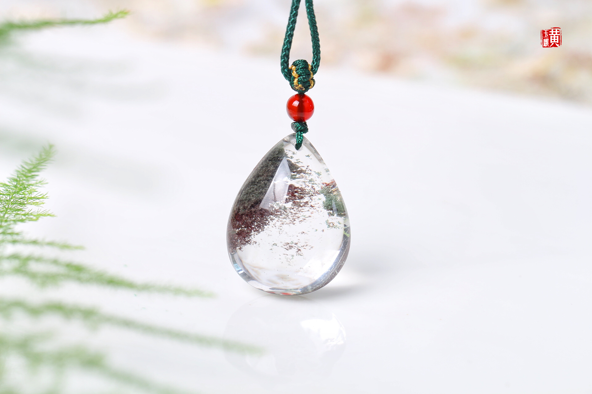 绿幽灵水晶吊坠,饱满的水滴形,纯净的白水晶内部红幽灵和绿幽灵包裹体,从下往上聚集,寓意财富累积、事业步步高升。