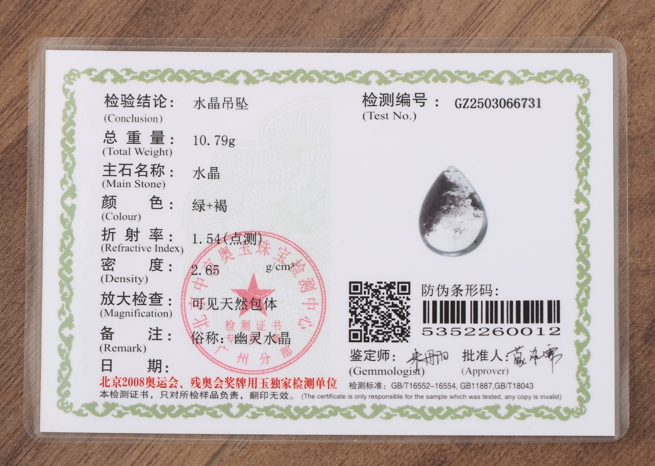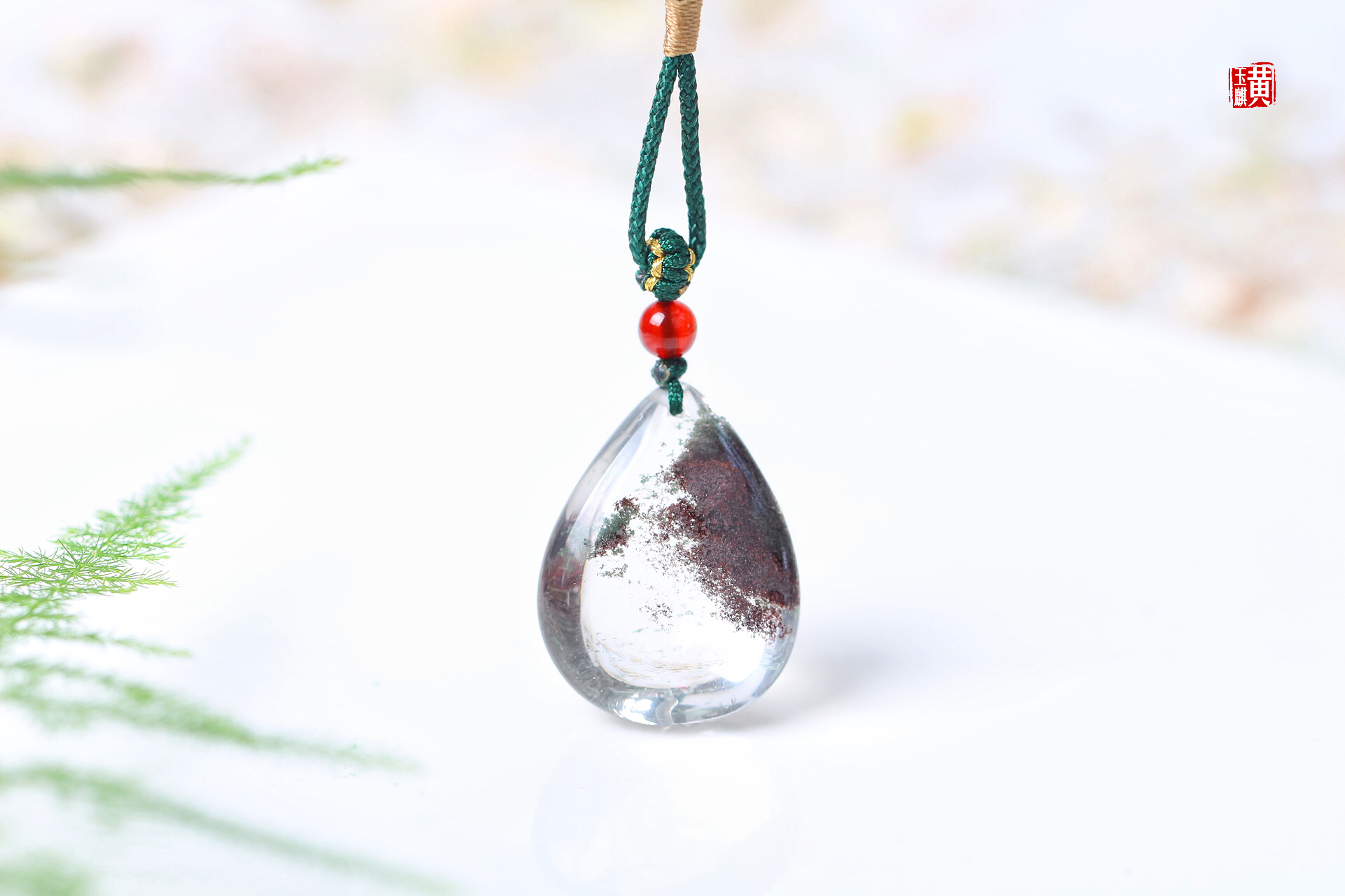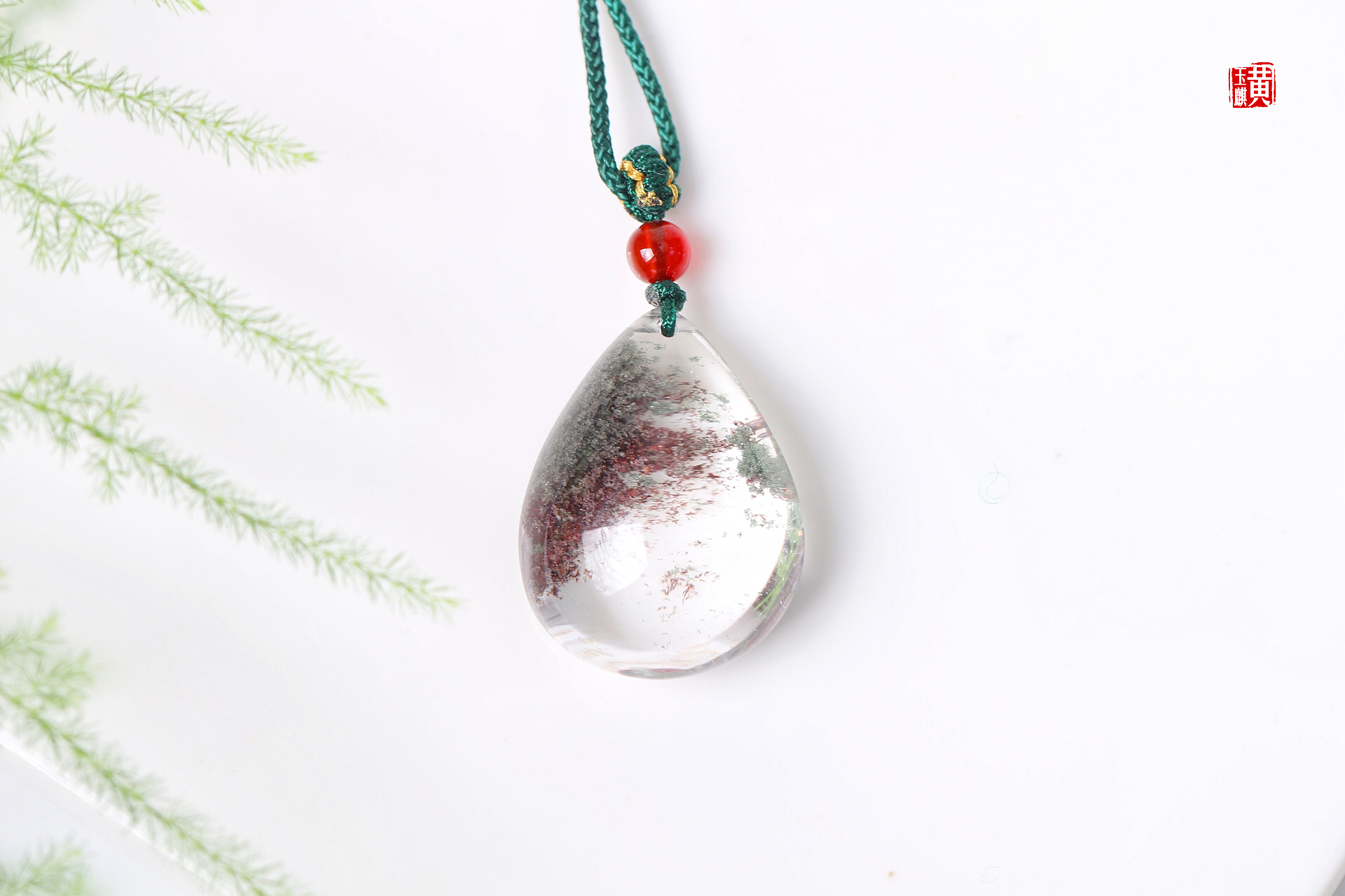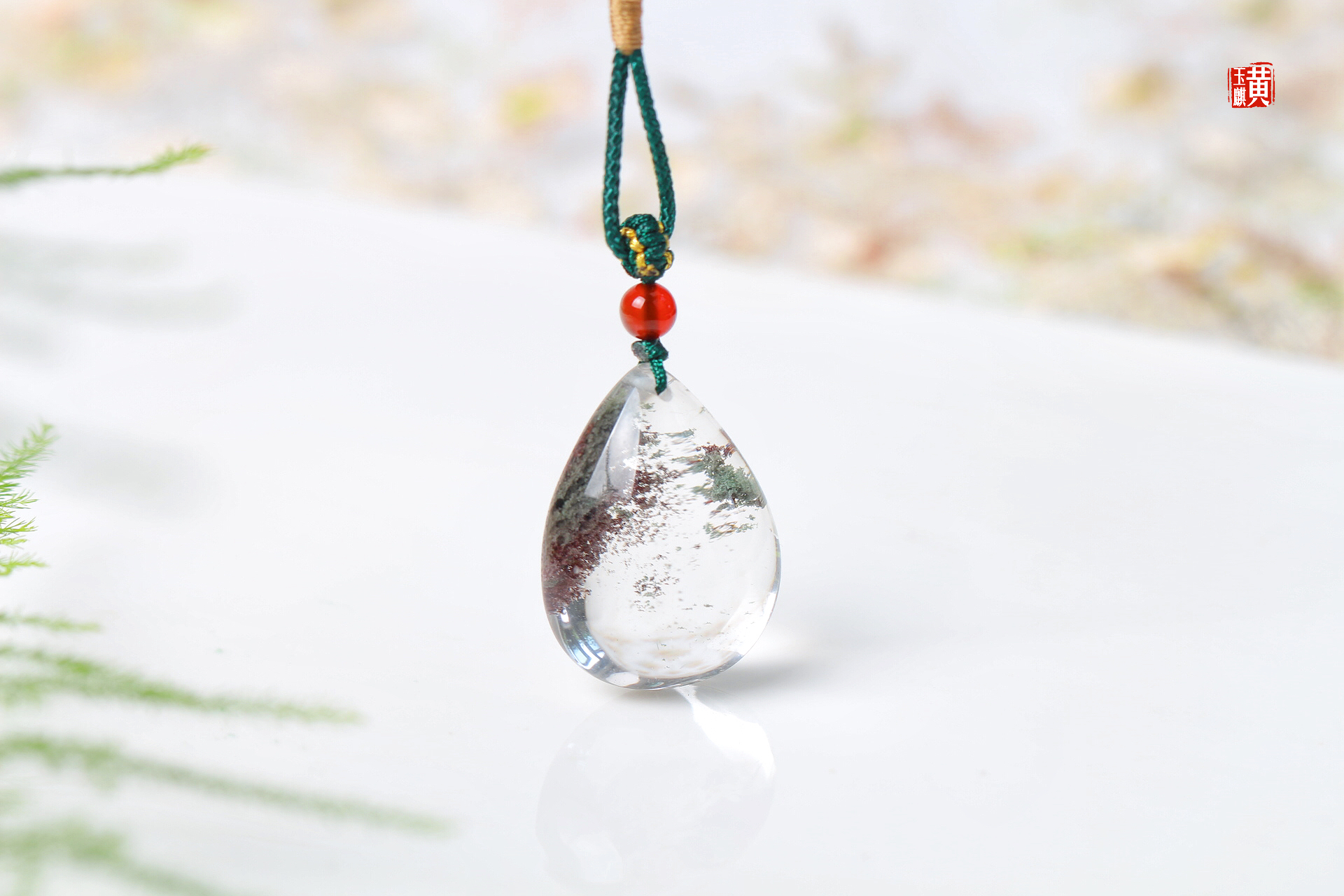 绿幽灵水晶吊坠,饱满的水滴形,纯净的白水晶内部红幽灵和绿幽灵包裹体,从下往上聚集,寓意财富累积、事业步步高升。