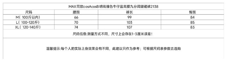 【产品名称】:MAX同款cosAcosB明线撞色牛仔蓝高腰九分阔腿裙裤2138