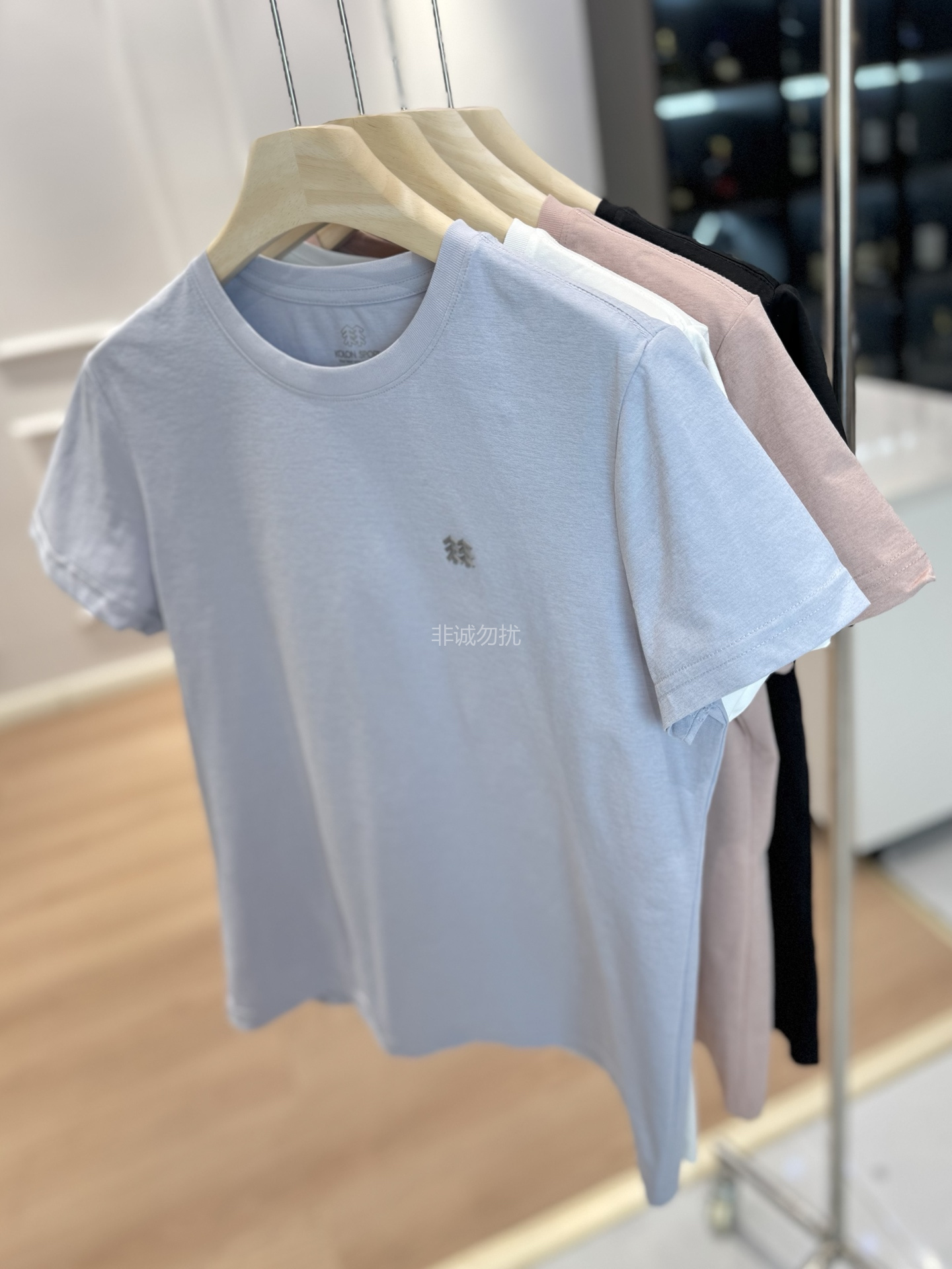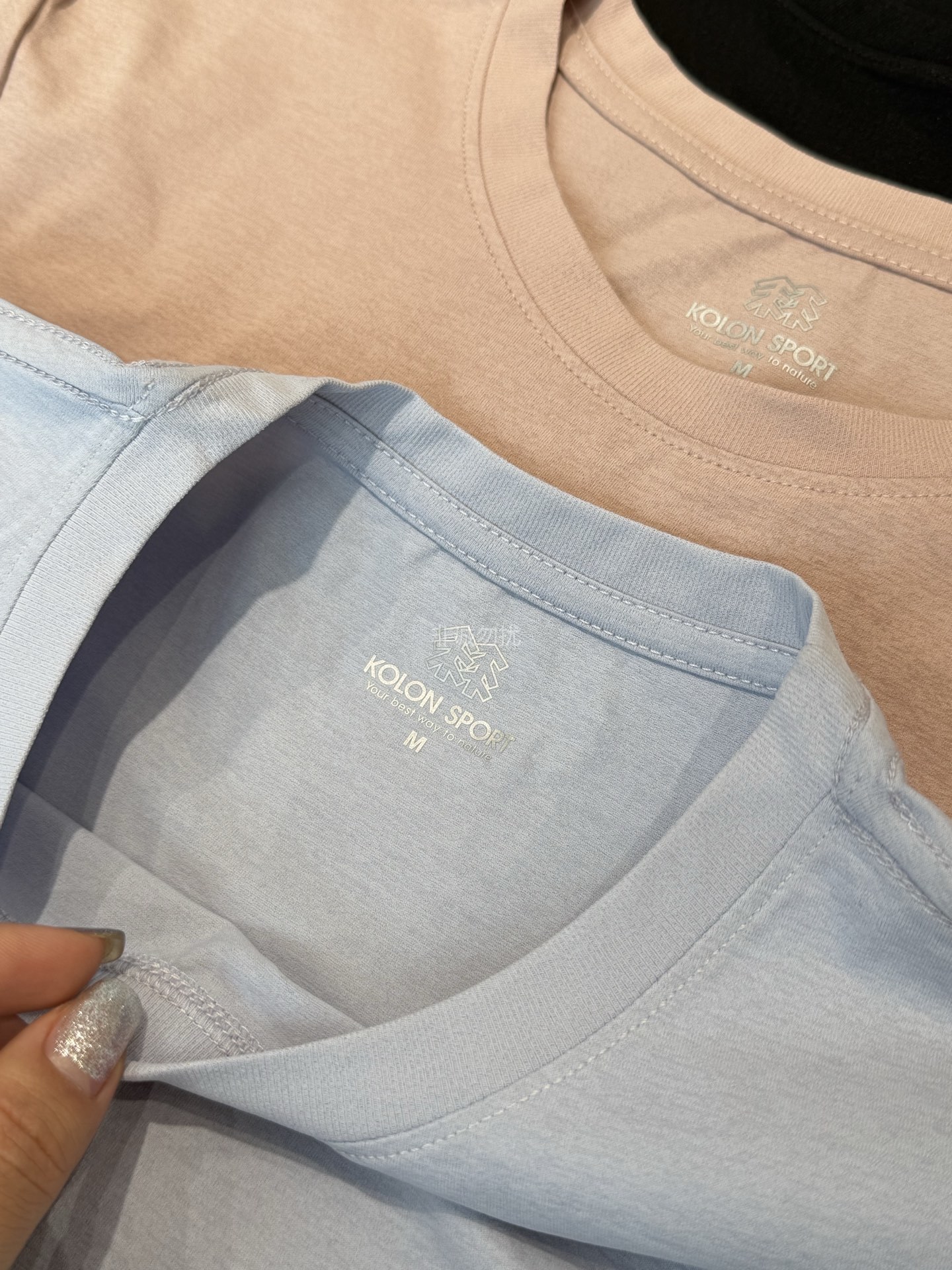 圆领设计后领棉质领条,亲肤性好,肩膀接缝处压线平整,袖口➕下摆双针压线,很平整美观,微合身H型显瘦版型。