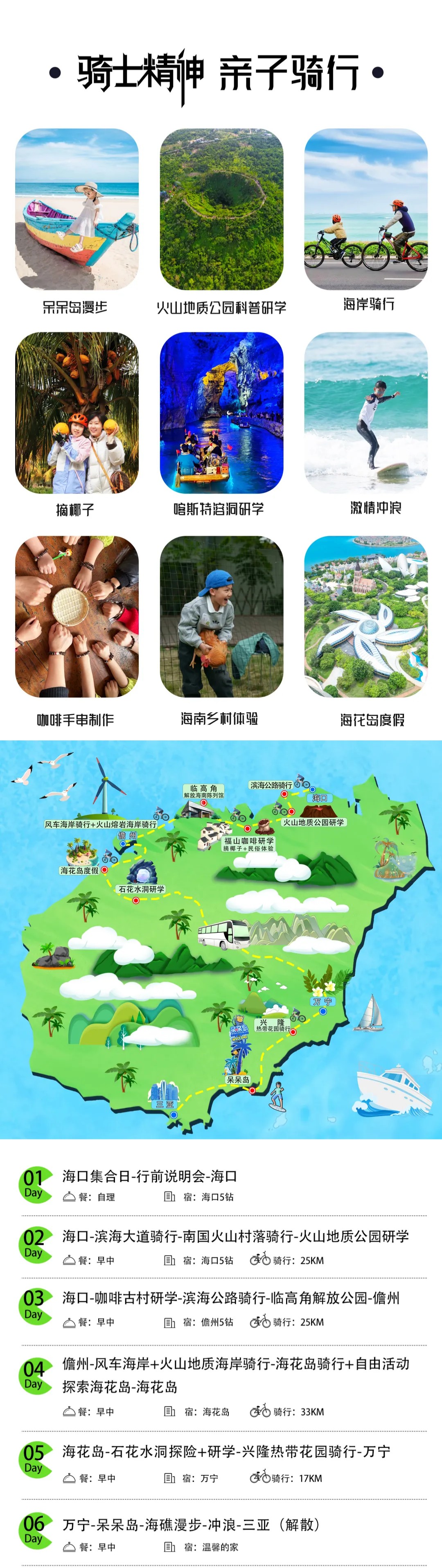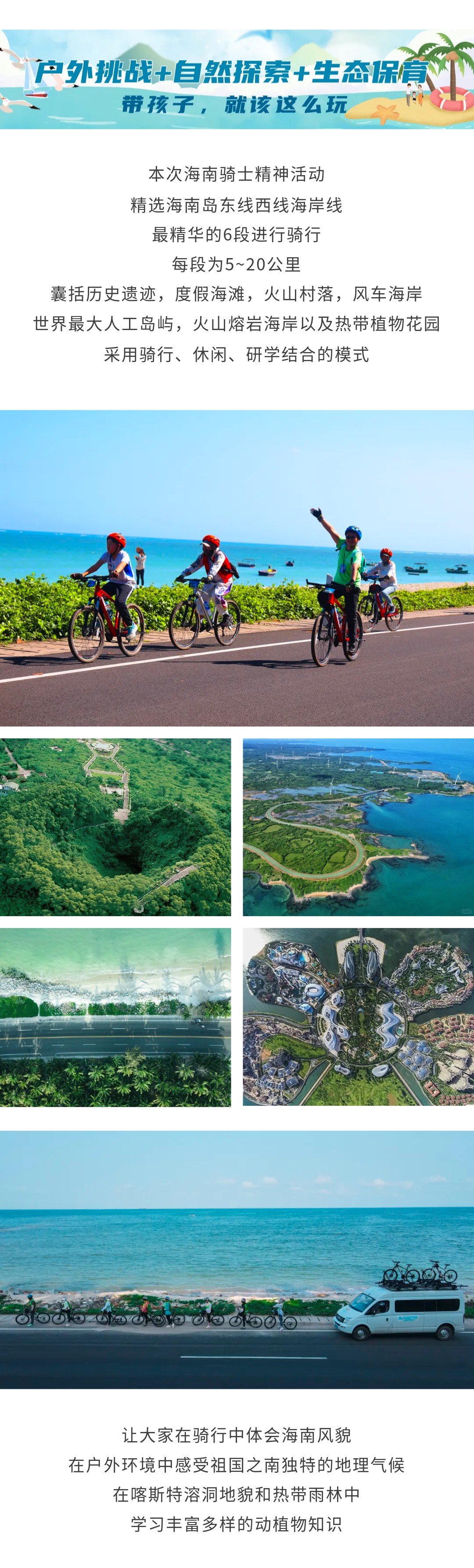 限时早鸟立减600!【海南岛骑士精神】东线+西线亲子骑行!6段不同骑行体验:海滩绿道、火山村落小道、白沙银滩和礁石海岸、火山岩海岸线及风车海岸线、花瓣形人工岛屿、热带雨林和热带花园…