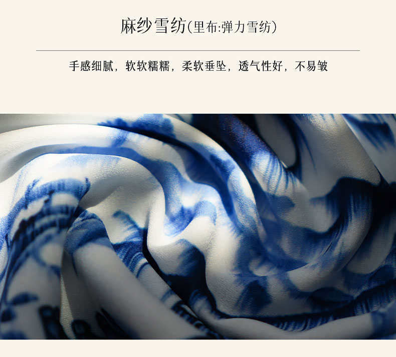 ✔ 麻纱雪纺:取自苏绣传统的「冰纹绉」织法,触感如初春新柳拂过腕间,垂坠时自带水墨氤氲感,手感细腻,软软糯糯~~