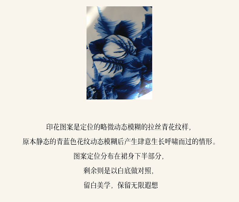 图案定位分布在裙身下半部分,剩余则是以白底做对照,留白美学,保留无限遐想...~