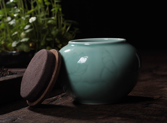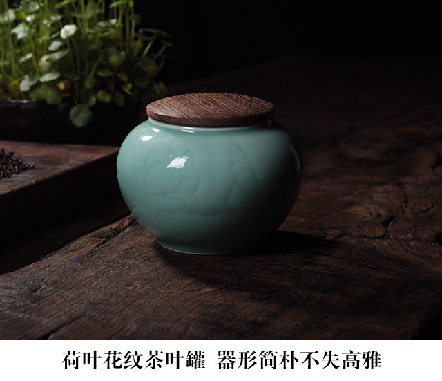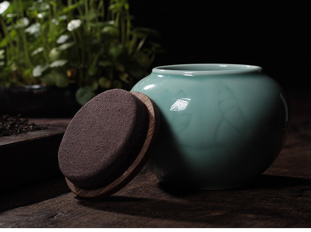尚唐丨龙泉青瓷 大号茶叶罐 鸡翅木盖 青木荷花款
