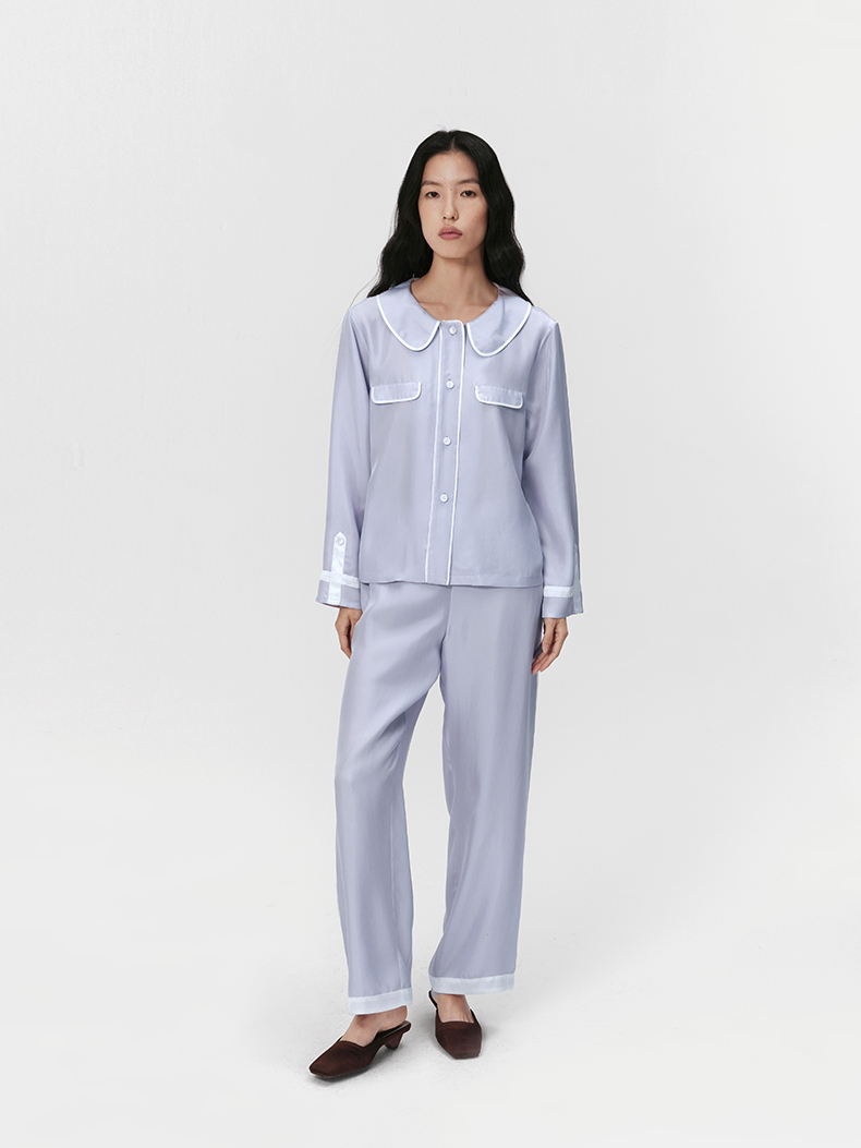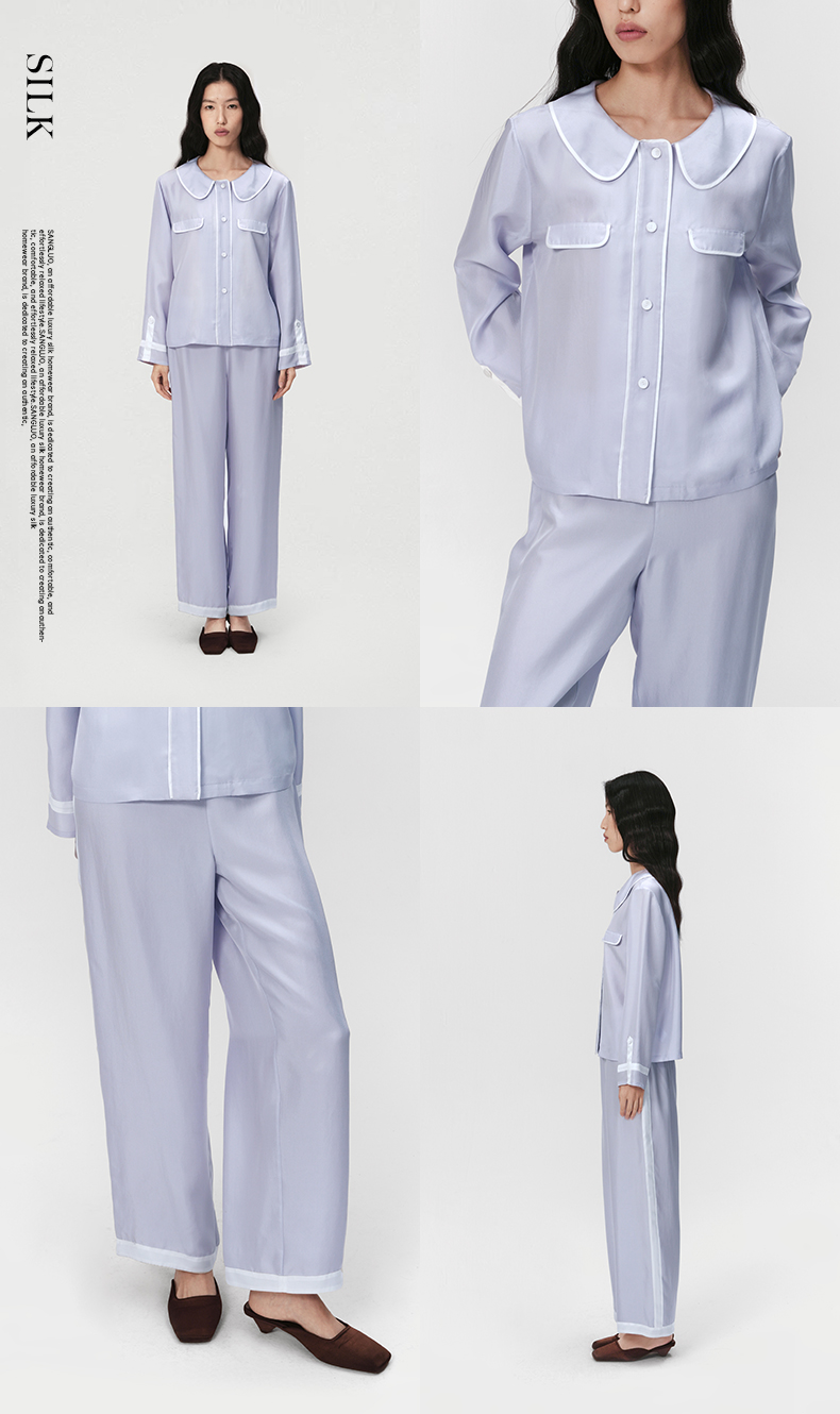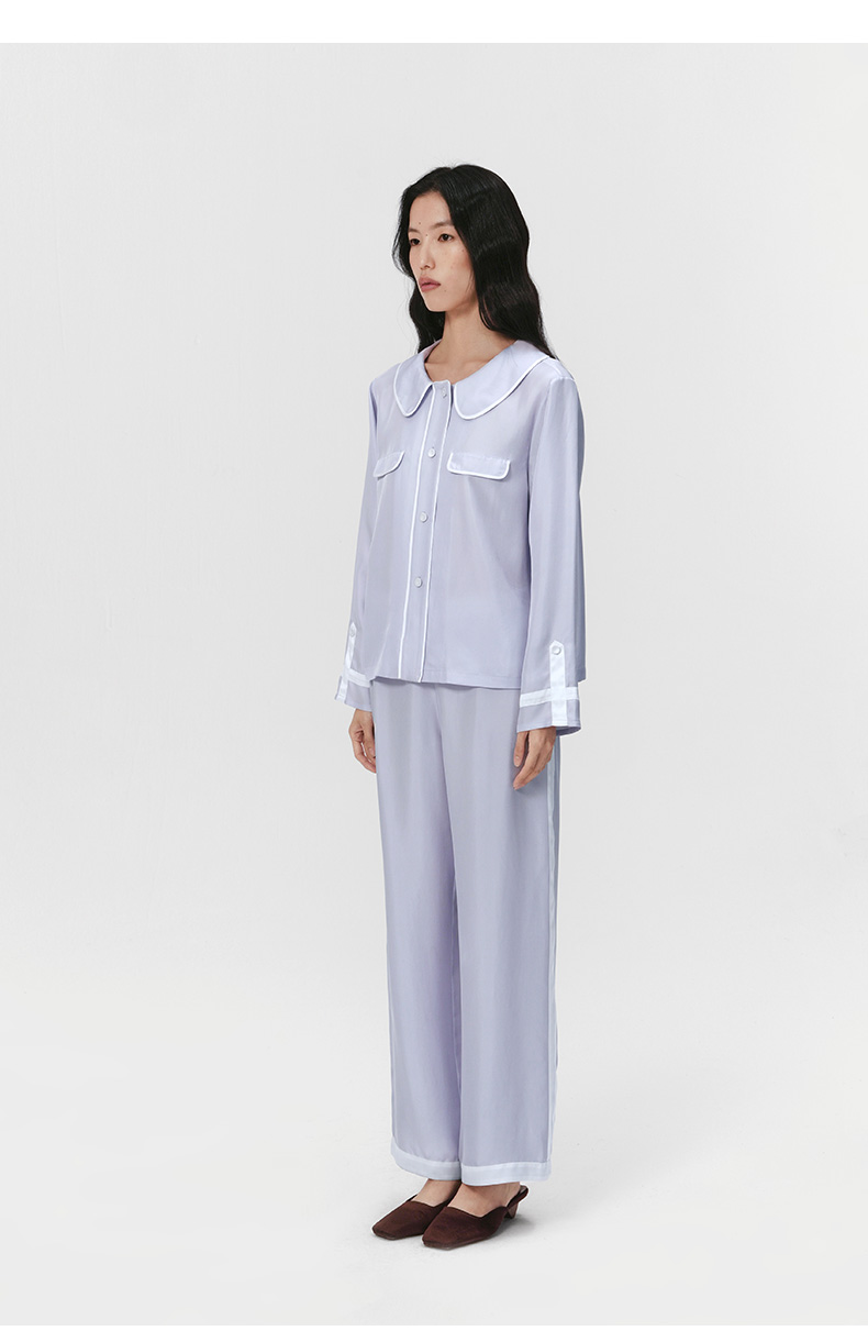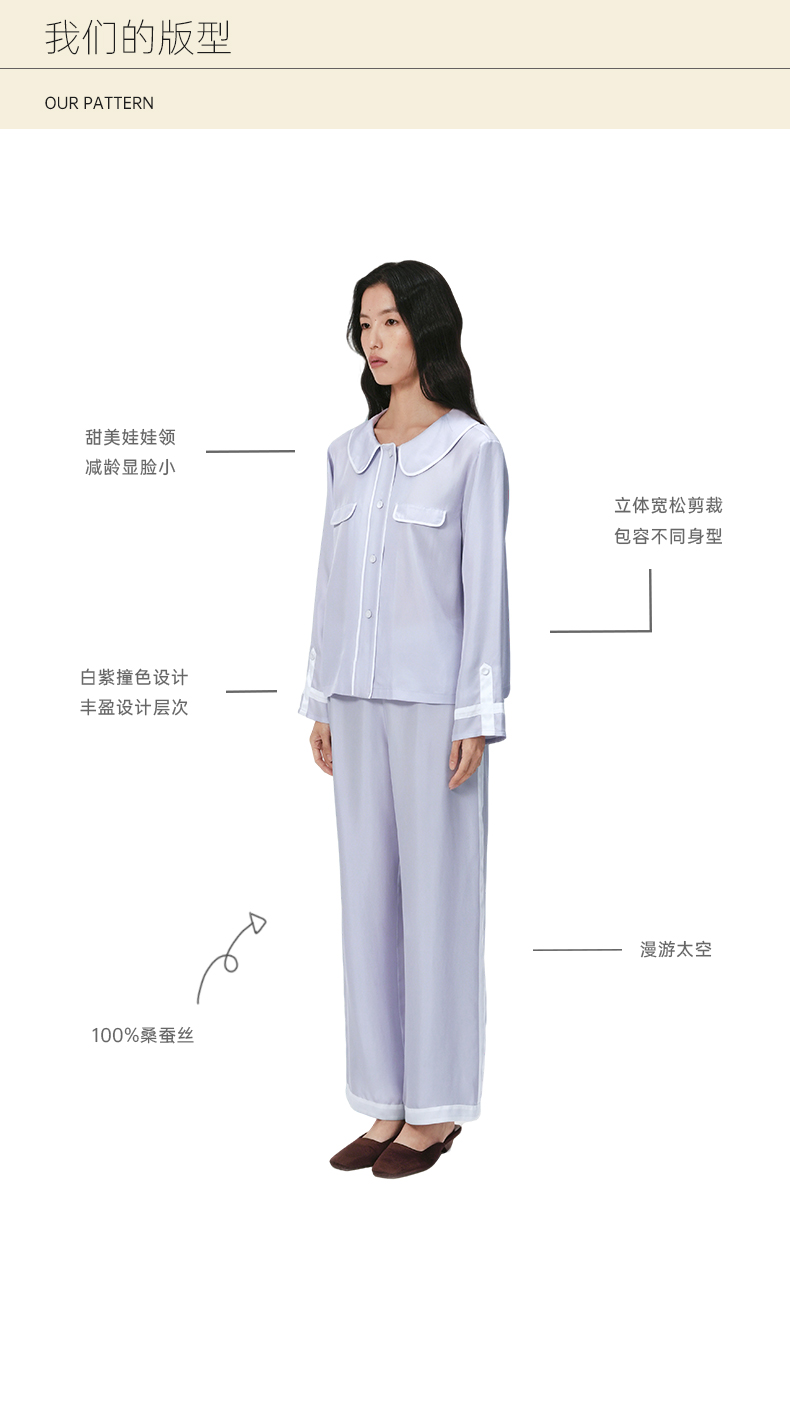 藤萝紫』桑罗撞色娃娃领睡衣套装桑蚕丝女长袖家居服外穿