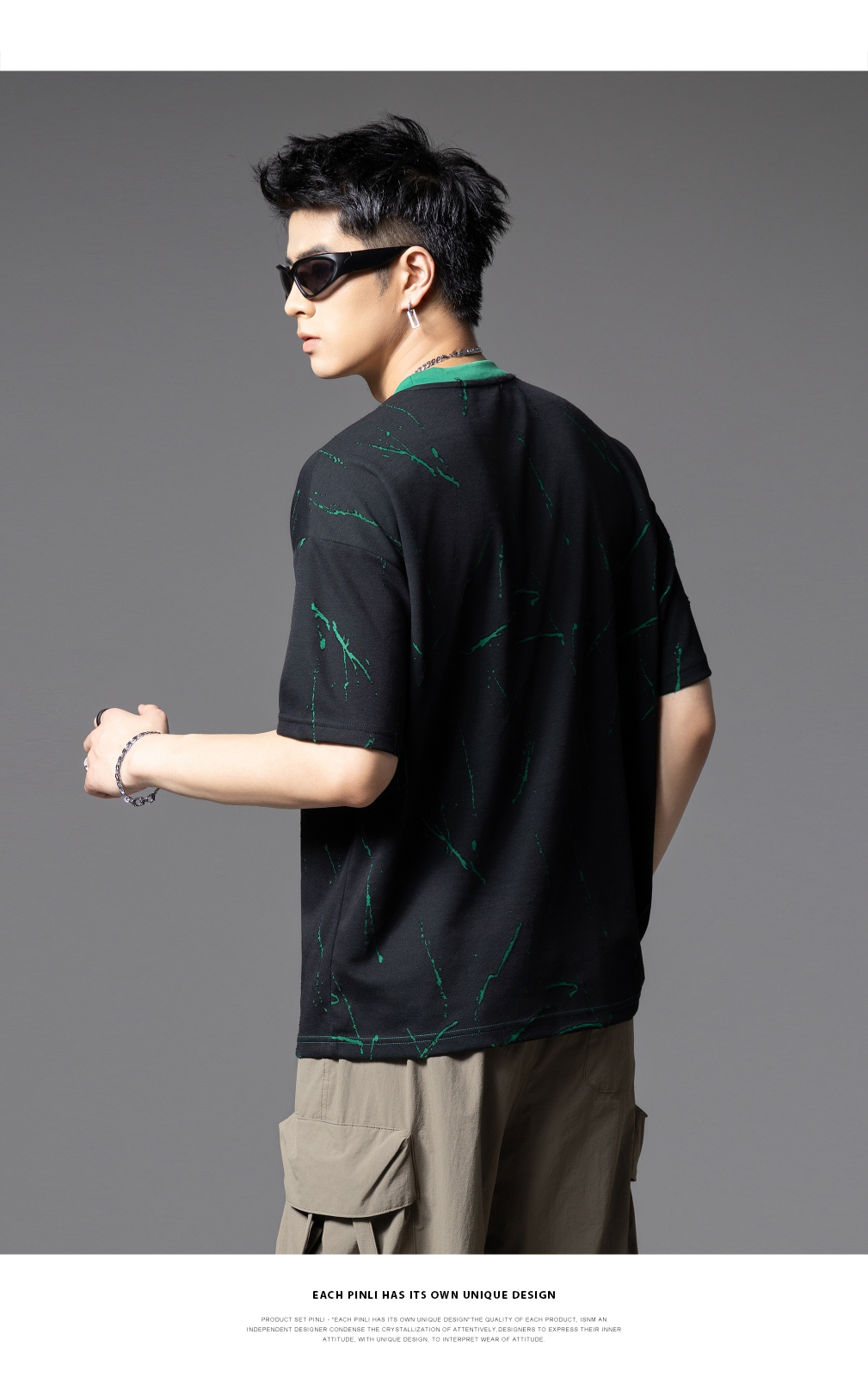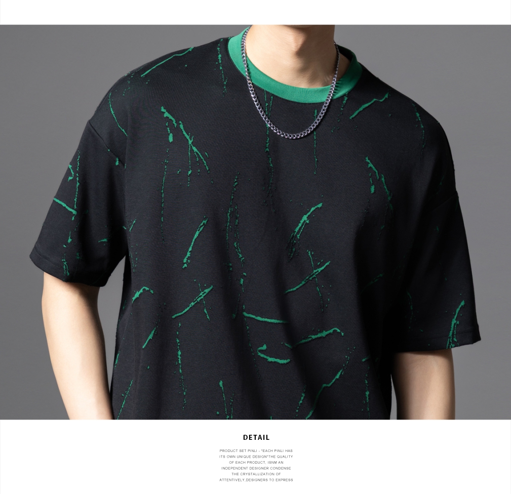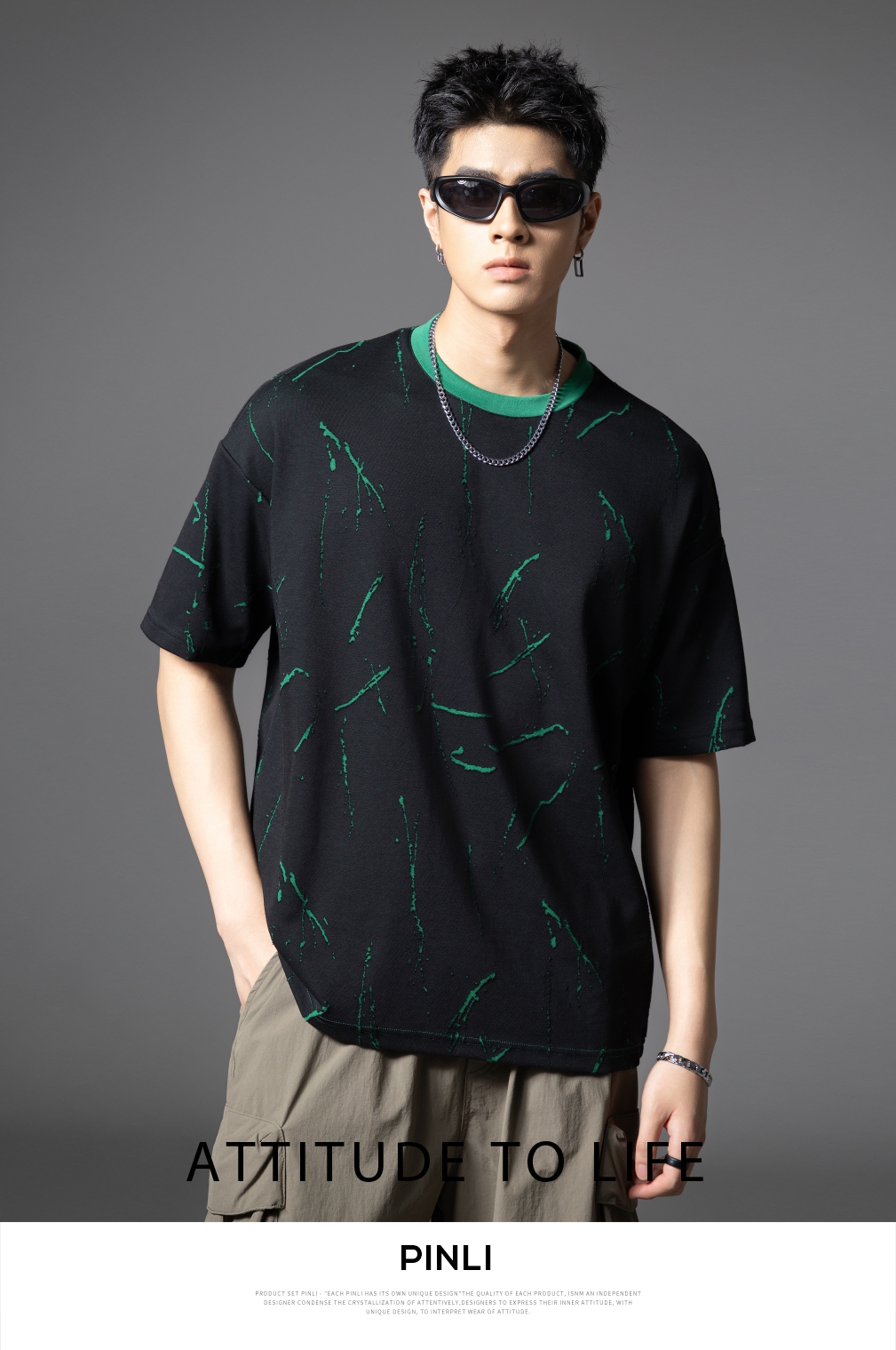 PINLI品立2025夏季新款潮流破洞短袖圆领T恤男士宽松休闲撞色上衣B252111084