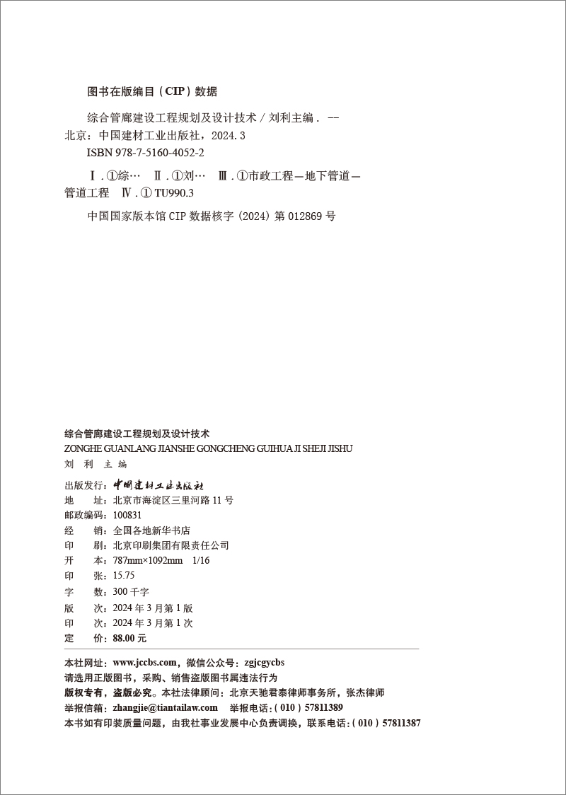 综合管廊建设工程规划及设计技术 刘利主编 中国建材工业出版社