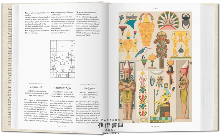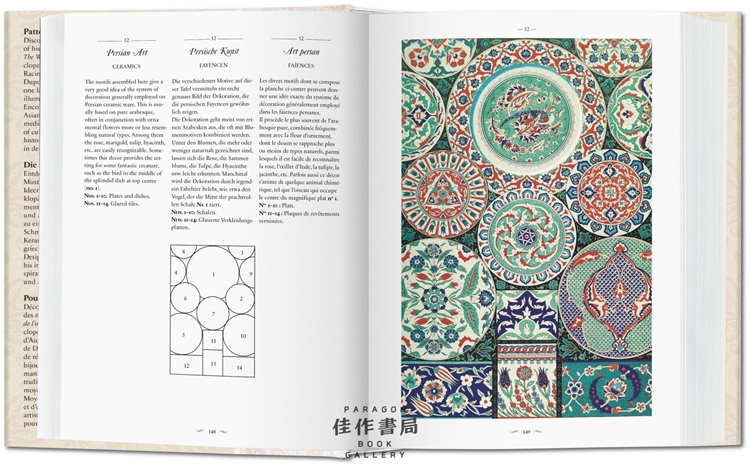 这本内容广泛的合集收录了挂毯、手稿彩绘、地毯和瓷砖等丰富藏品,将19世纪两部最伟大的装饰图案目录汇集在一起,成为一本不可或缺的参考书。它涵盖了从中世纪到19世纪的各种设计,风格多样,包括埃及风格、伊特鲁里亚风格和中东风格等,这一版本专门致力于装饰艺术的呈现。