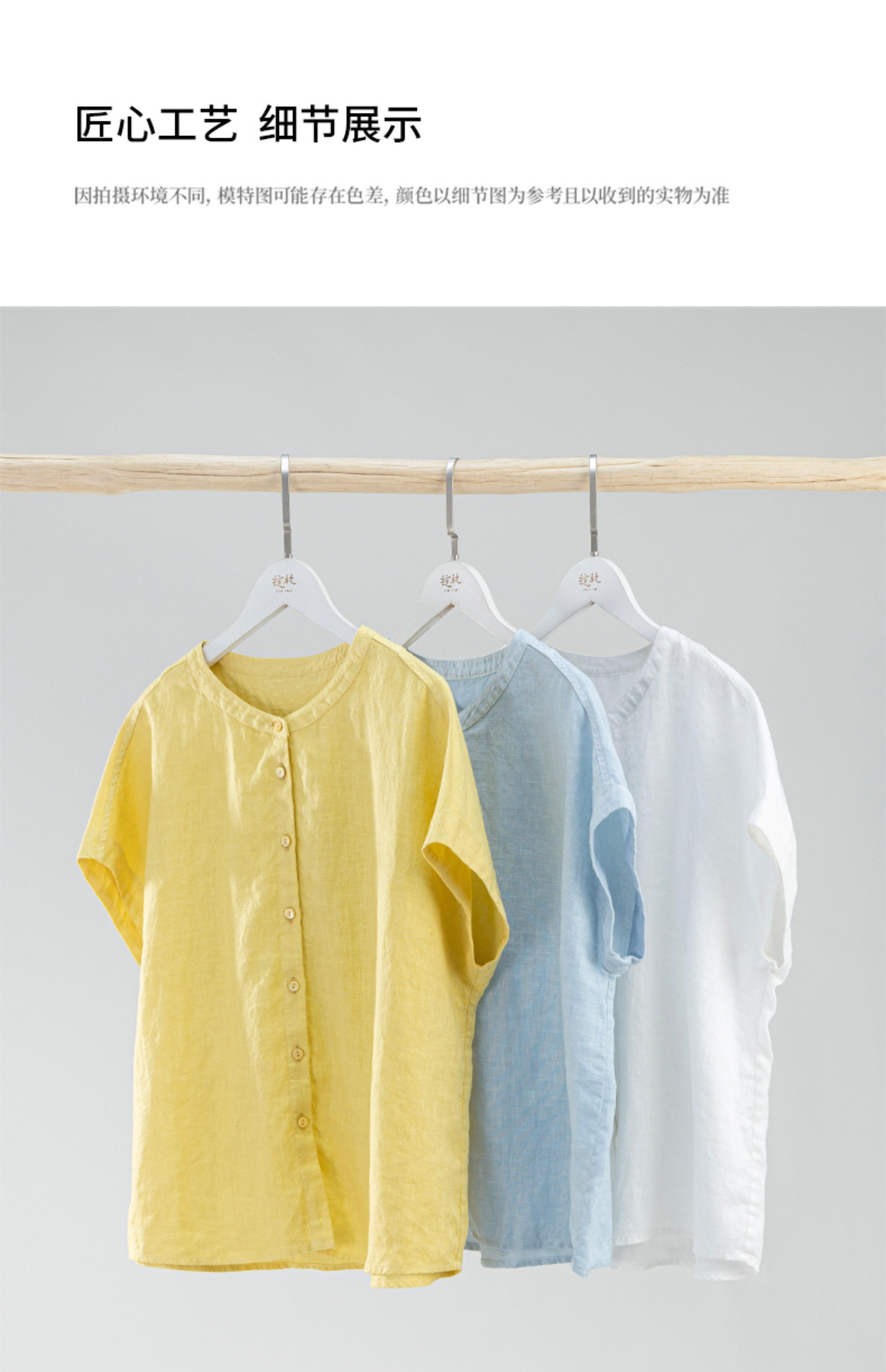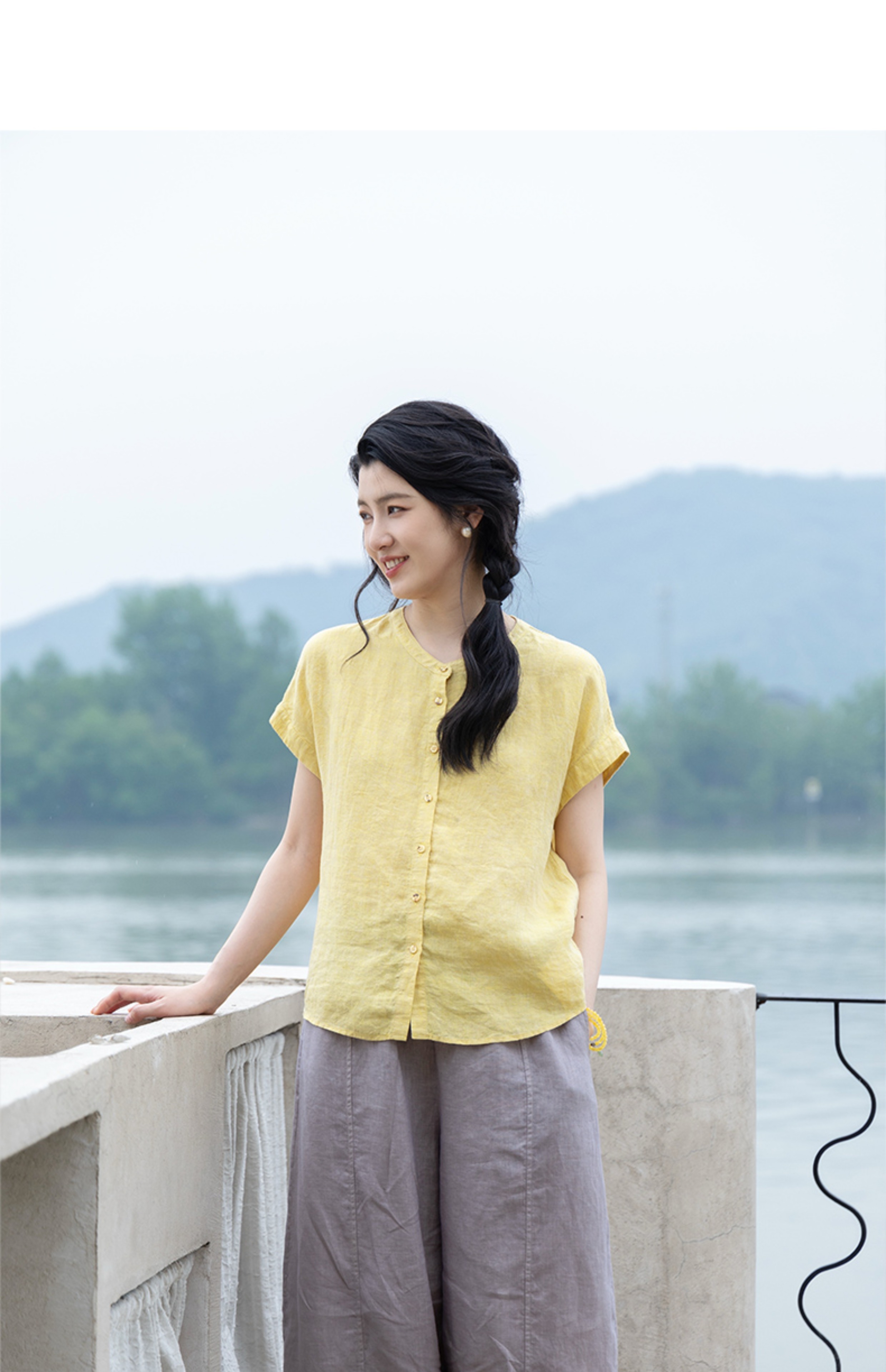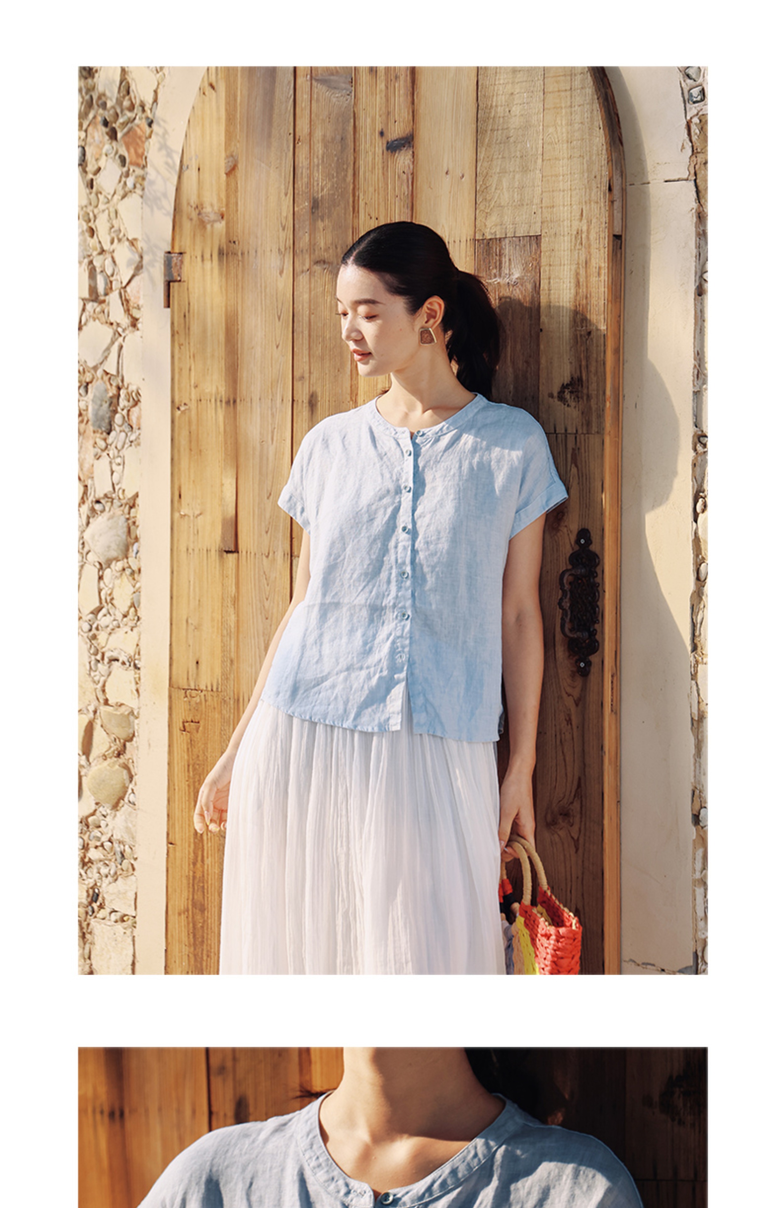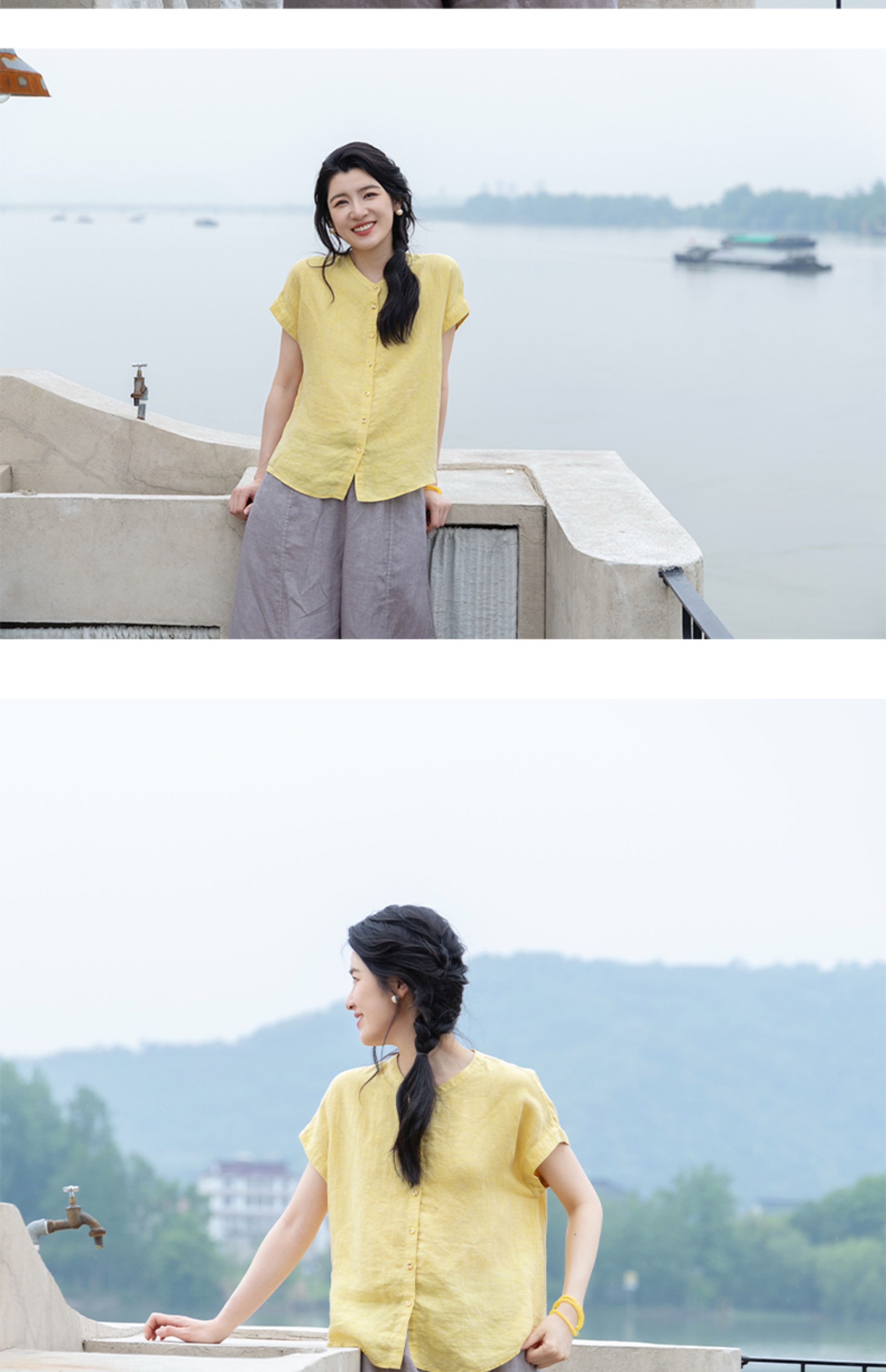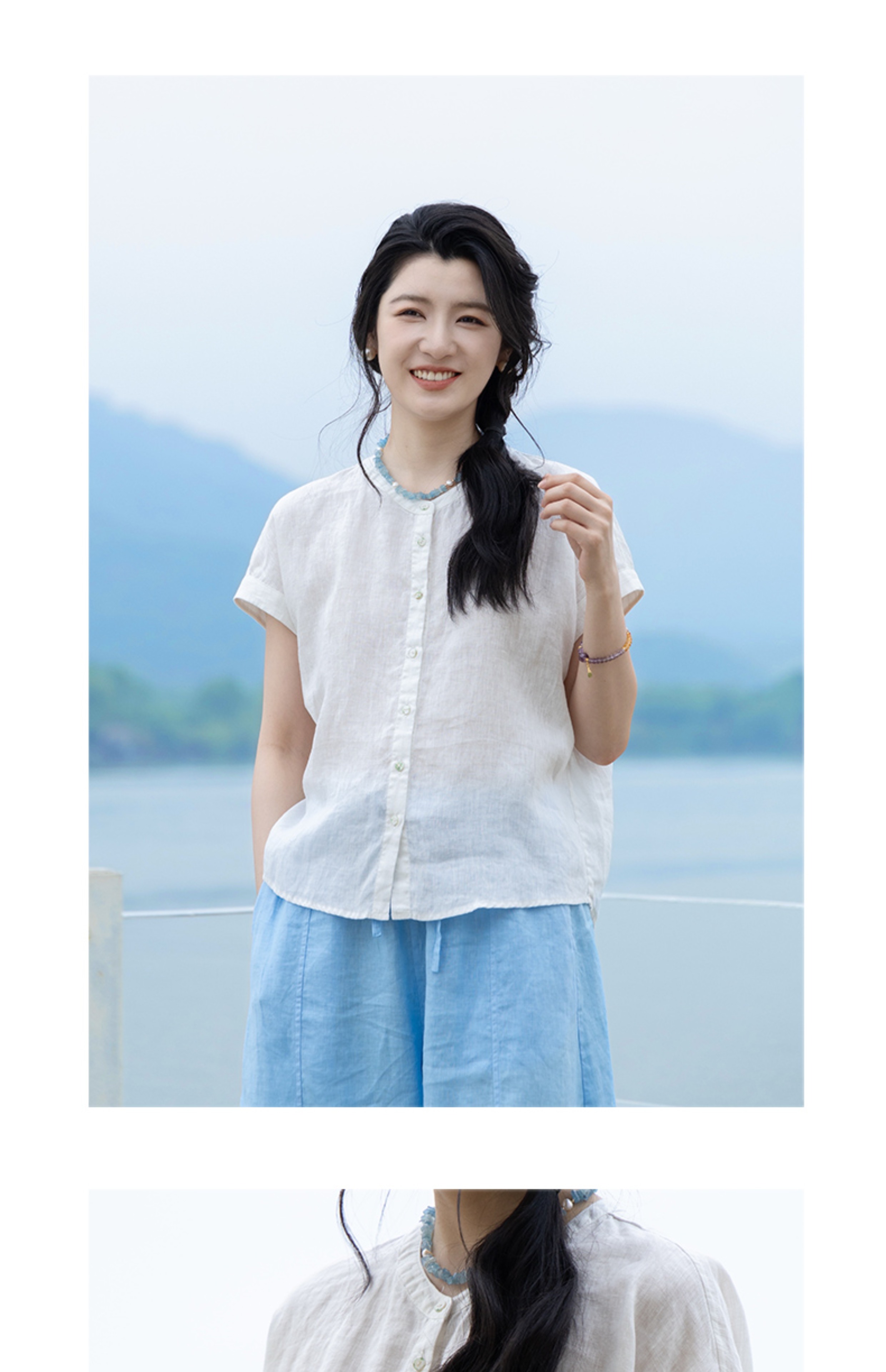 绽放旅行女装330朵/【海街日记】亚麻立领开襟连肩短袖衬衫松弛感