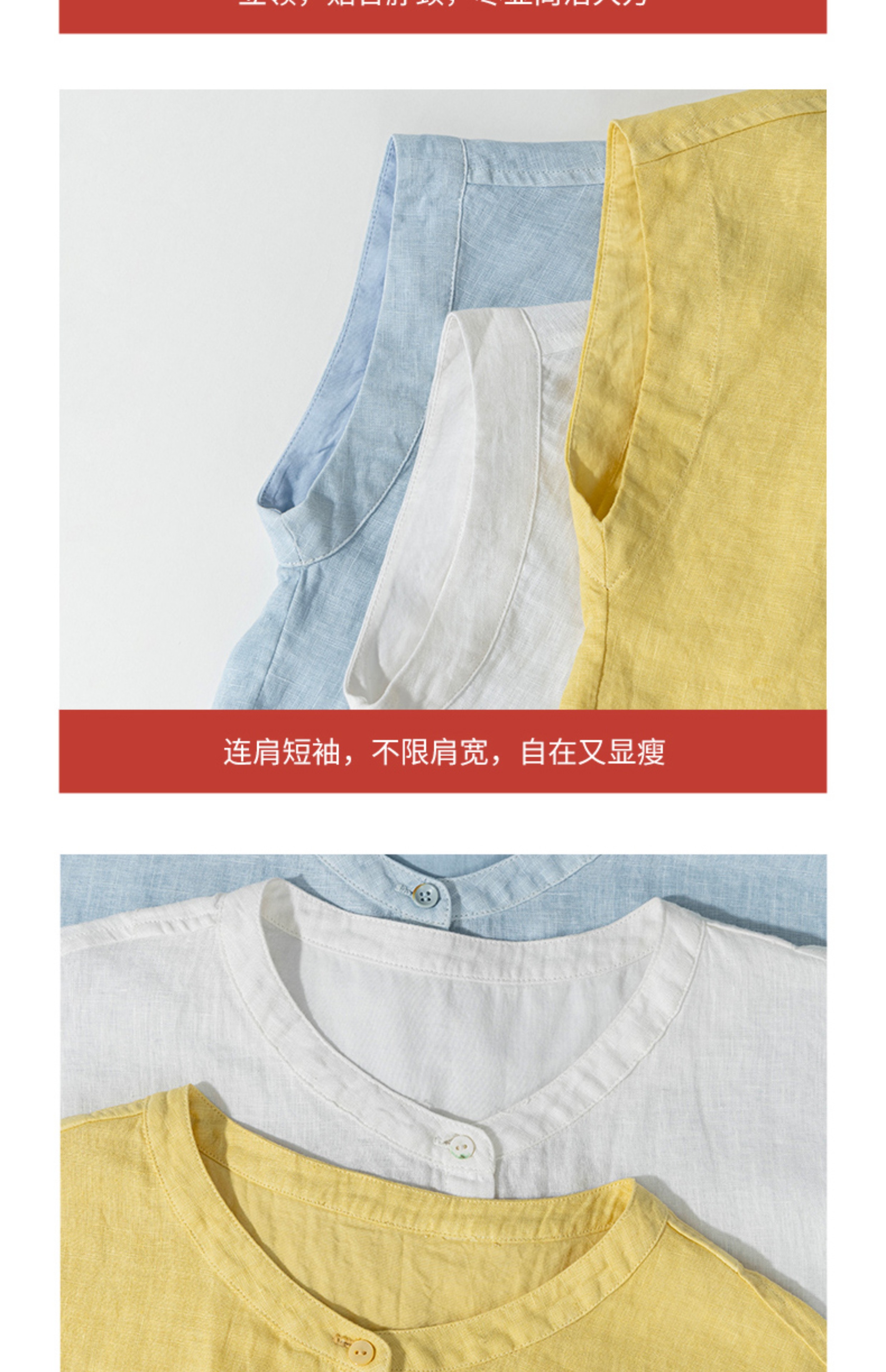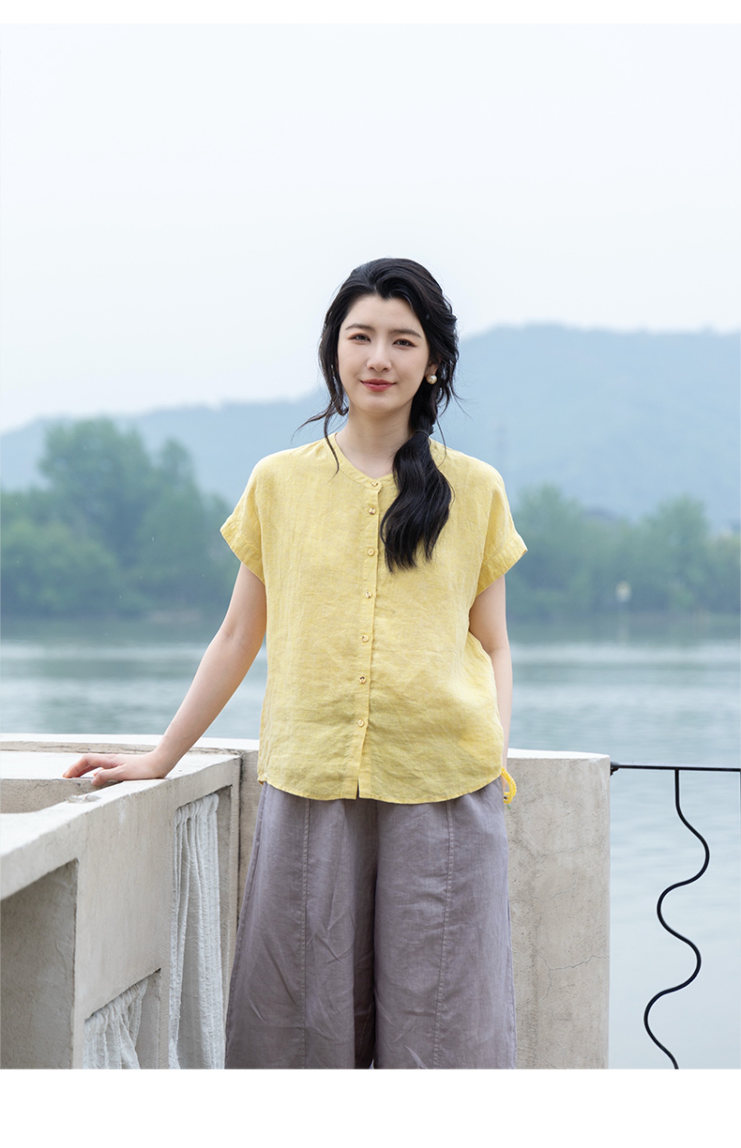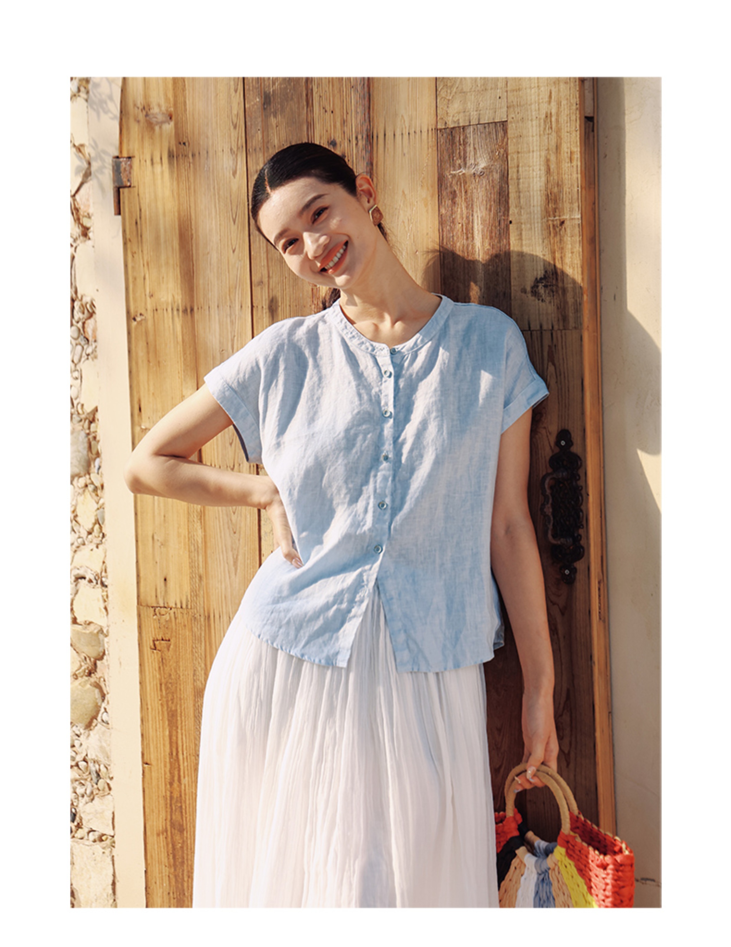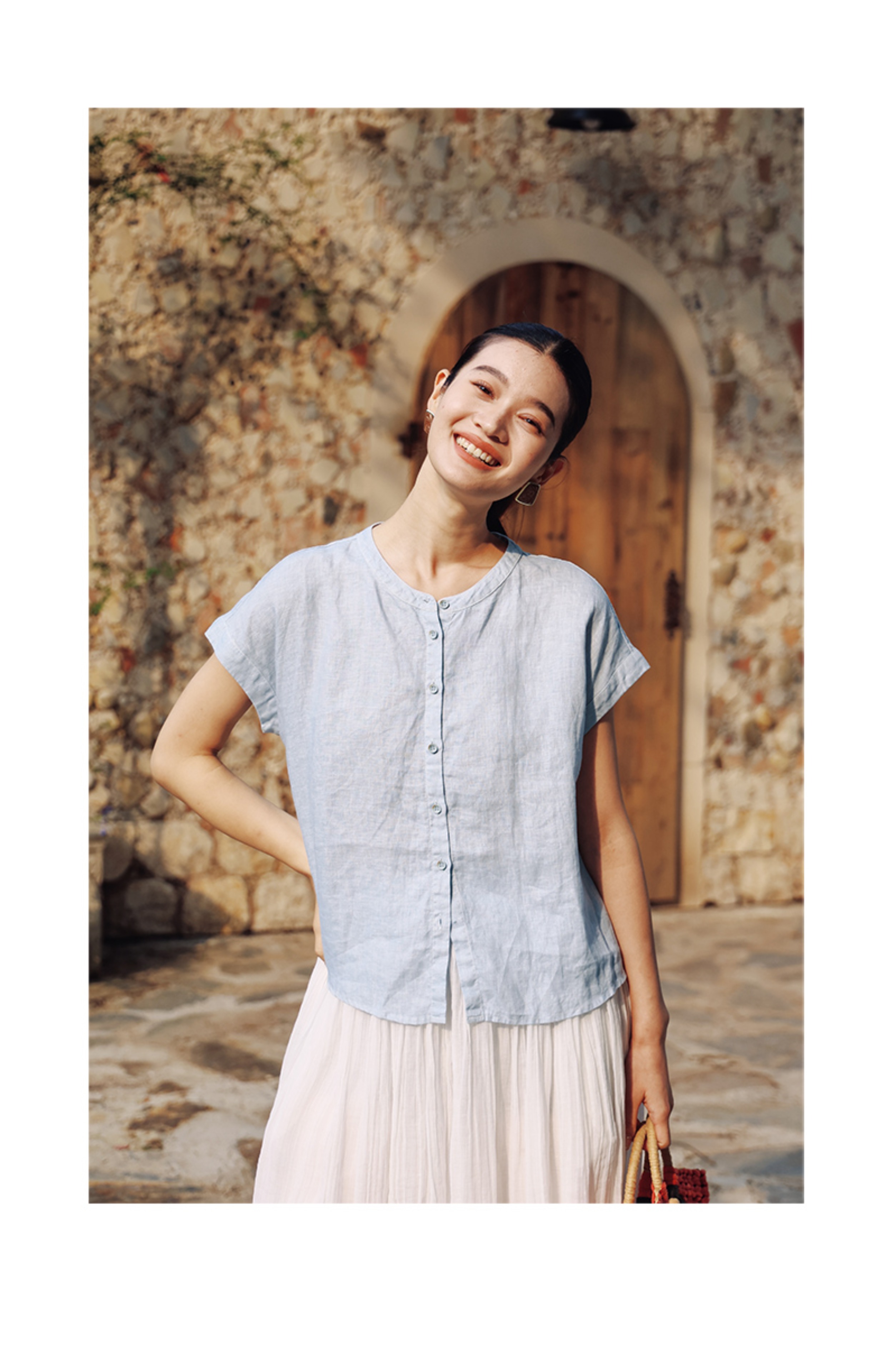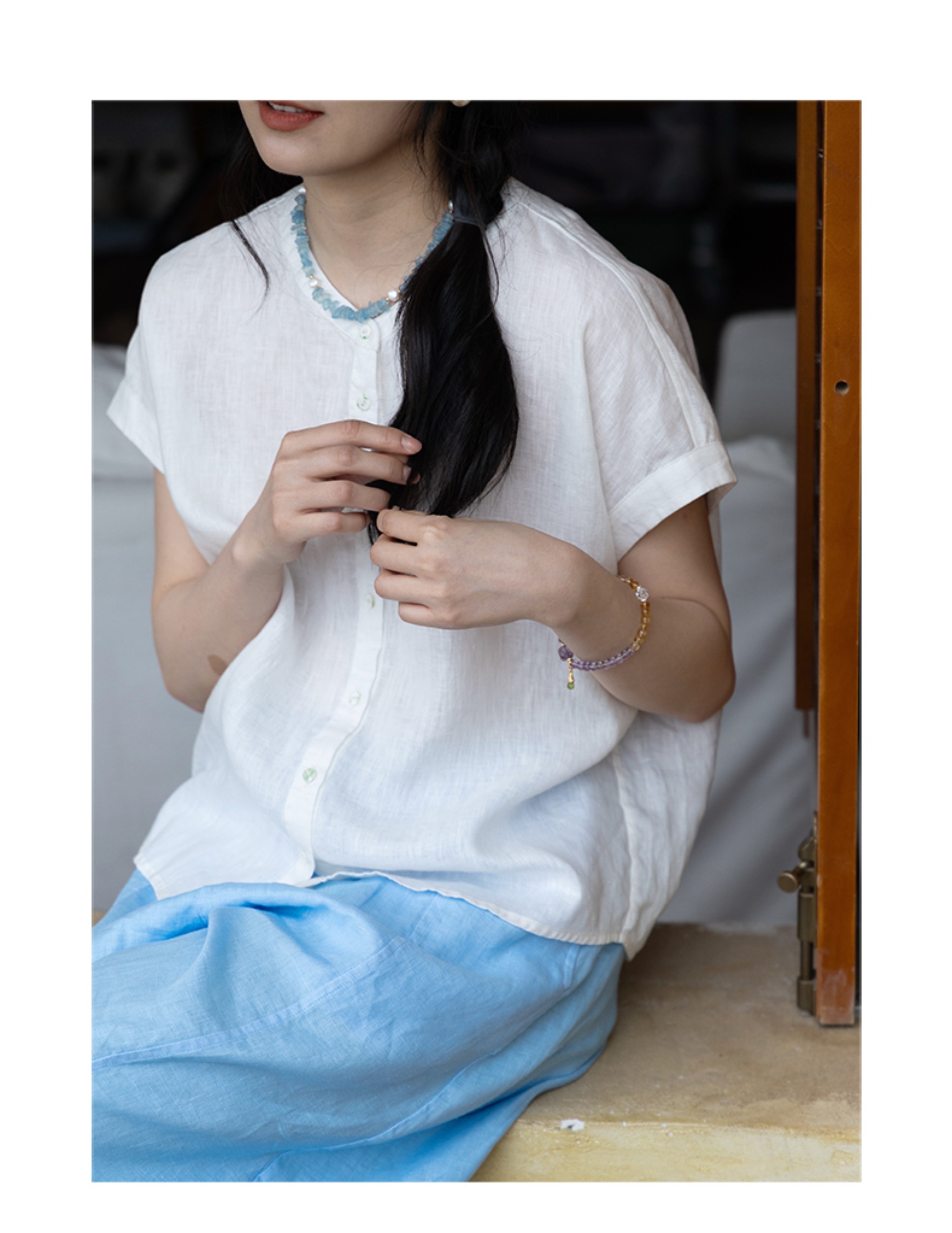 绽放旅行女装330朵/【海街日记】亚麻立领开襟连肩短袖衬衫松弛感