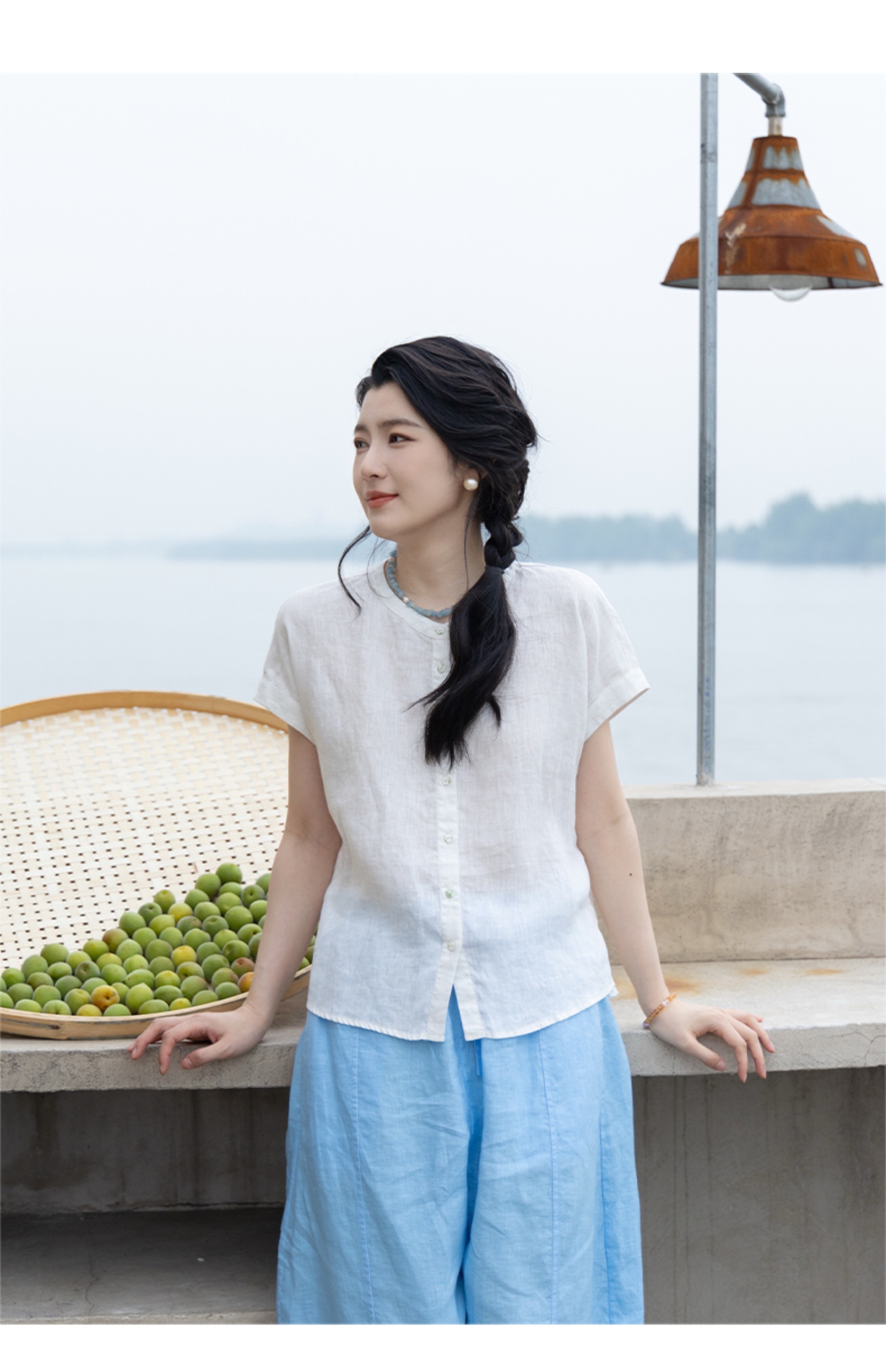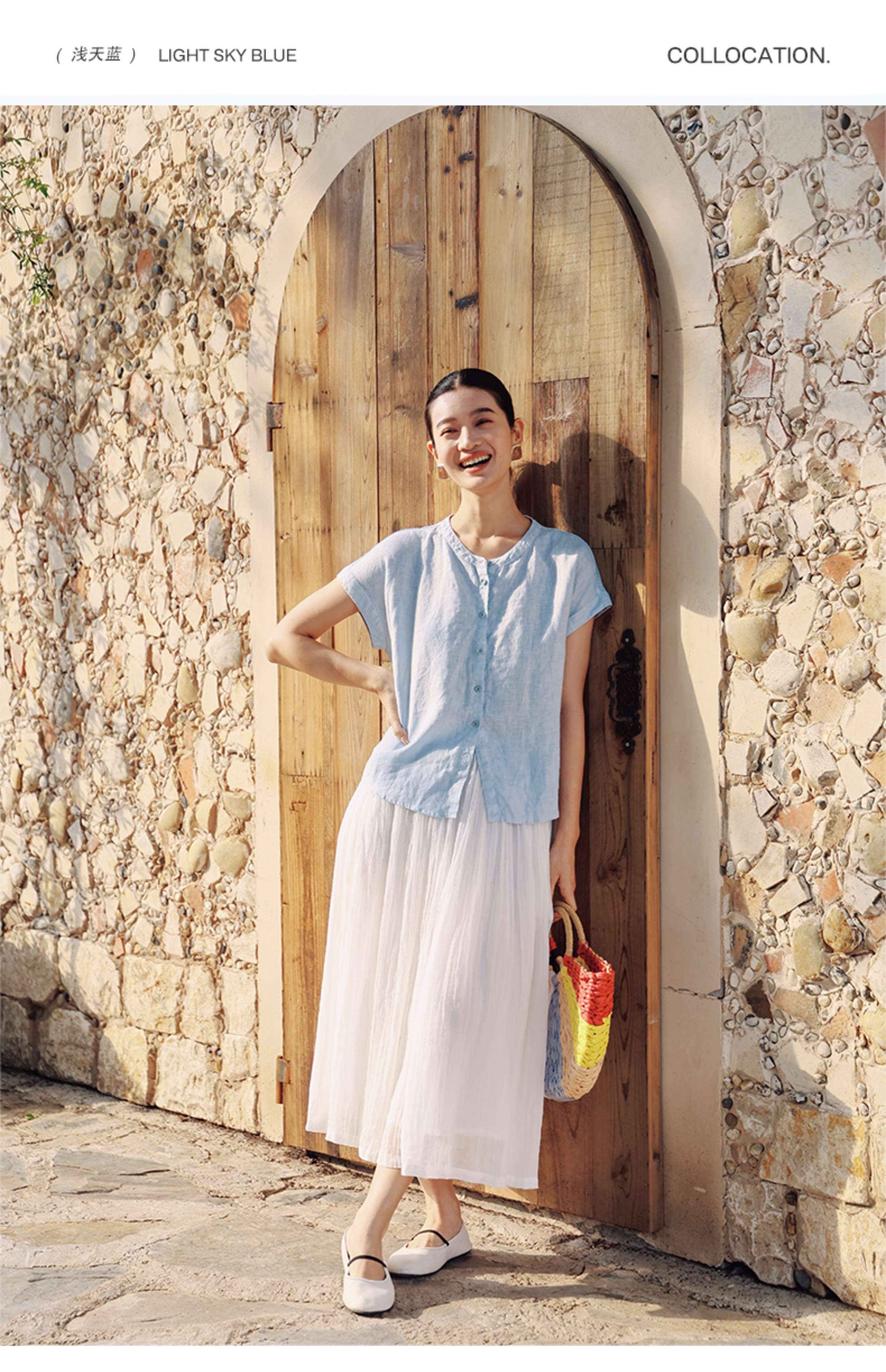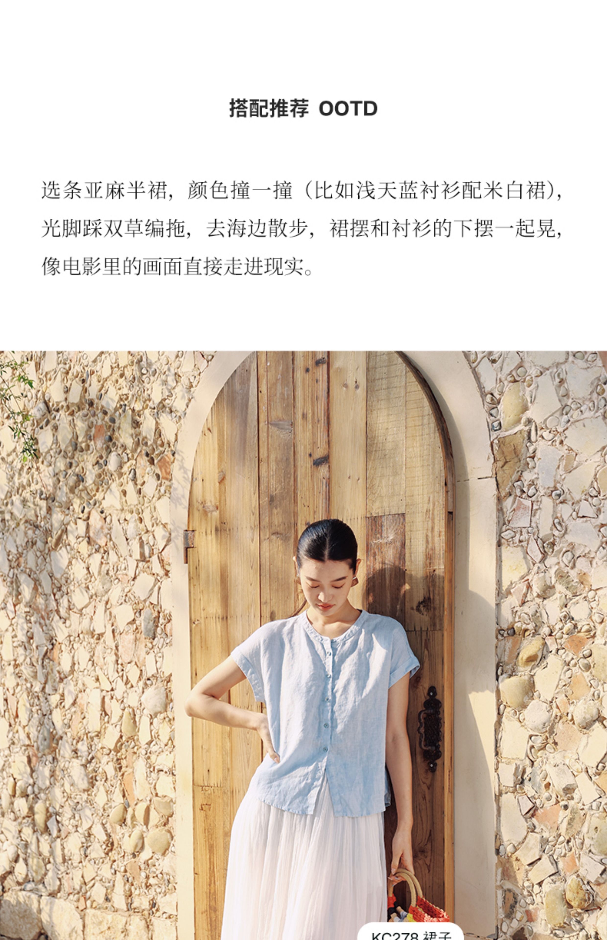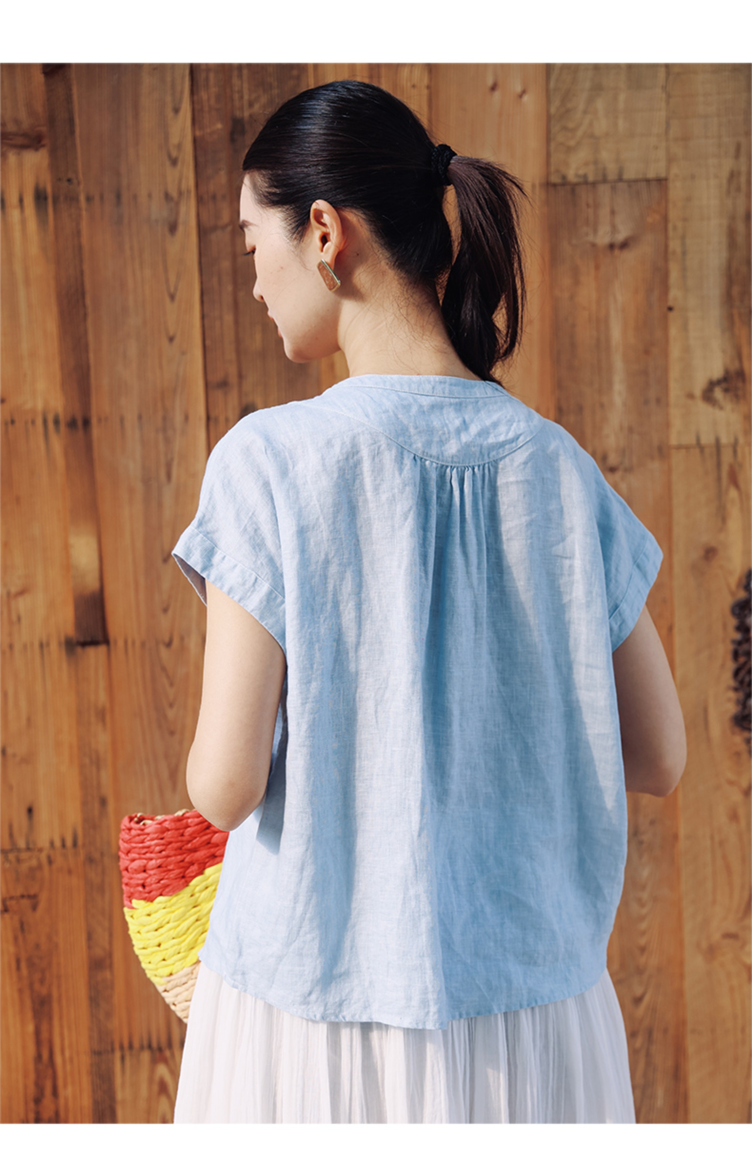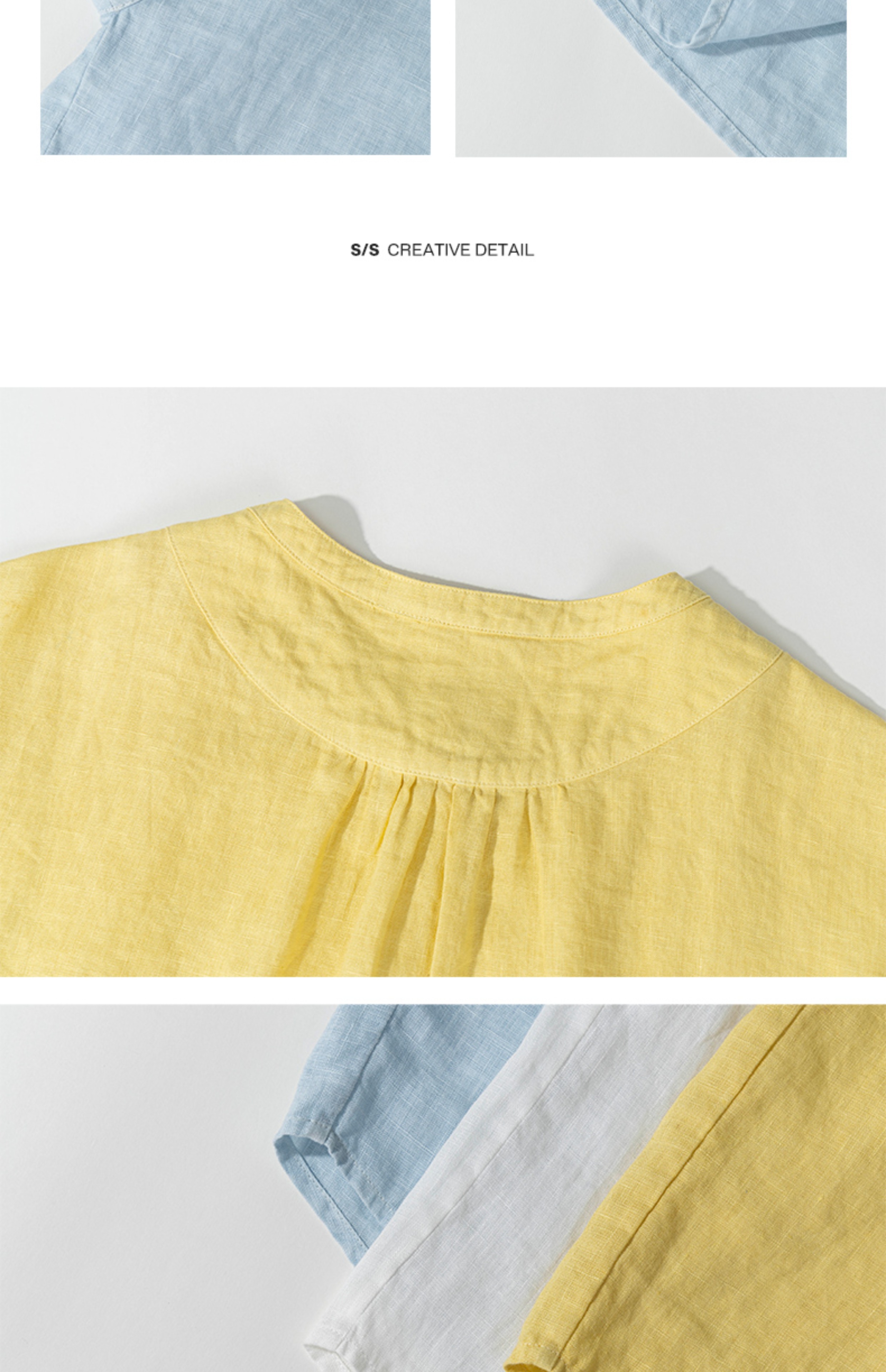 绽放旅行女装330朵/【海街日记】亚麻立领开襟连肩短袖衬衫松弛感