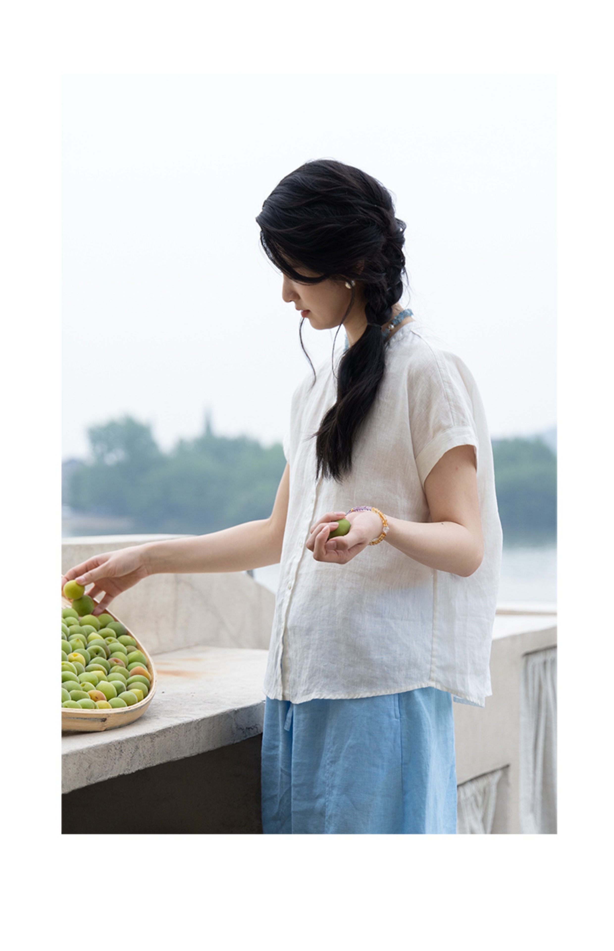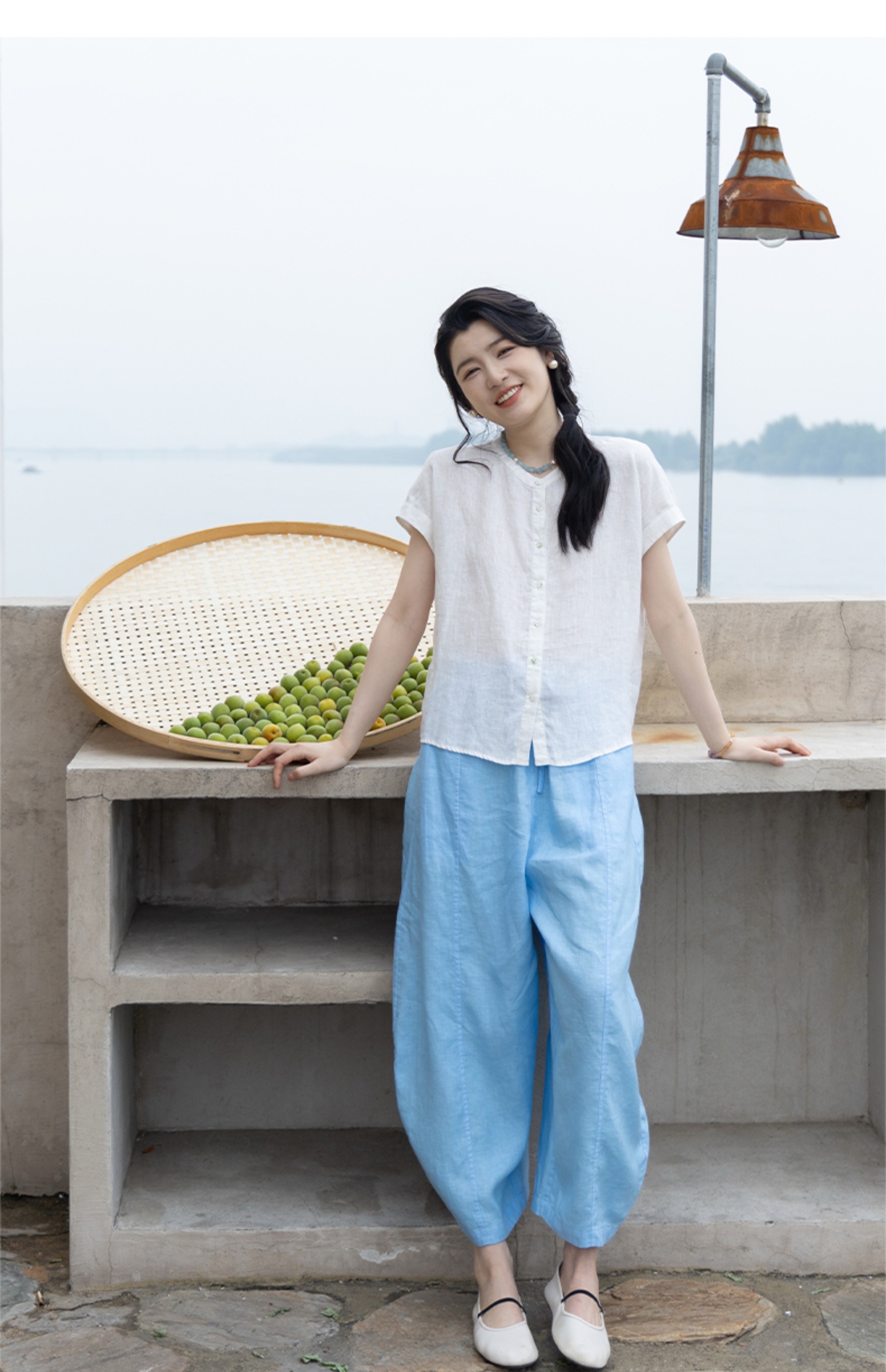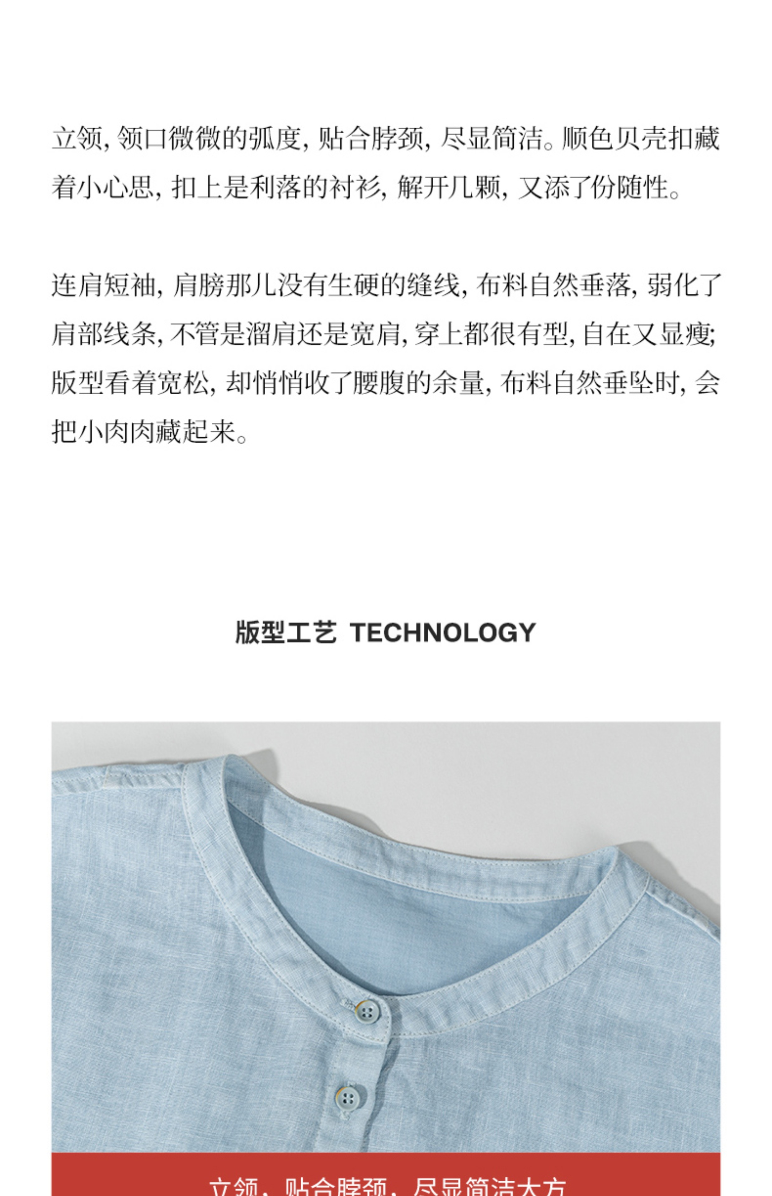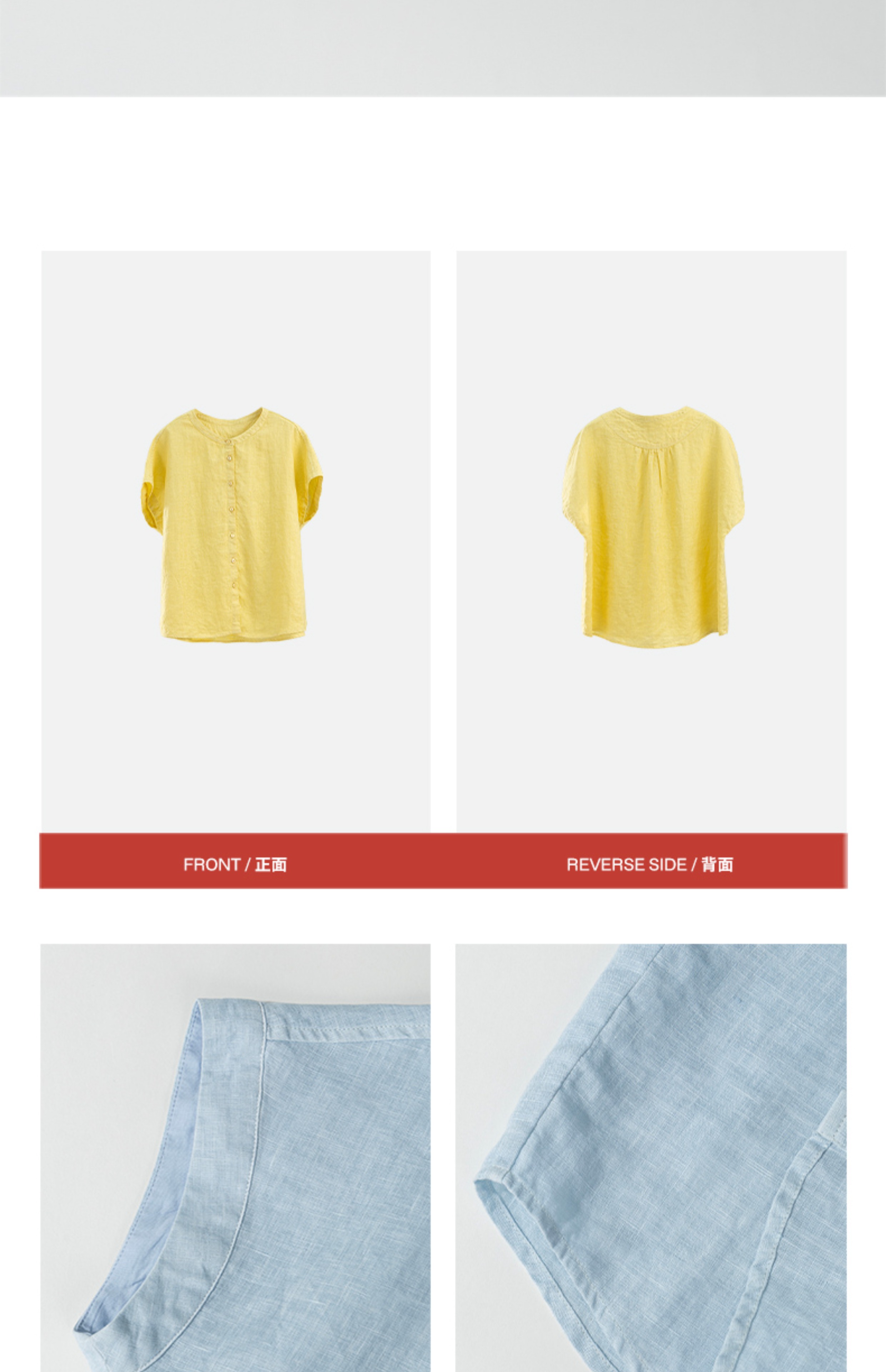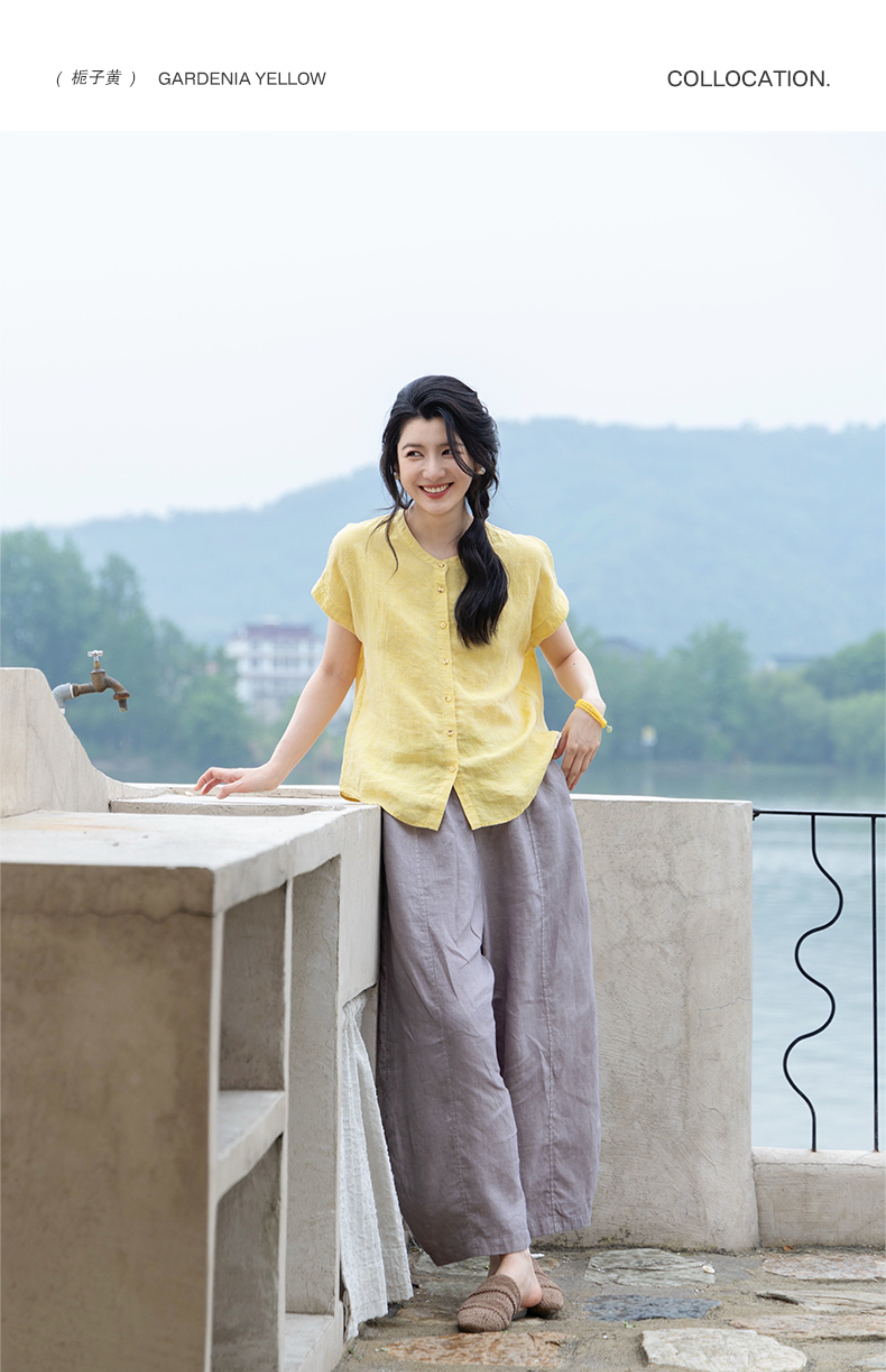 绽放旅行女装330朵/【海街日记】亚麻立领开襟连肩短袖衬衫松弛感