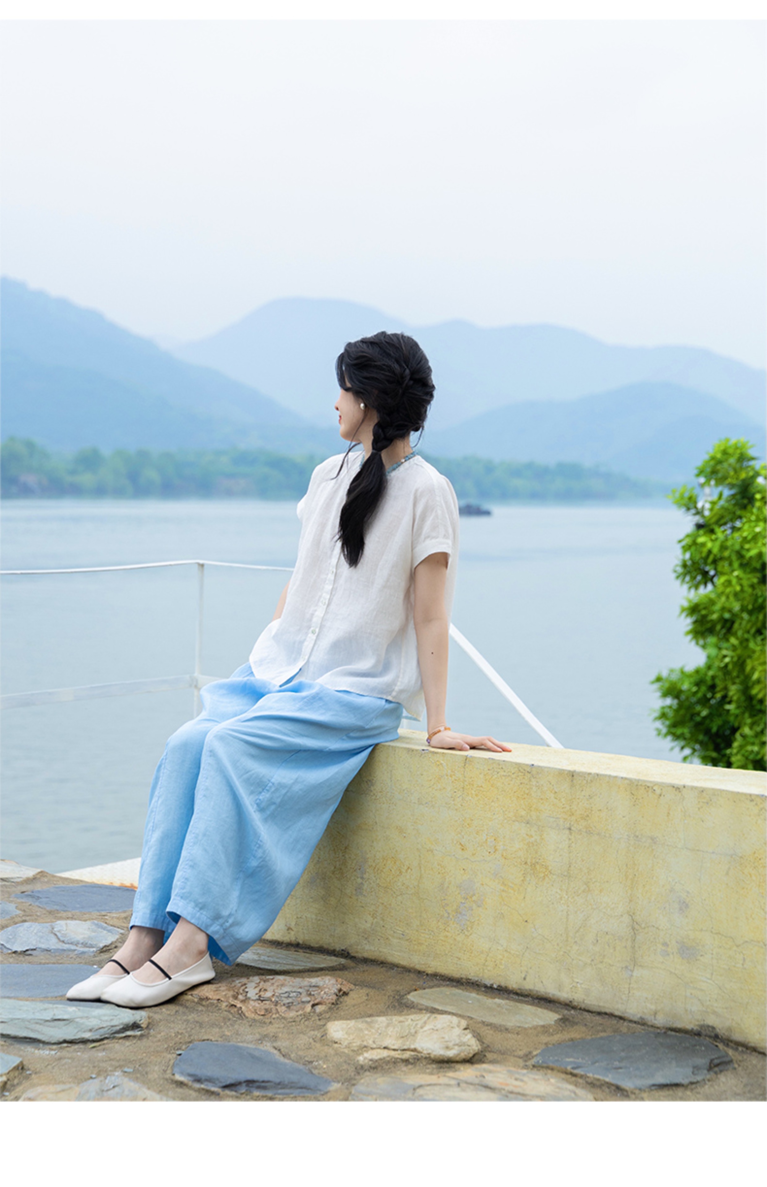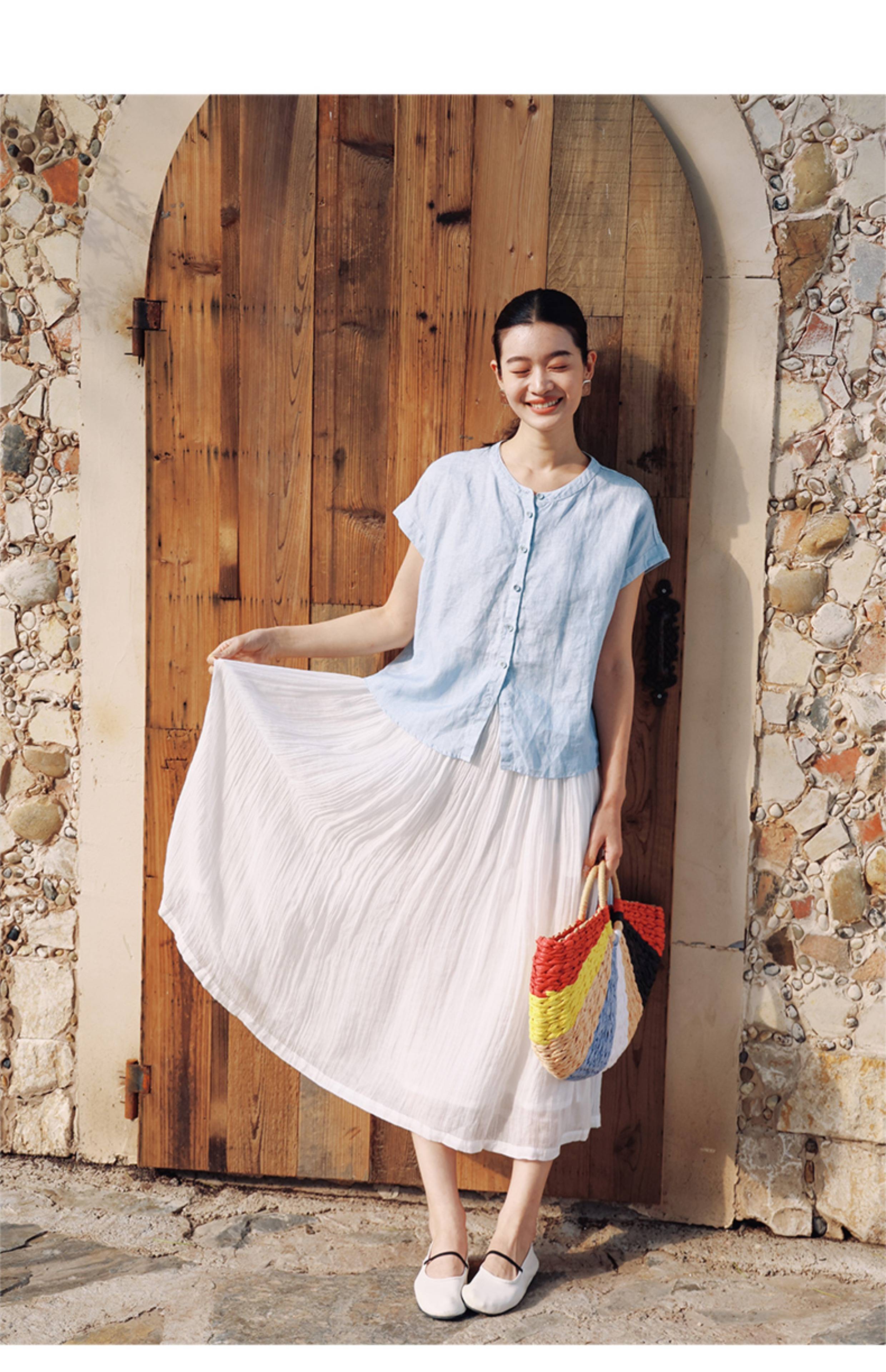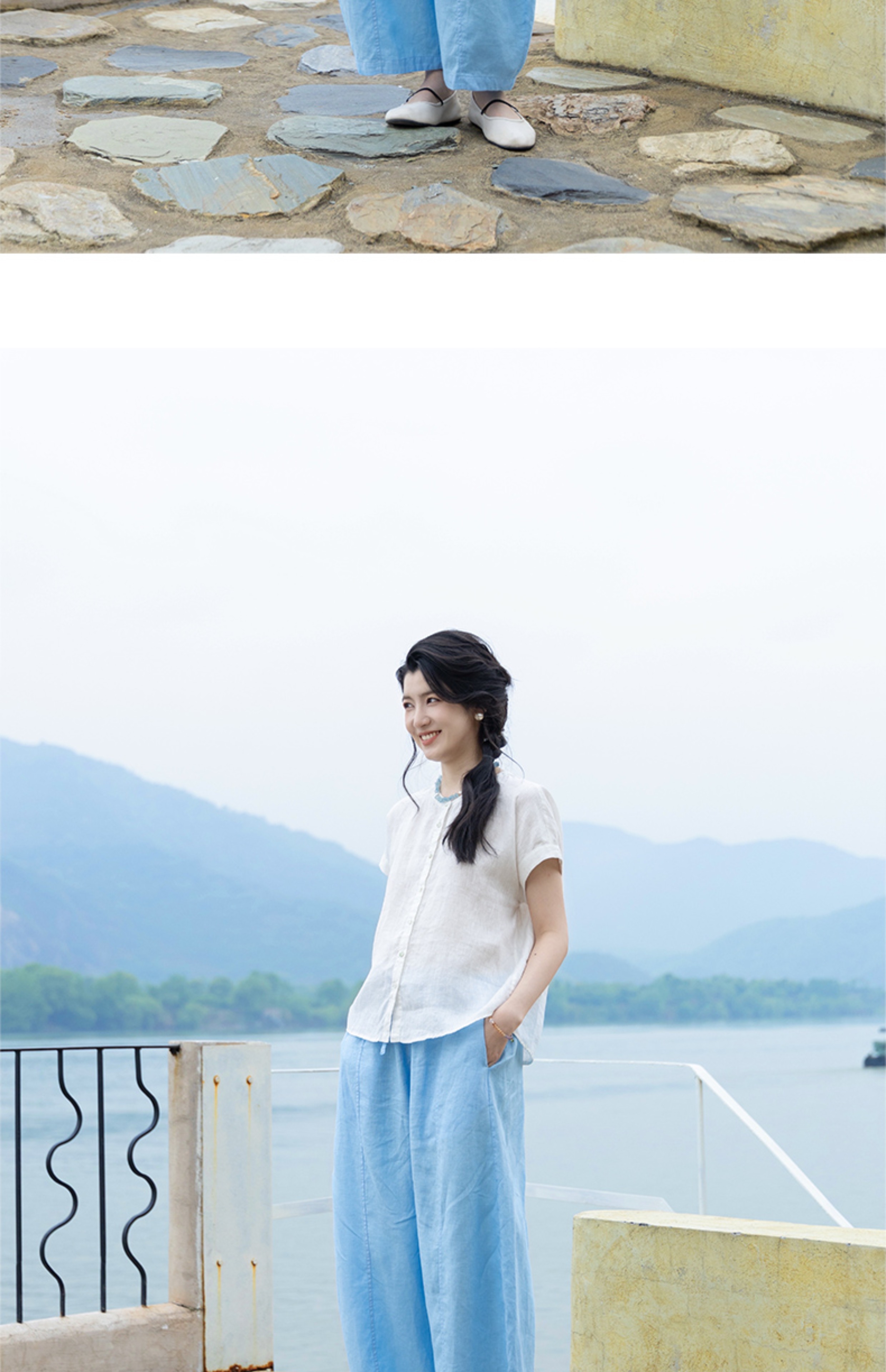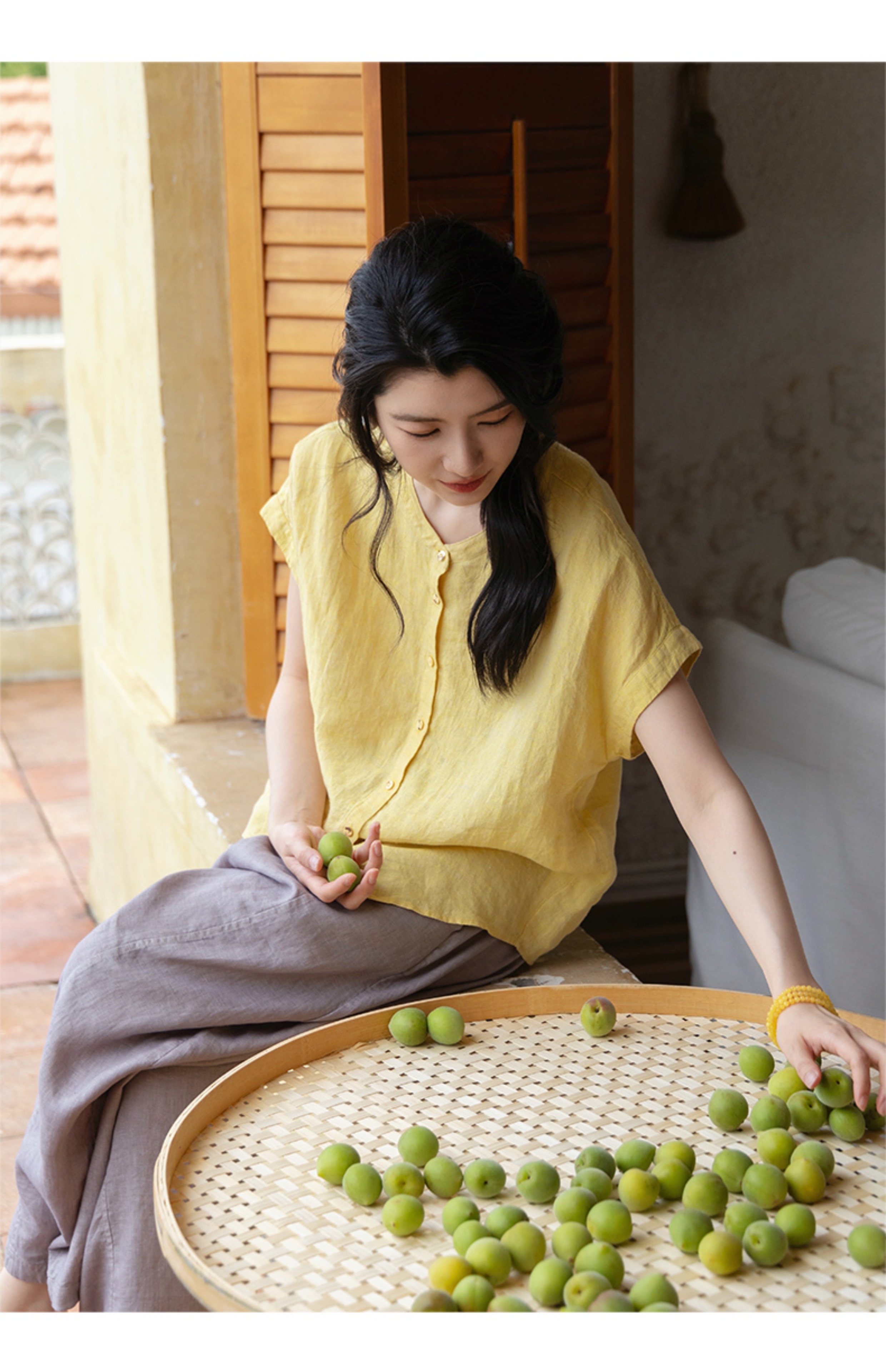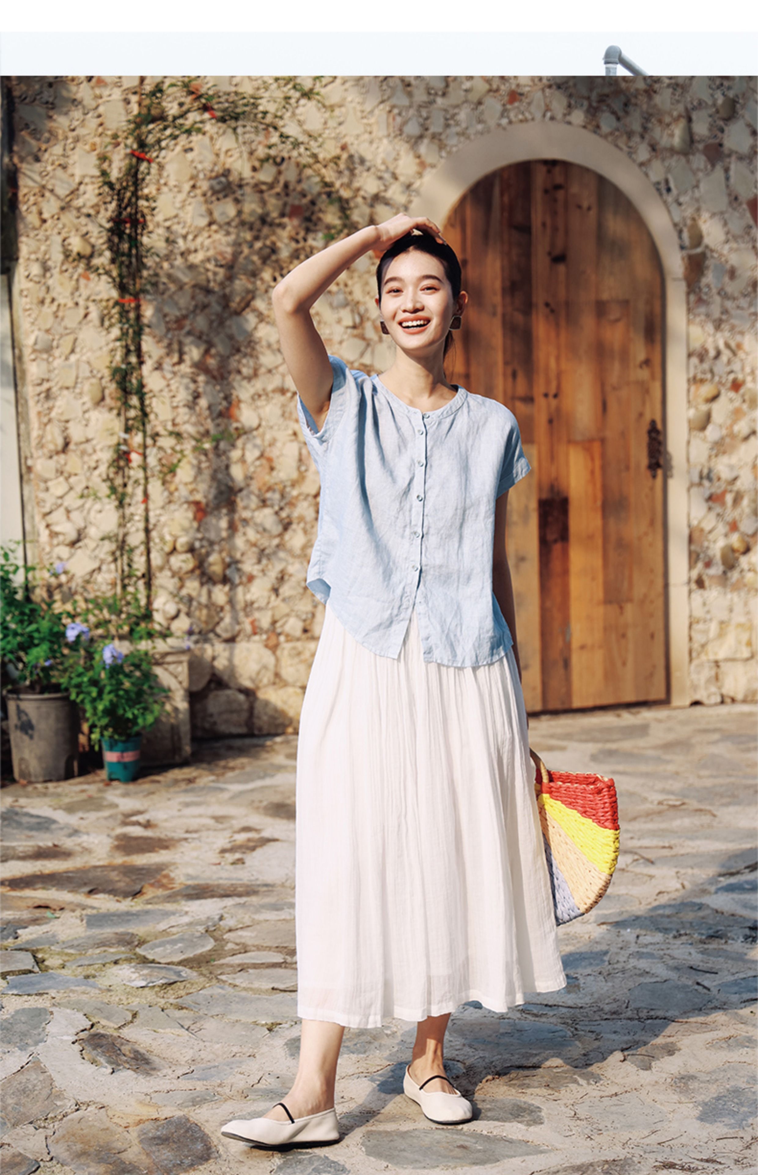 绽放旅行女装330朵/【海街日记】亚麻立领开襟连肩短袖衬衫松弛感