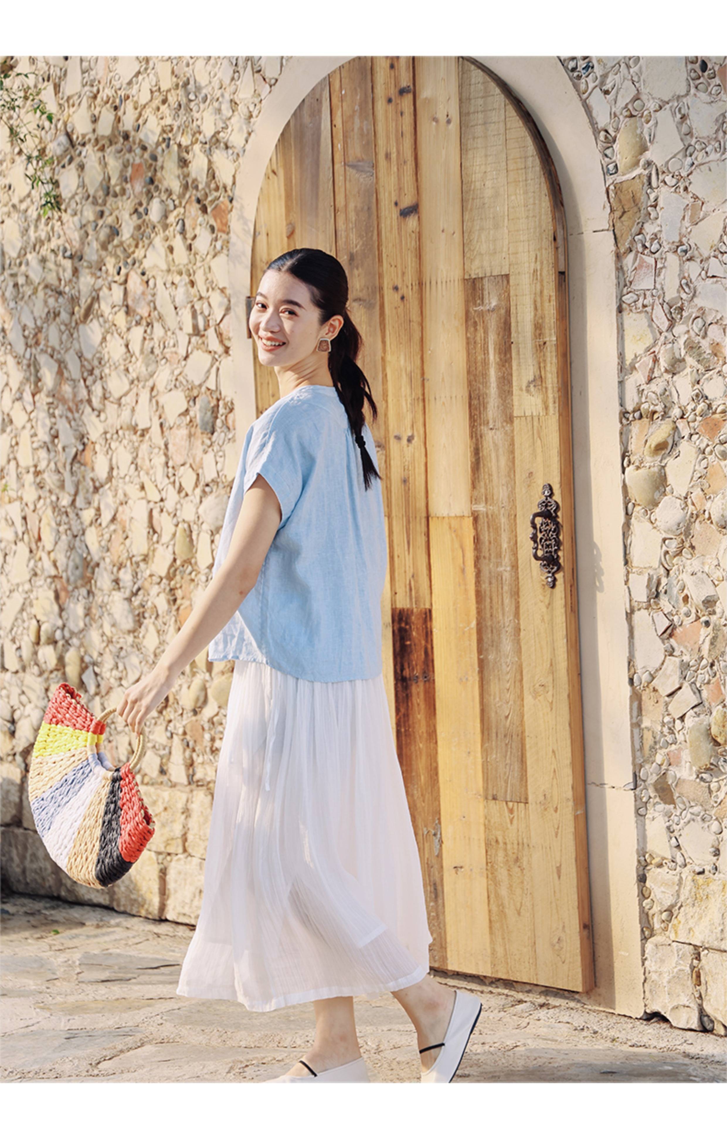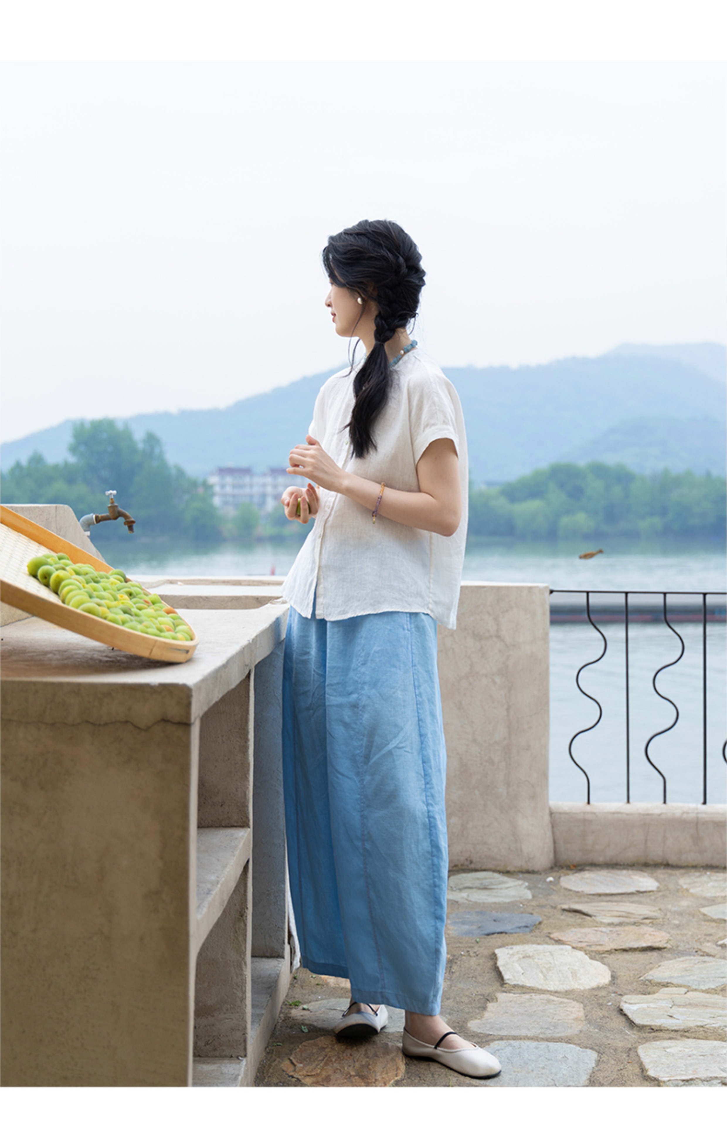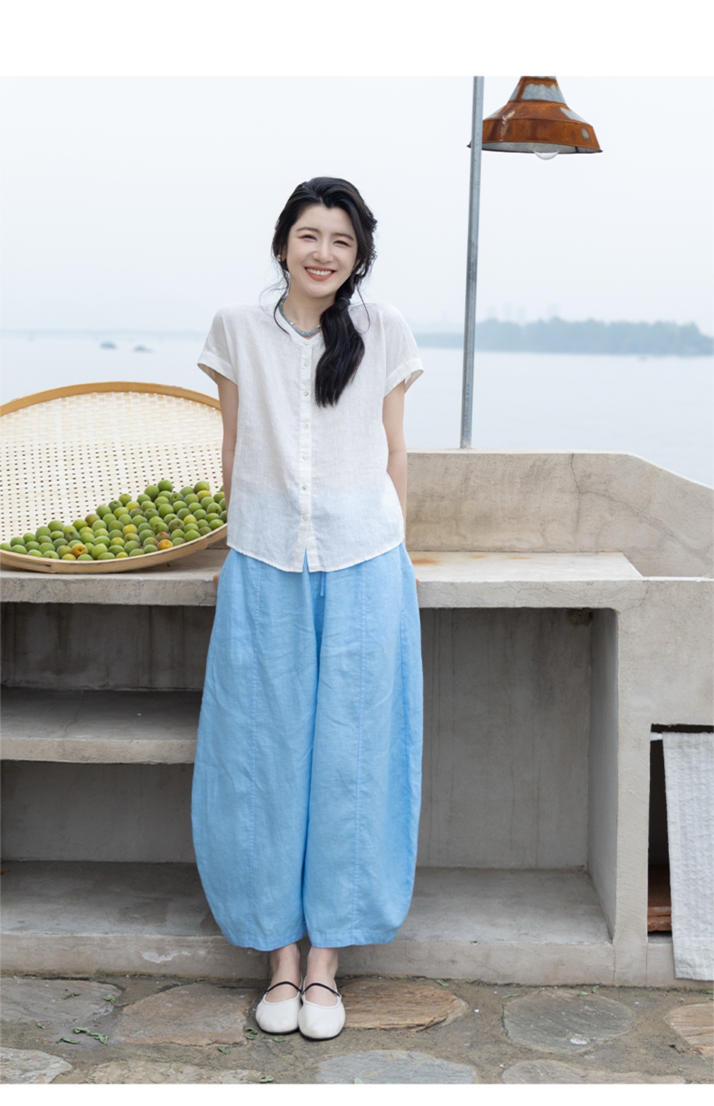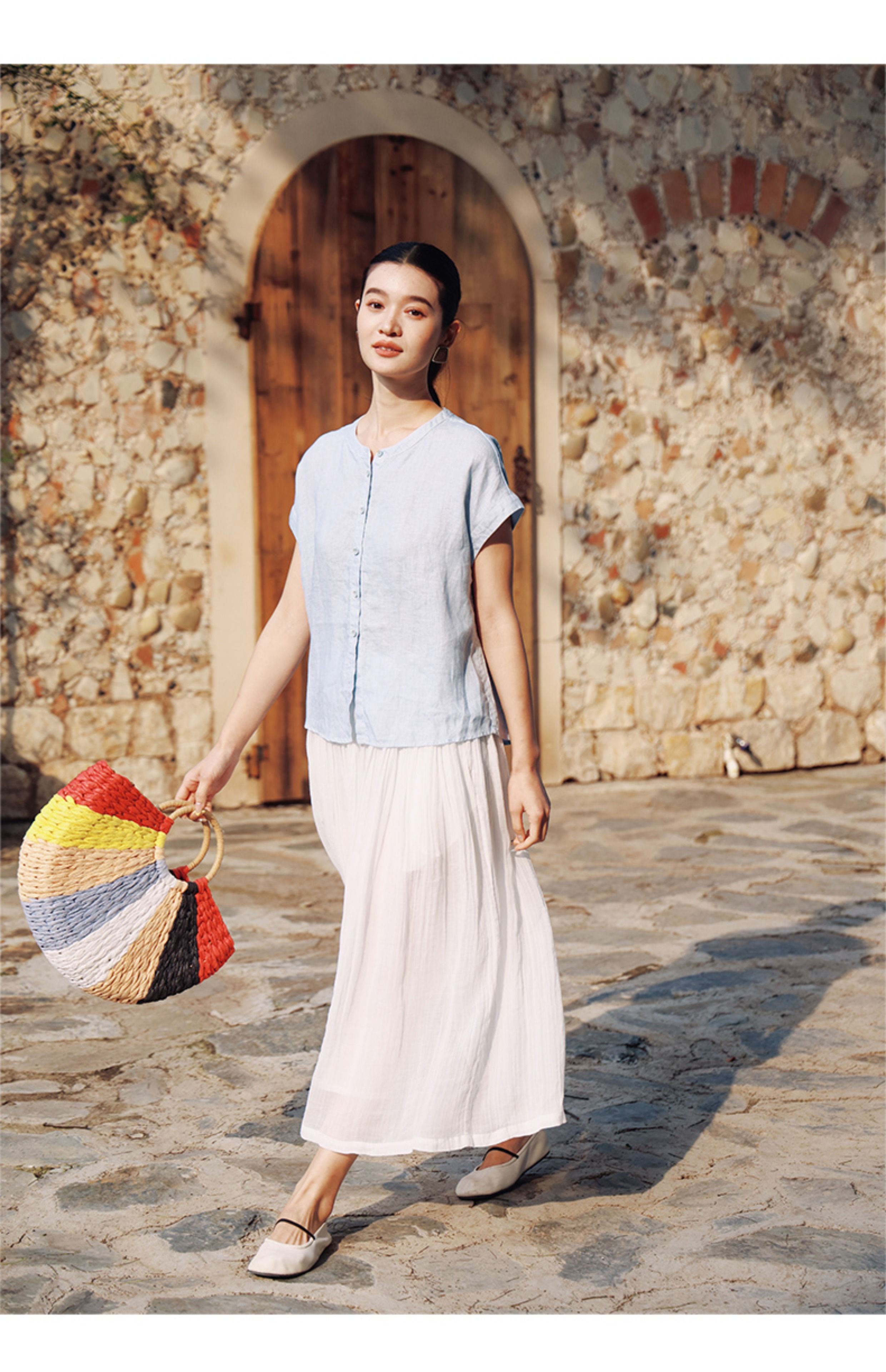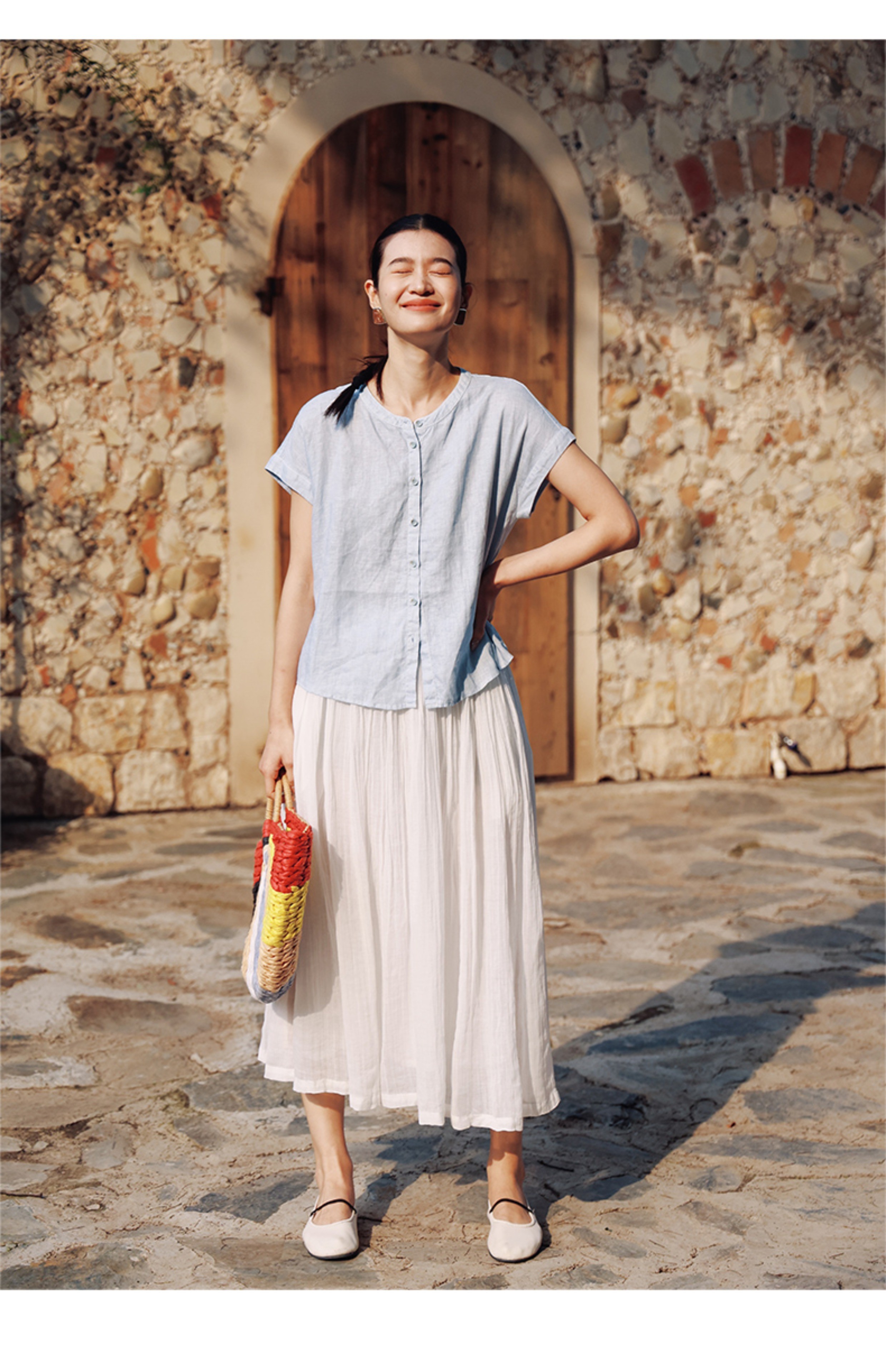 绽放旅行女装330朵/【海街日记】亚麻立领开襟连肩短袖衬衫松弛感
