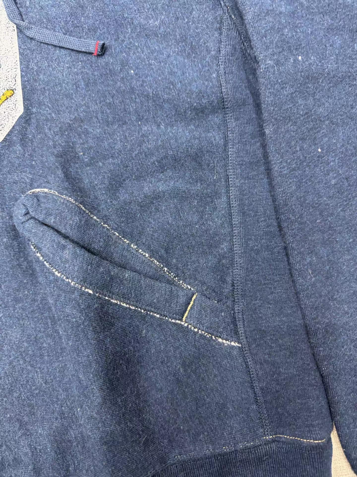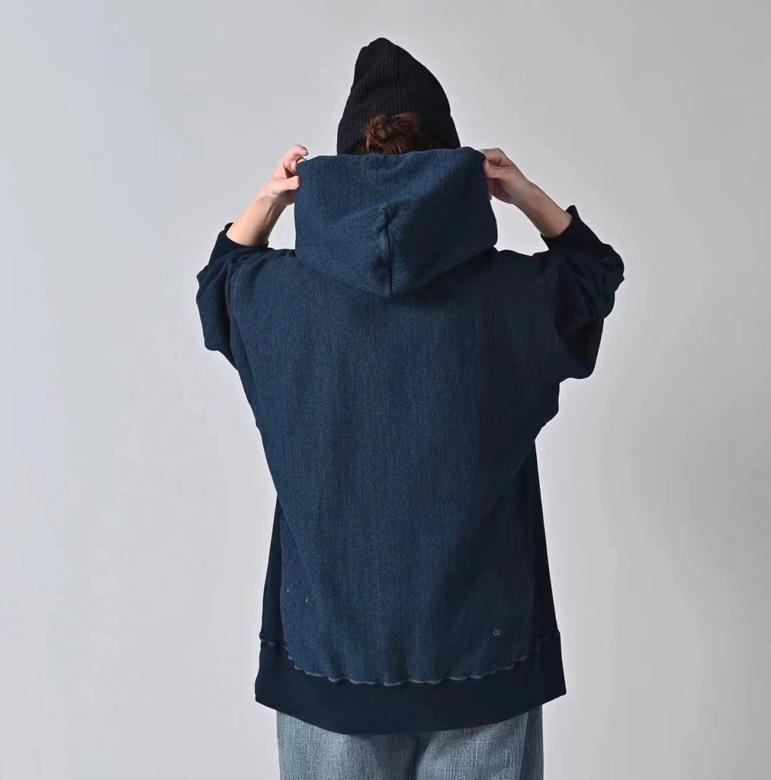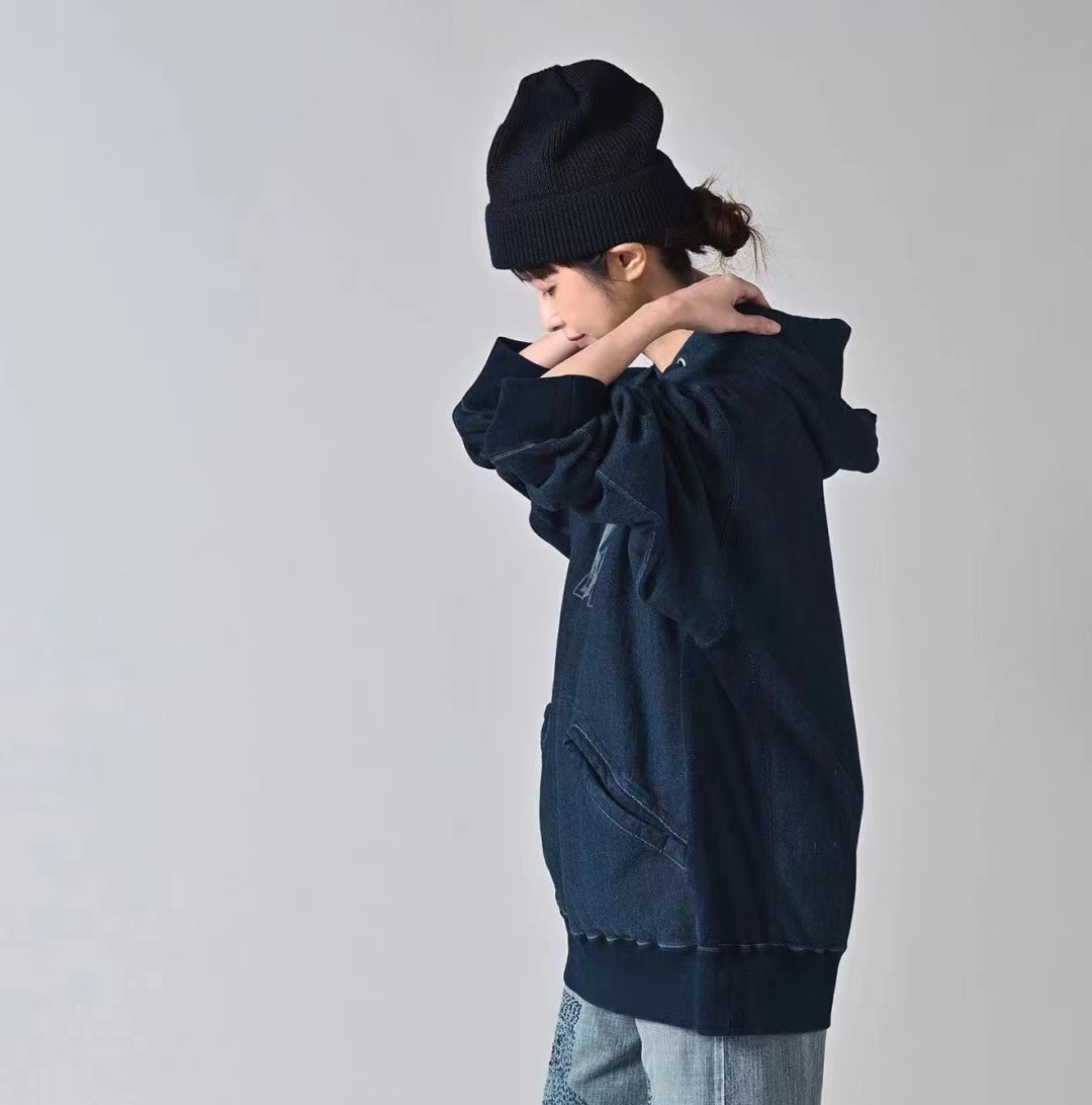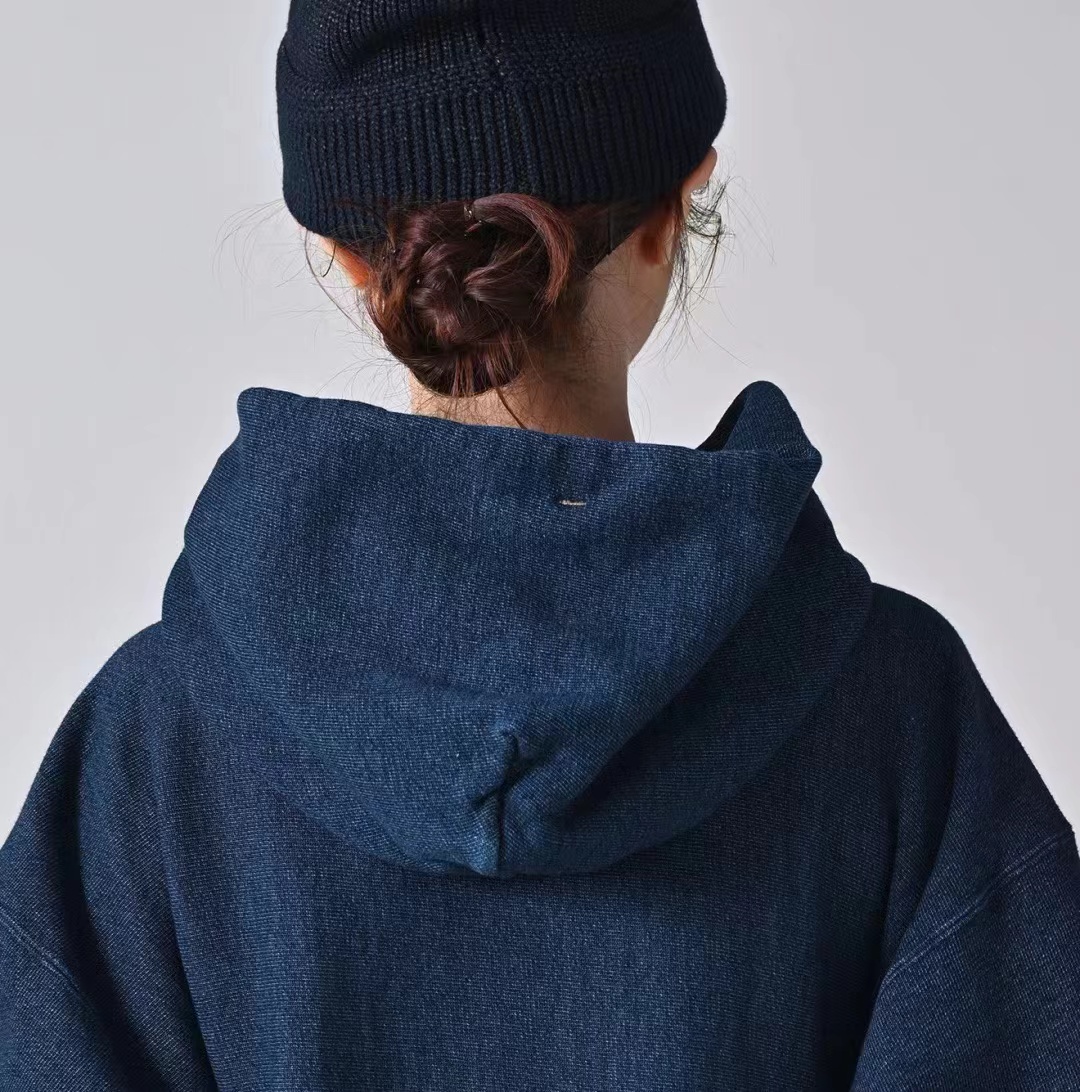 靛蓝吉它刺绣侧拼罗纹插兜连帽 原版靛蓝面料棉花和纺纱端定竹节+平纱+内圈3路混纺原版面料 特定机种织布 营造松弛感面料表面纹理 面料里侧微起绒 多次过水环烘后形成特有风格 配套双纱混纺微粗针罗纹 整体慵懒风+松弛感 侧拼罗纹 零缩率 可烘干 前后刺绣印花 后里侧印花刺绣