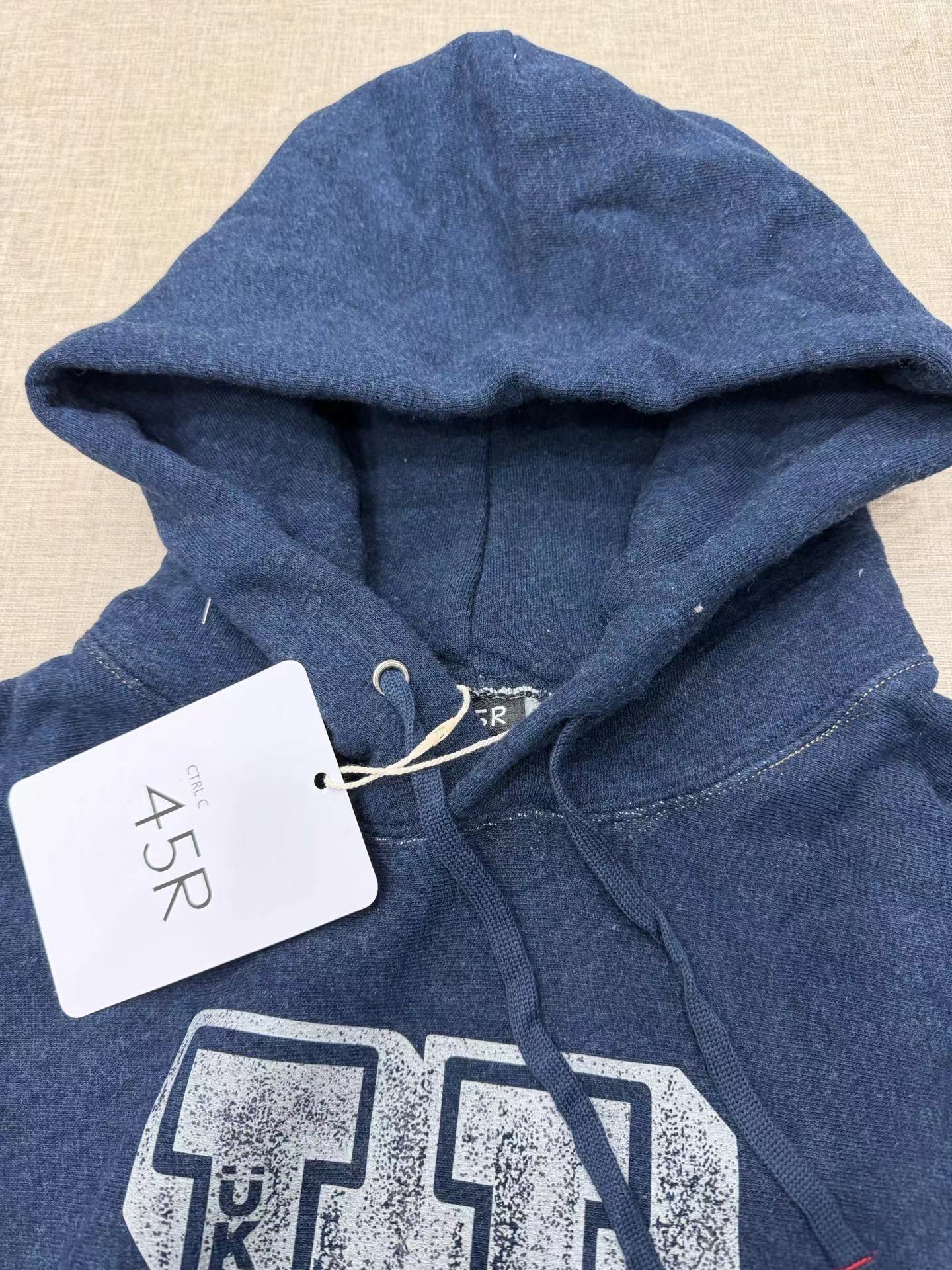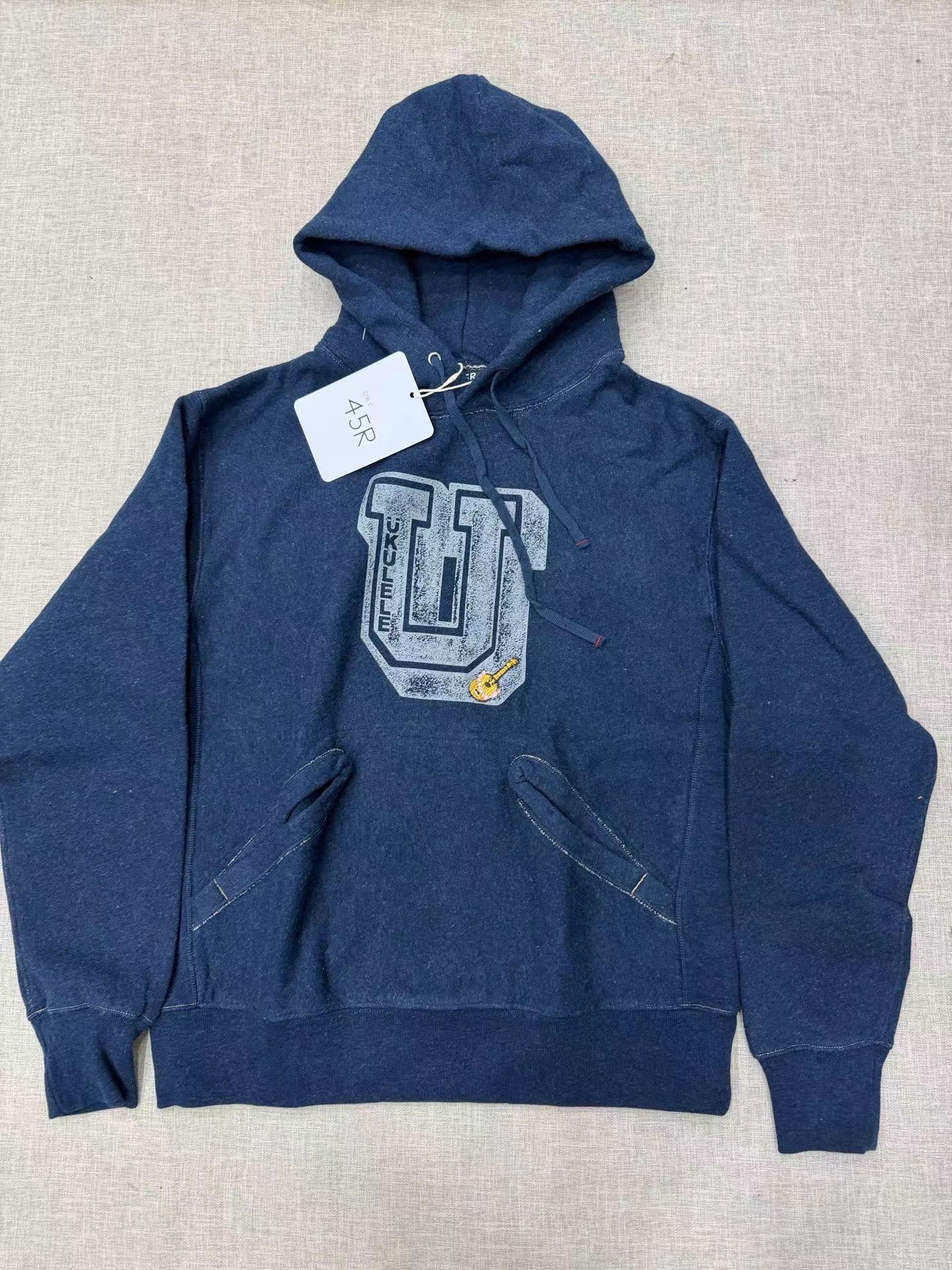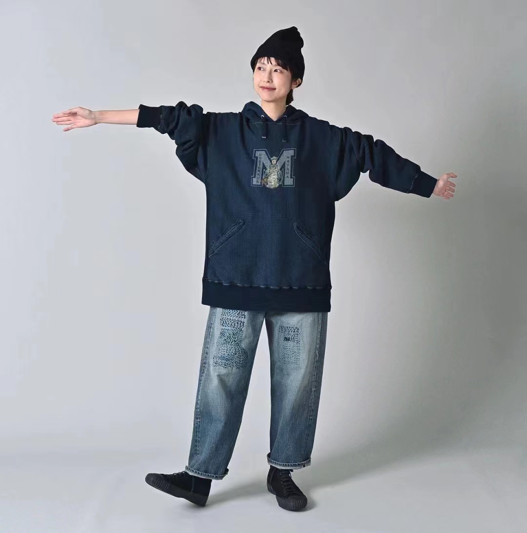 靛蓝吉它刺绣侧拼罗纹插兜连帽 原版靛蓝面料棉花和纺纱端定竹节+平纱+内圈3路混纺原版面料 特定机种织布 营造松弛感面料表面纹理 面料里侧微起绒 多次过水环烘后形成特有风格 配套双纱混纺微粗针罗纹 整体慵懒风+松弛感 侧拼罗纹 零缩率 可烘干 前后刺绣印花 后里侧印花刺绣