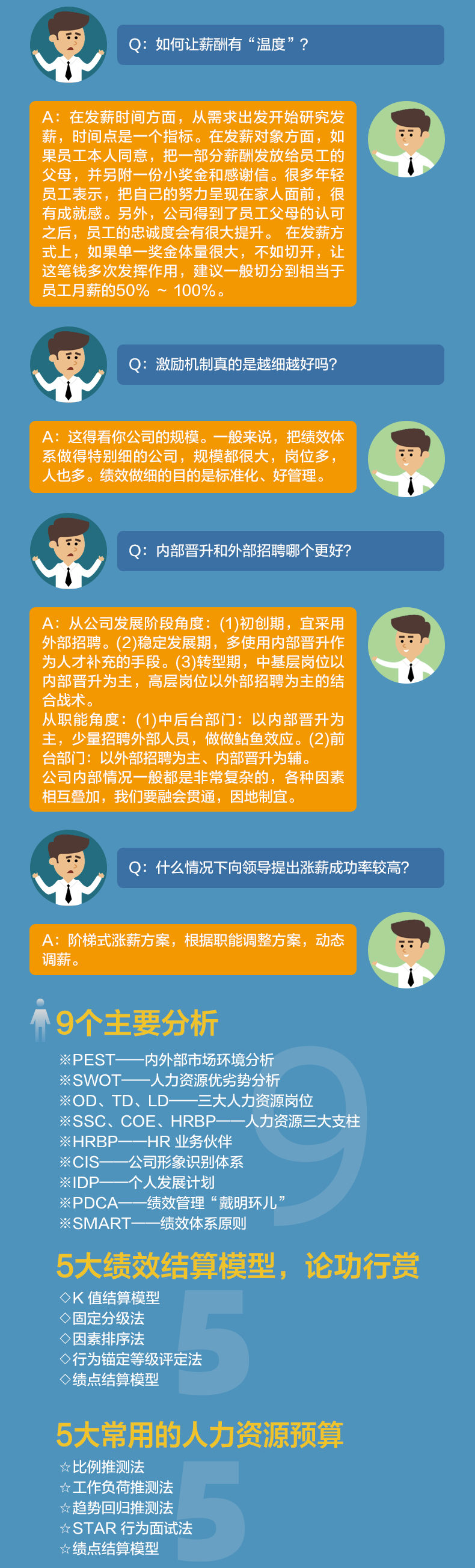 开篇:震惊!居然还有人相信密薪制! 第1章 组织构架的那些事 1.1 年轻人适合什么样的职级体系? 1.2 公司岗位价值是怎么评定的? 1.3 职能序列怎么才能分得有艺术? 1.4 跨部门合作怎么才能顺畅? 1.5 写个岗位说明书有什么难的! 第2章 关于薪酬的那些事 029 2.1 原来薪酬是由这些部分组成的 2.2 你知道你的薪酬是怎么定的吗? 2.3 薪酬体系设计真的很简单! 2.4 你是什么素质啊?论员工的能力素质模型 2.5 教你做一个让领导鼓掌的公司薪酬分析 2.6 论双胞胎—福利和补贴的区别 2.7 市场薪酬调研怎么做? 2.8 薪酬的外部竞争力和内部公平性 2.9 新老员工倒挂,该怎么做才能维持员工稳定? 2.10 为什么你调个薪,员工都没什么反应? 2.11 如何合理拖欠工资—什么是薪酬递延支付? 2.12 论薪酬的双重性—薪酬性和非薪酬性 2.13 如何让薪酬有“温度”? 第 3章 关于绩效的那些事 3.1 透视绩效的核心 3.2 如何搭建KPI和OKR绩效体系? 3.3 论功行赏—绩效结算模型都有哪些? 3.4 绩效体系的SMART原则聪明吗? 3.5 绩效管理的PDCA循环 3.6 常用的绩效考核指标汇总 3.7 平衡计分卡到底好用吗? 3.8 360评测怎么做? 3.9 激励机制真的是越细越好吗? 3.10 绩效沟通要重视 3.11 绩效结果的隐藏应用—个人发展计划 3.12 令人厌恶的激励方式 3.13 负激励只能罚款吗? 3.14 富人的烦恼—股权激励的优缺点 3.15 富人的玩具—股权激励的设计流程 3.16 有趣的虚拟股权 第 4章 员工吸引与保留 4.1 如何好好面试一个应聘者? 4.2 全方位心理战—面试的技巧 4.3 内部晋升和外部招聘哪个更好? 4.4 公司文化仅仅是一句口号吗? 4.5 如何将公司文化融入公司的日常管理? 4.6 公司文化的对外输出 4.7 你真的了解福利吗? 4.8 讲一个很好的员工关怀案例 4.9 如何确定一个诱人的培训计划? 4.10 最重要的培训项目—新员工培训 第 5章 人力资源的规划与管理 5.1 人力资源的工作重点是什么?别费力不讨好 5.2 浅谈人力资源三大支柱 5.3 “3D”介绍—OD、TD、LD 5.4 领导让你做人力资源战略规划怎么办? 5.5 论一个优秀的人力资源预算之养成 5.6 什么情况下向领导提出涨薪成功率较高? 5.7 为什么员工对薪酬改革很抗拒? |