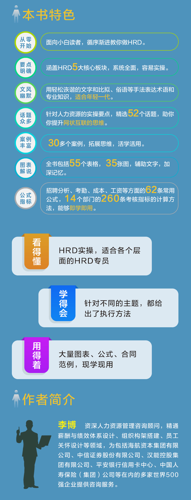 从零开始:面向小白读者,循序渐进教你做HRD。 要点明确:涵盖HRD五大核心板块,系统全面,容易实操。 文风幽默:用轻松诙谐的文字和比拟、俗语等手法表达术语和专业知识,适合年轻一代。 话题众多:针对人力资源的实操要点,精选52个话题,助你你提升网状互联的思维。 案例丰富:30多个案例,拓展思维,活学活用。 图表解说:全书包括55个表格 + 35张图,辅助文字,加深你的记忆。 公式指标:招聘分析、考勤、成本、工资等方面的62条常用公式 + 14个部门的260条考核指标的计算方法,能够即学即用。 |