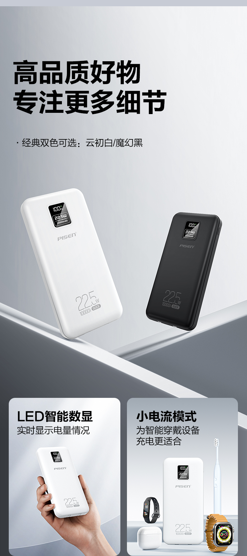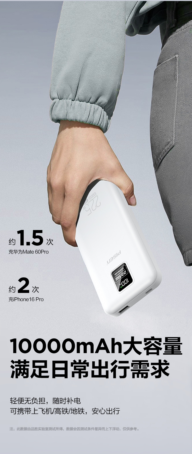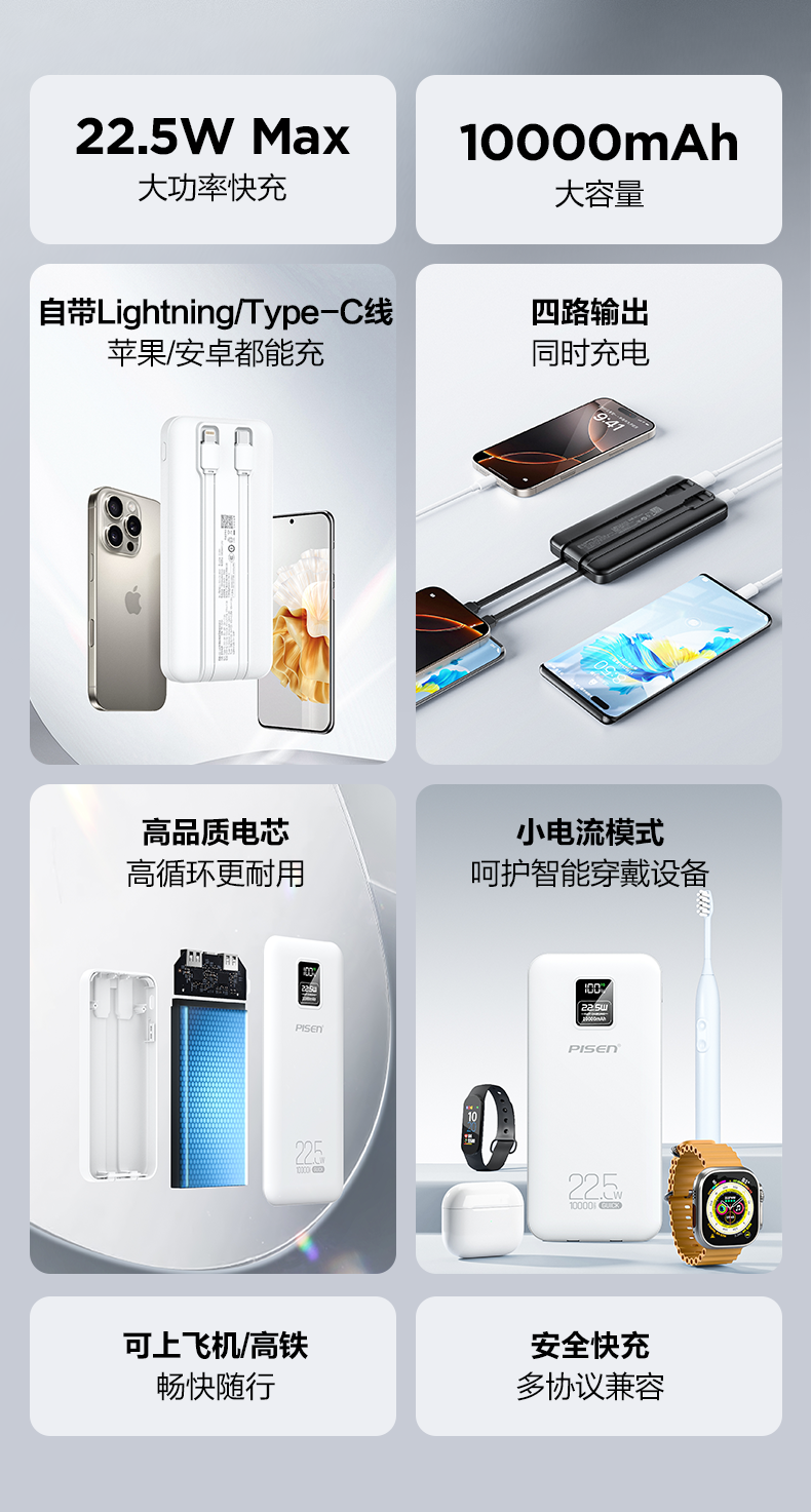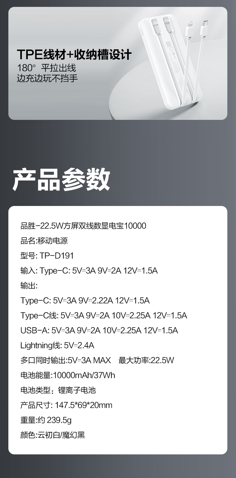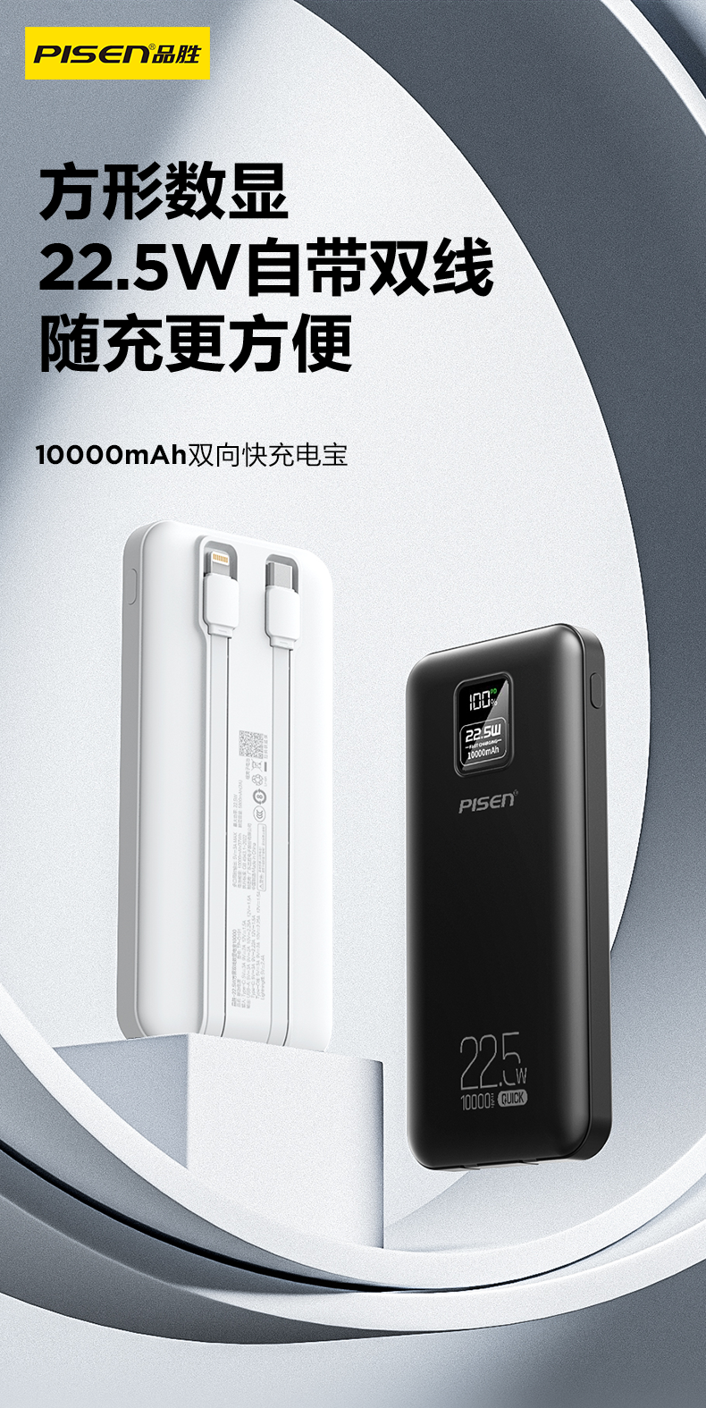 品胜 22.5W方屏双线数显电宝10000毫安 屏显充电宝 自带双线苹果/C口数据线 双向快充移动电源
