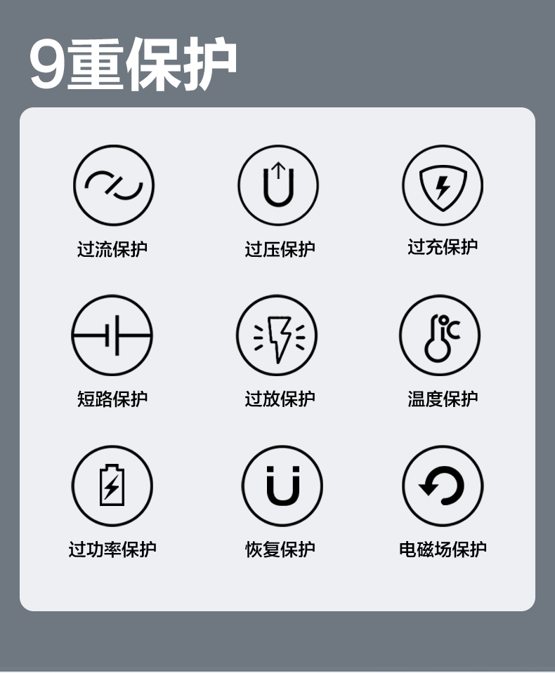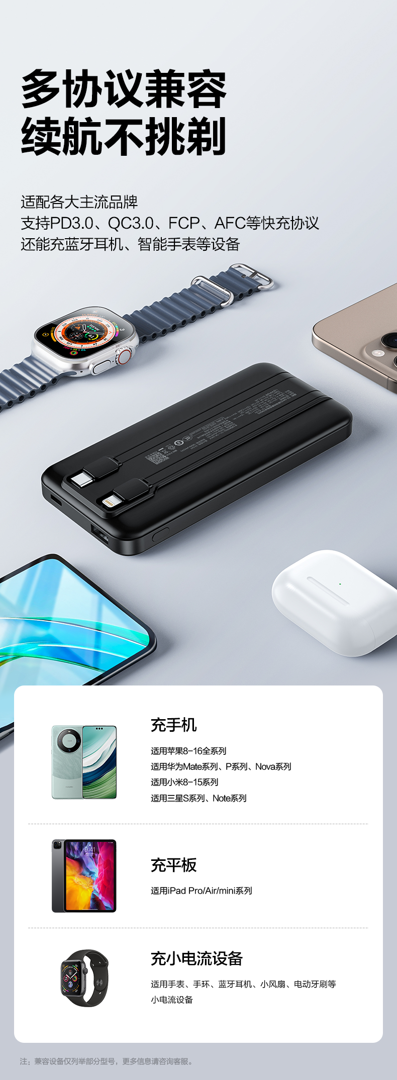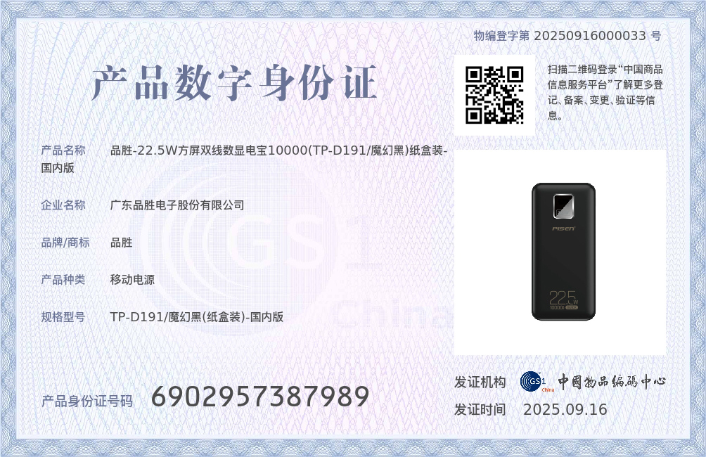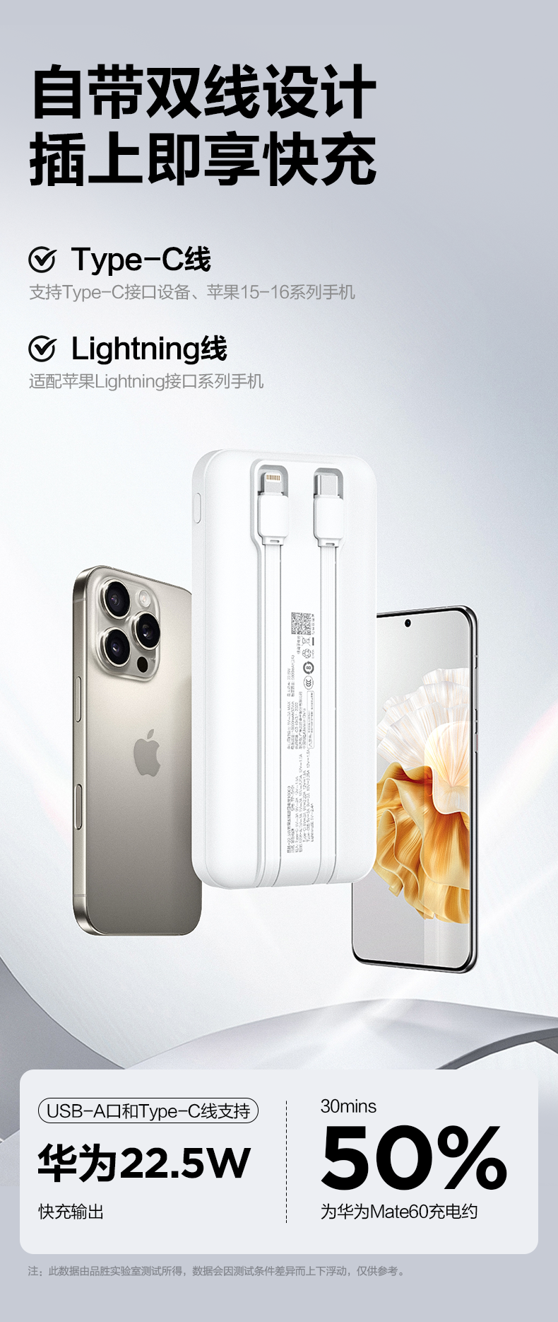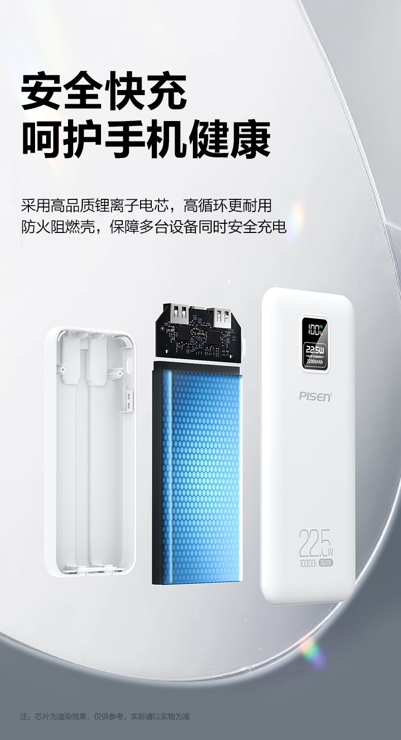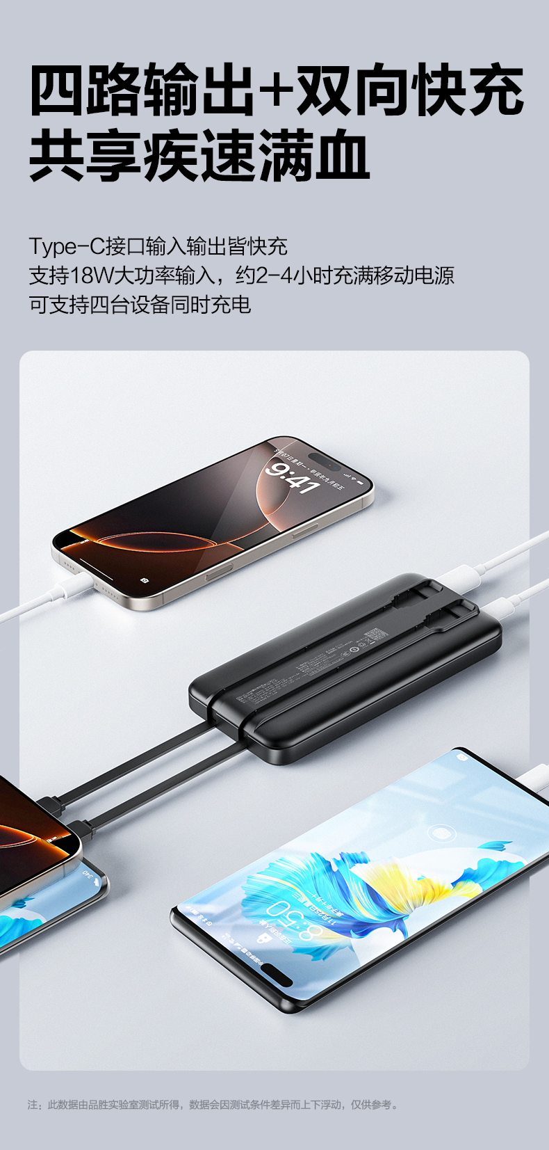 品胜 22.5W方屏双线数显电宝10000毫安 屏显充电宝 自带双线苹果/C口数据线 双向快充移动电源