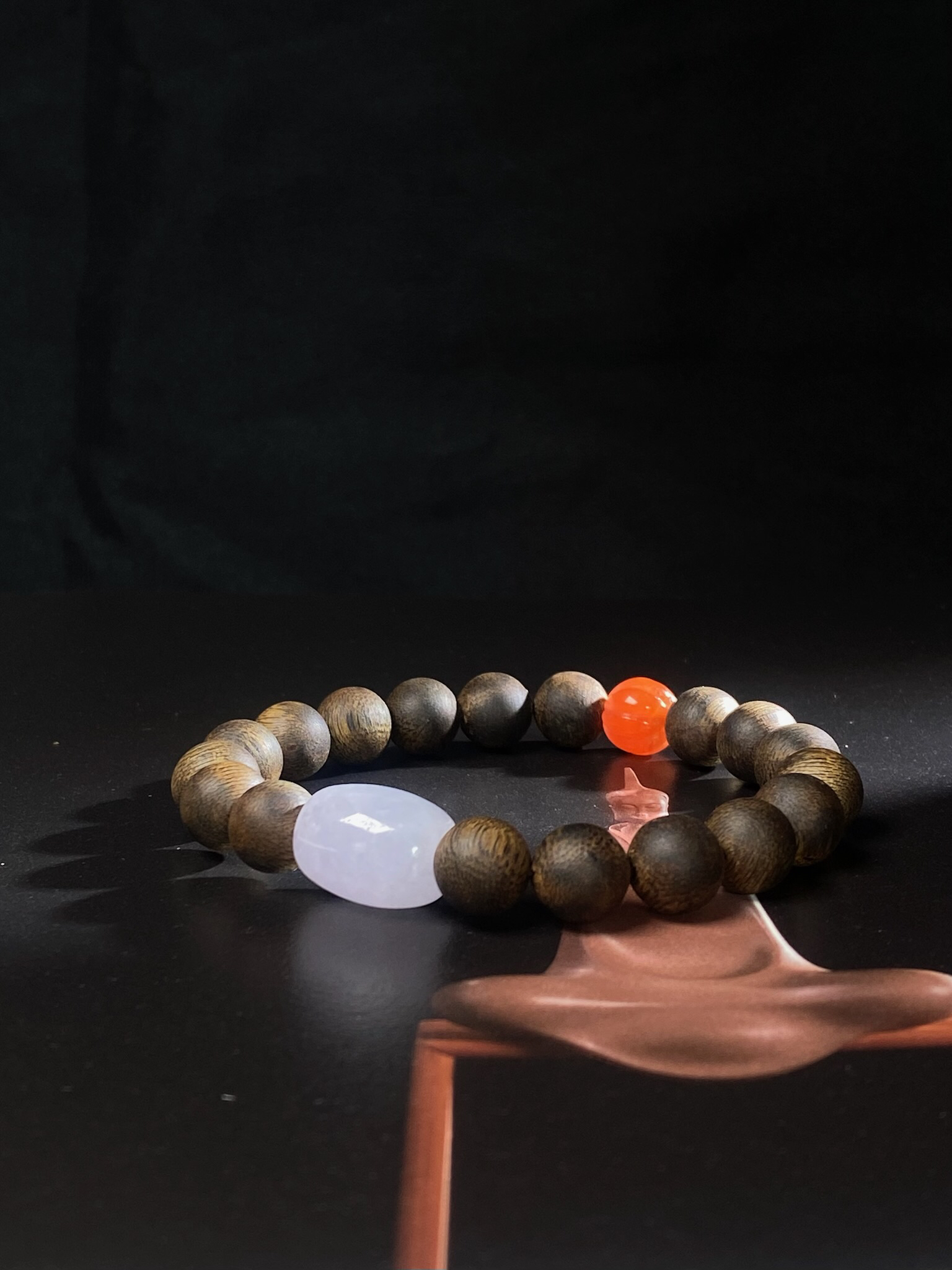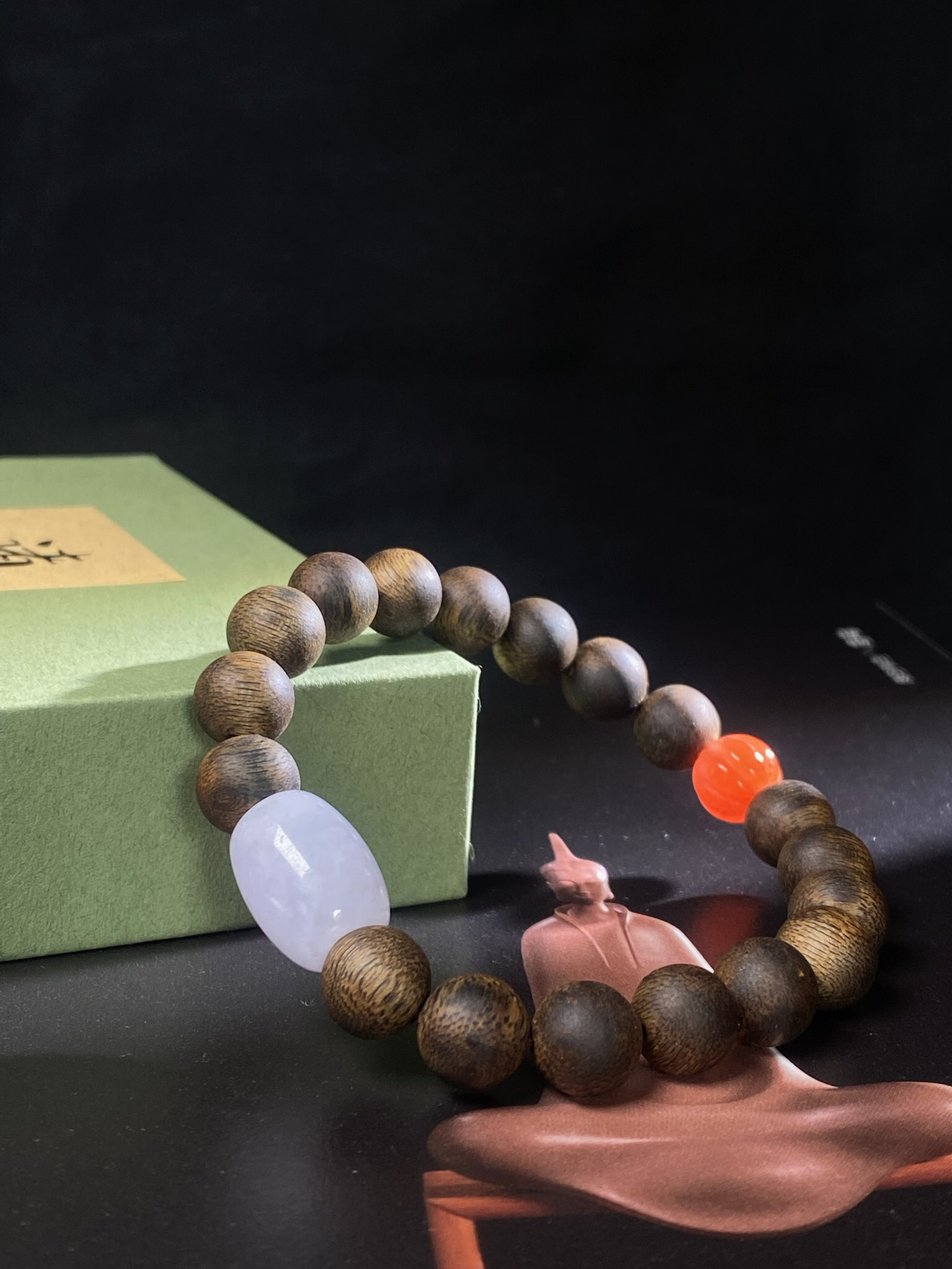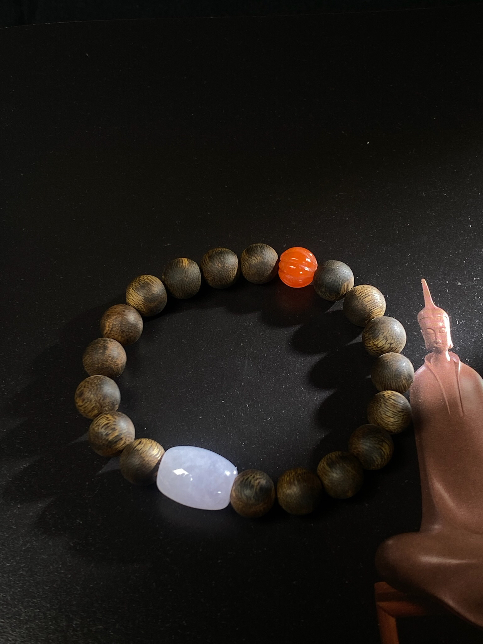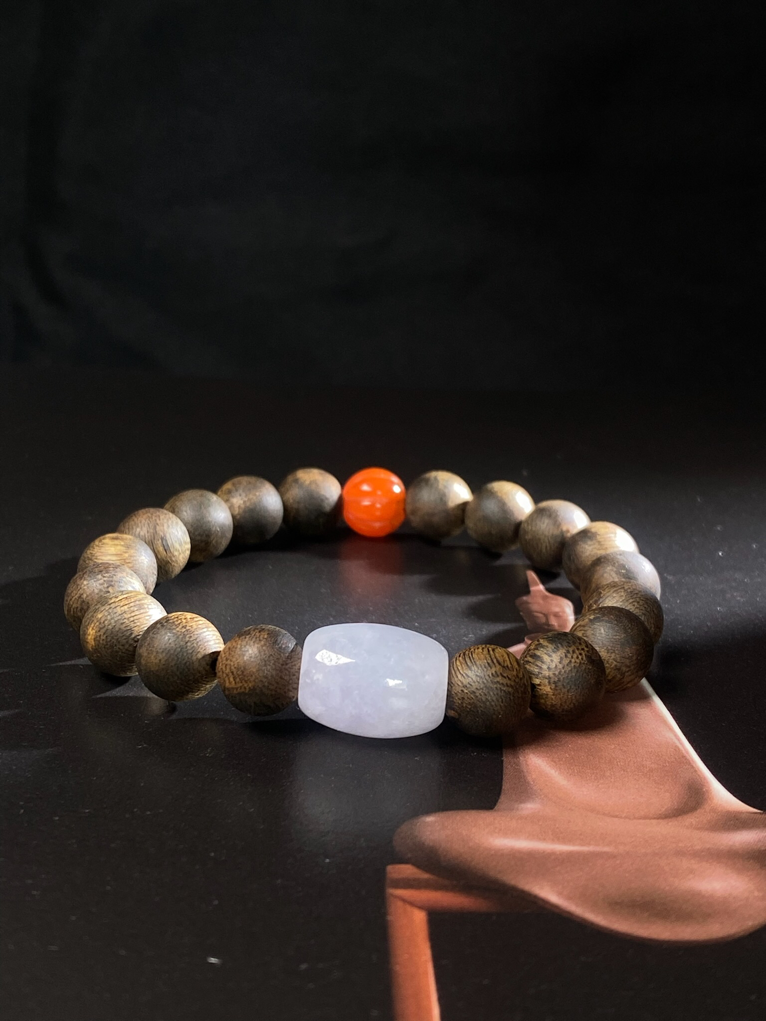 沉香DIY圆珠翡翠桶珠南红瓜珠,天然沉香圆珠约9mm,原色原味,冰种浅紫色的翡翠桶珠,再配颗南红瓜珠,款式简约大方,古色古香。