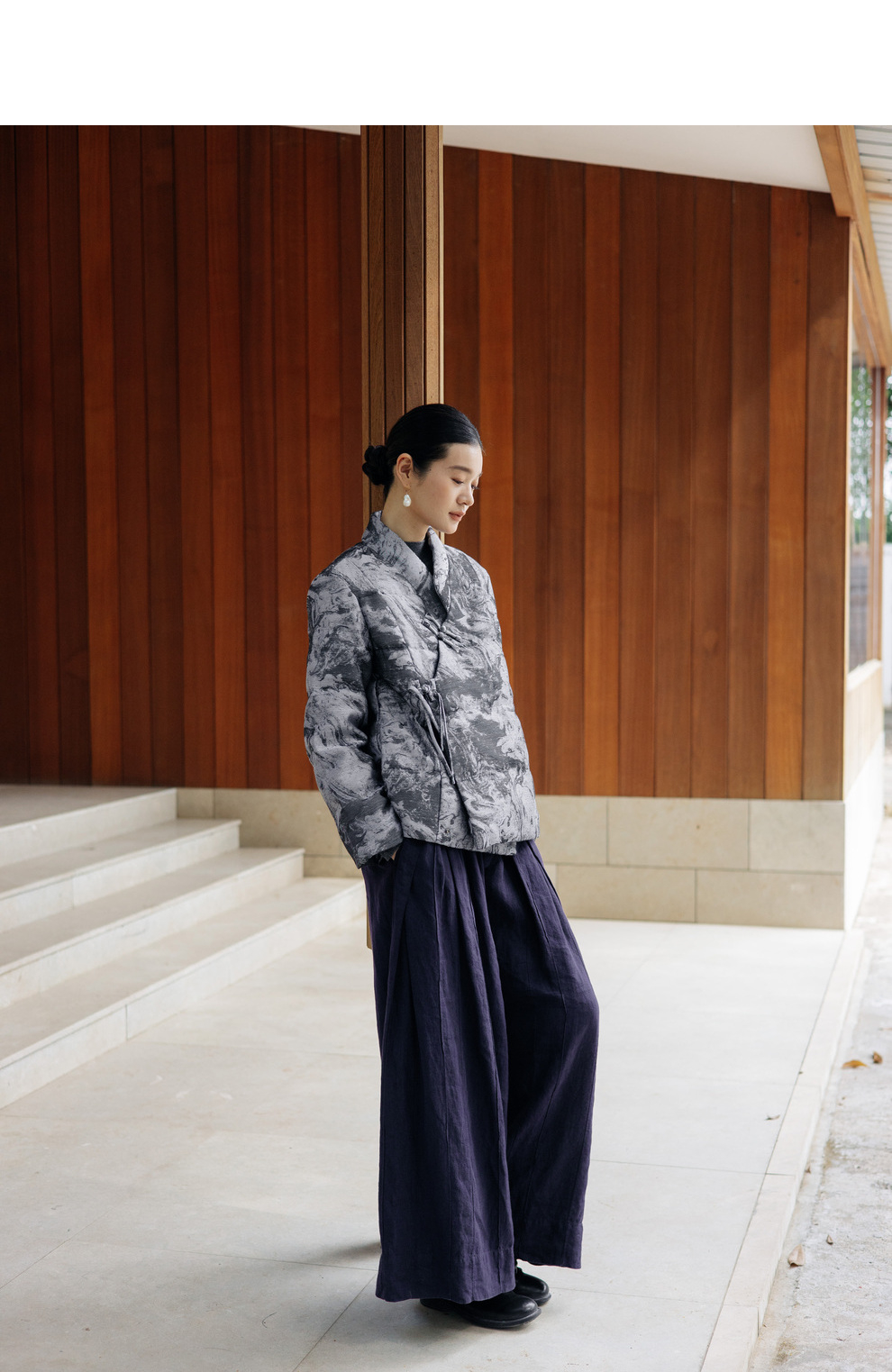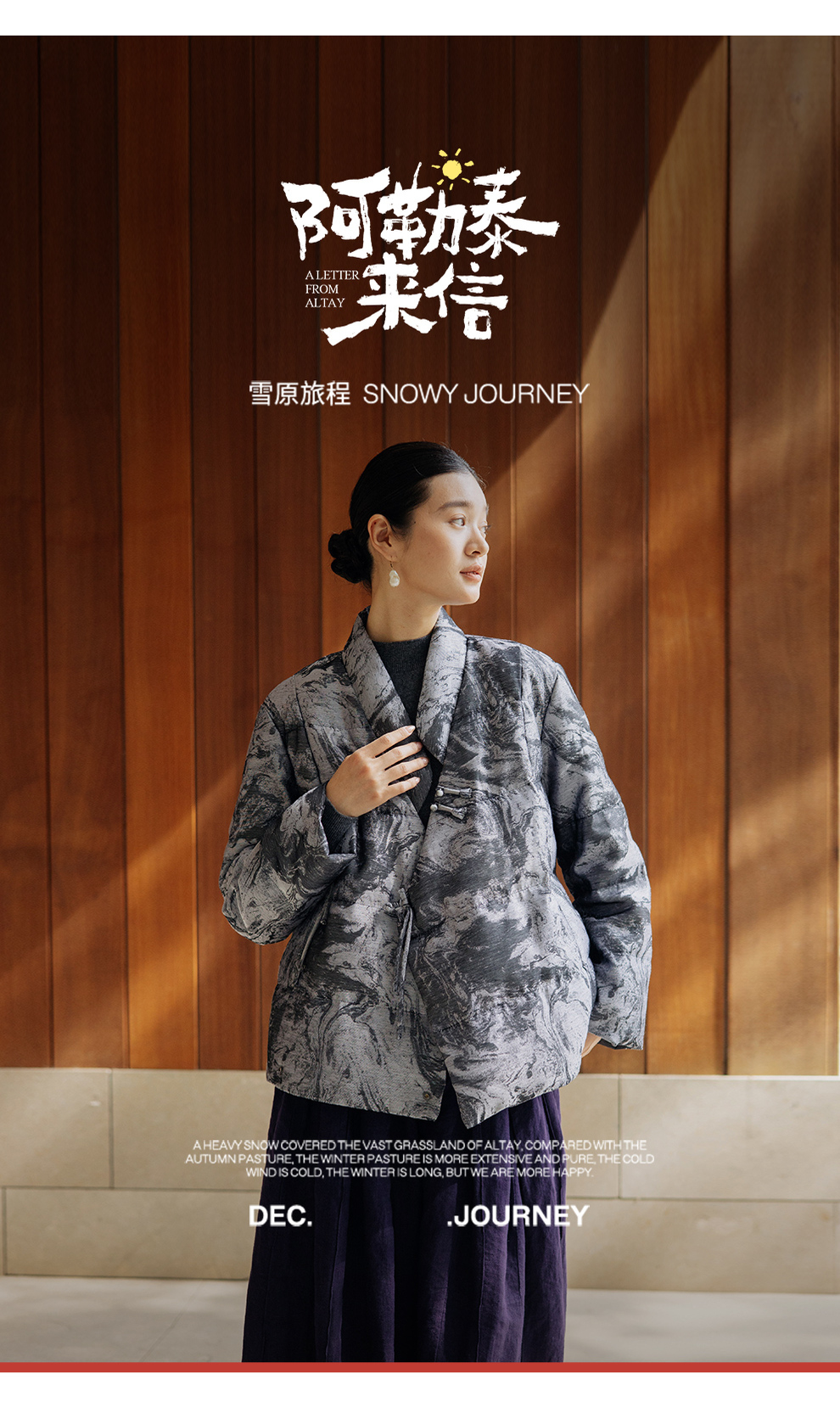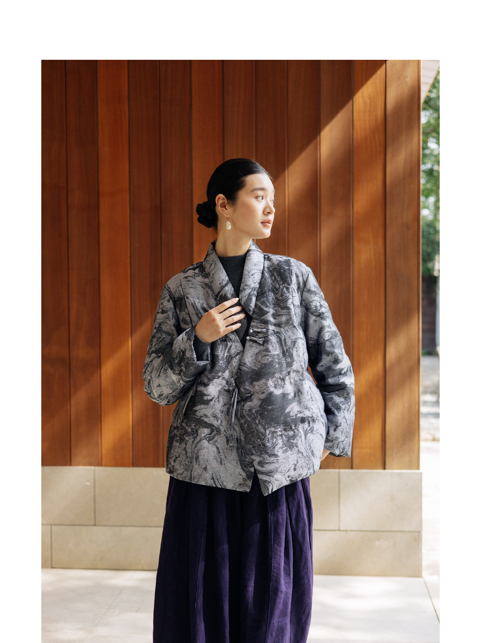 绽放旅行女装866朵/95白鹅绒冬季新中式水墨提花鹅绒短款羽绒服