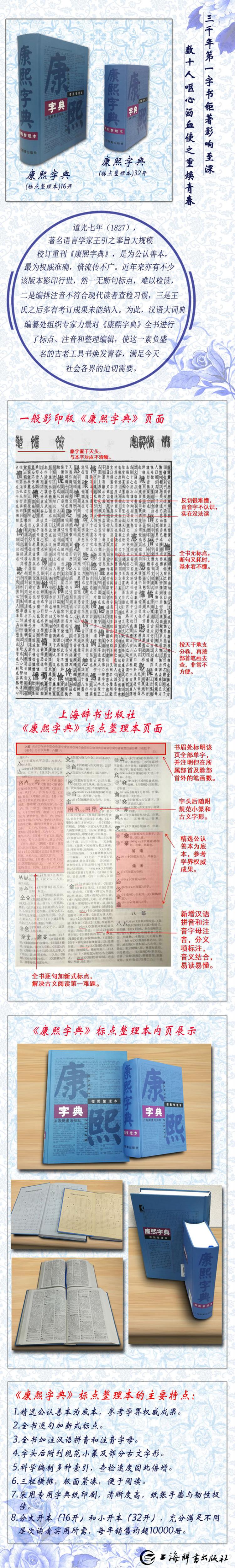 《康煕字典:标点整理本》原于2005年,是汉语大词典出版社出版。以道光王引之订正本《康熙字典》为底本,参校别本,重新横排出版。逐句加标点,主要使用逗号、句号、冒号、书名号等。为方便读者使用,在原注音反切、直音后加标汉语拼音和注音符号。原书无篆文,现掳徐铉校本《说文解字》,将规范小篆附于正文字头之后。书末新编四角号码索引,收入原书正文、補遗、傅考中全部字头,以便检索。