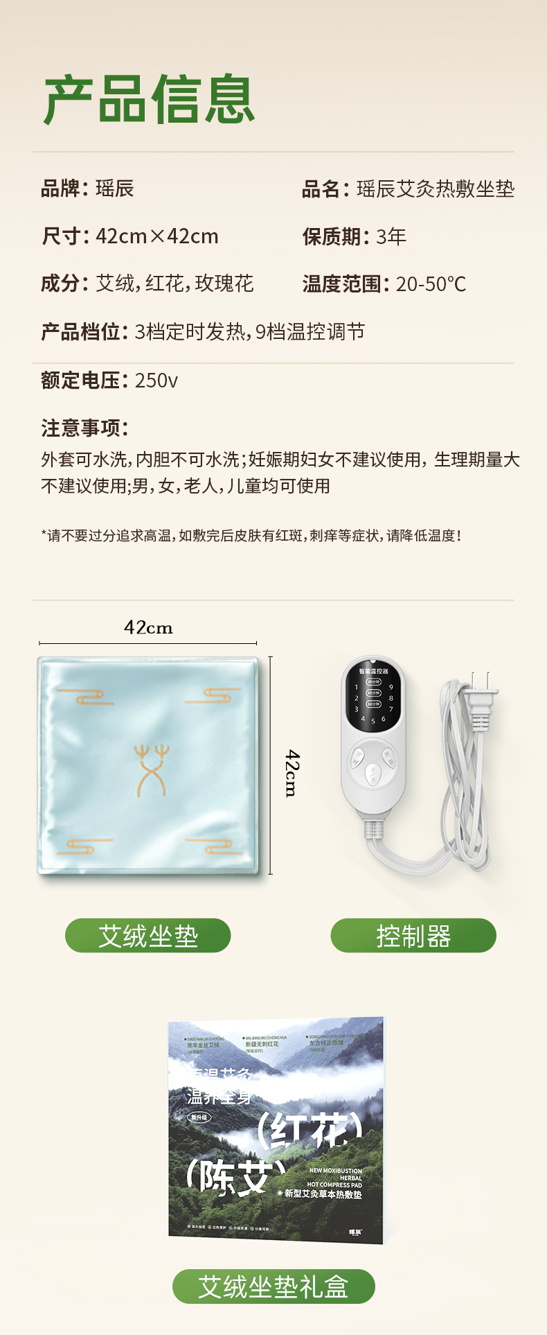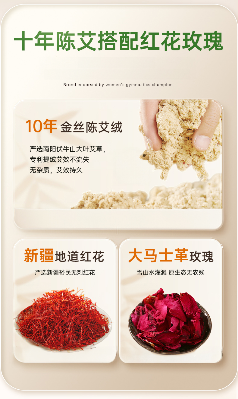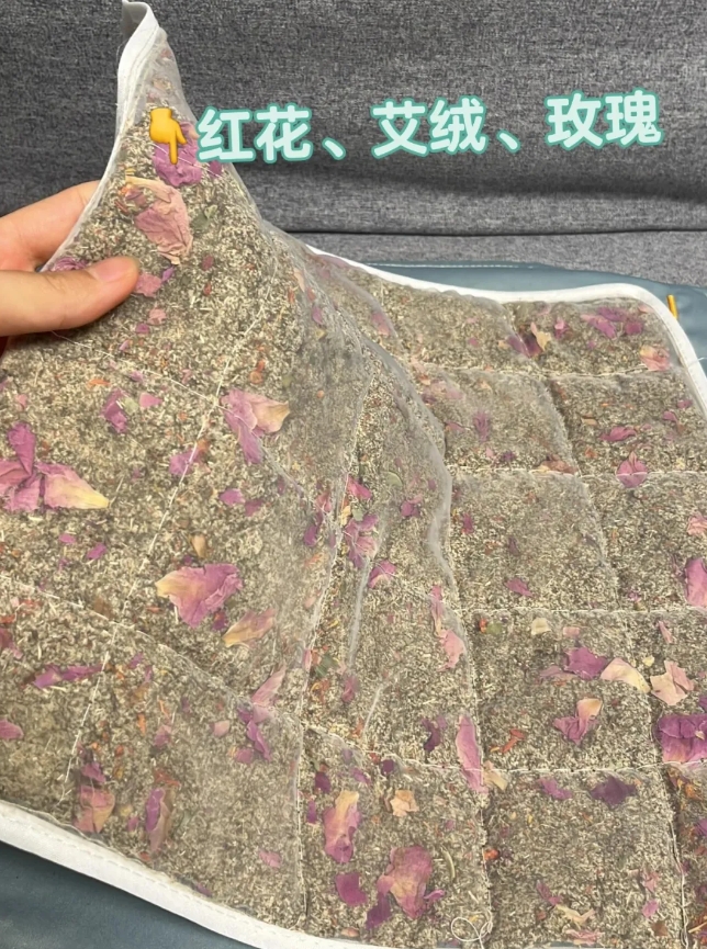 这个热敷坐垫里加的成分,有10年金丝陈艾绒+新疆地道红花+大马士革玫瑰,真材实料都是能看到的。