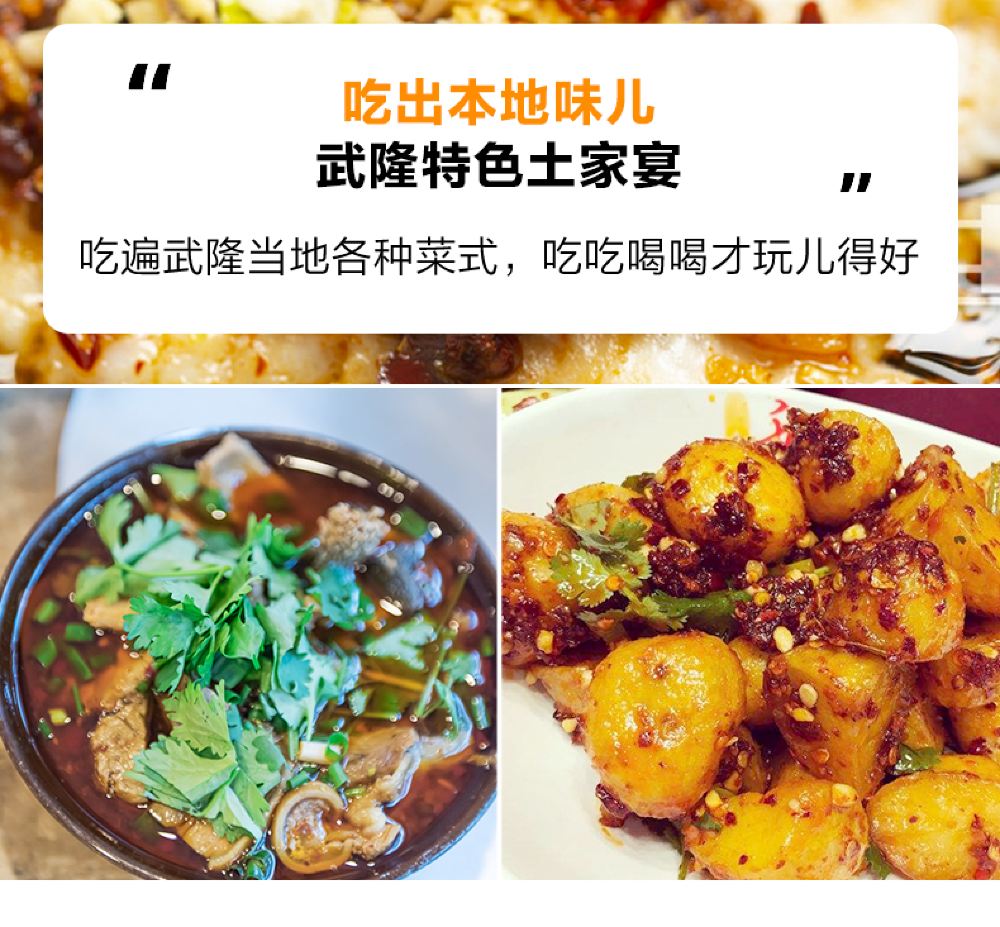 自由活动:我们在武隆仙女山镇适时解决午餐,吃当地特色重庆美食。可自己选择餐馆,自己点菜,也可以去吃推荐便宜的美味餐馆哦。 【友情提示】舒适舱/航空舱大团拼团含票套餐已包含午餐。