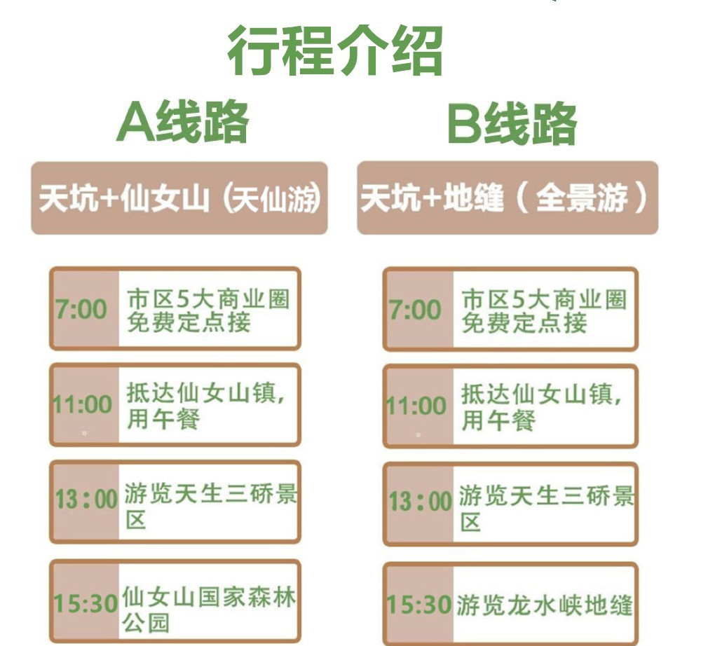 活动景点:需在仙女山镇换乘车统一进出,不含换乘车费40元/人,必须产生,不含天坑出口电瓶车15元/人,游客自行选择。天生三桥玻璃眺台是景区内自费游玩项目,游客自愿参加(40元/人)。