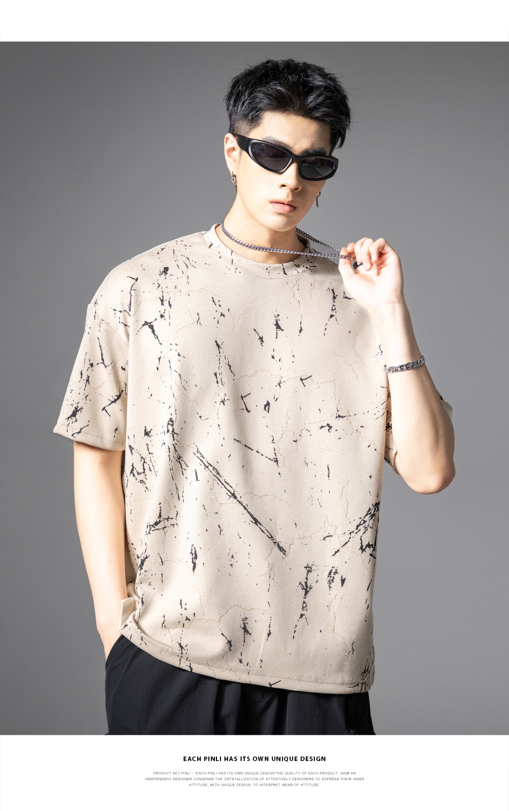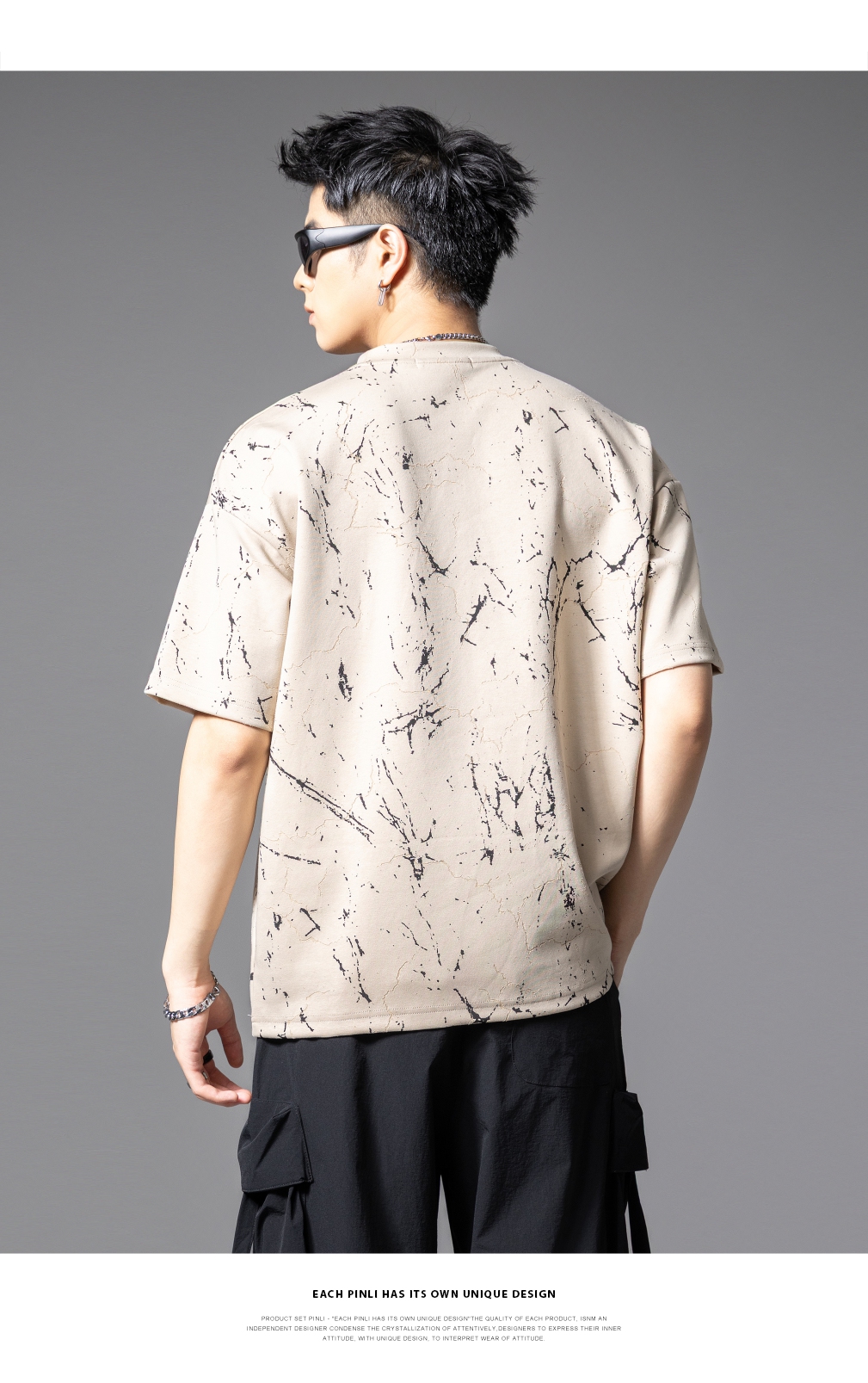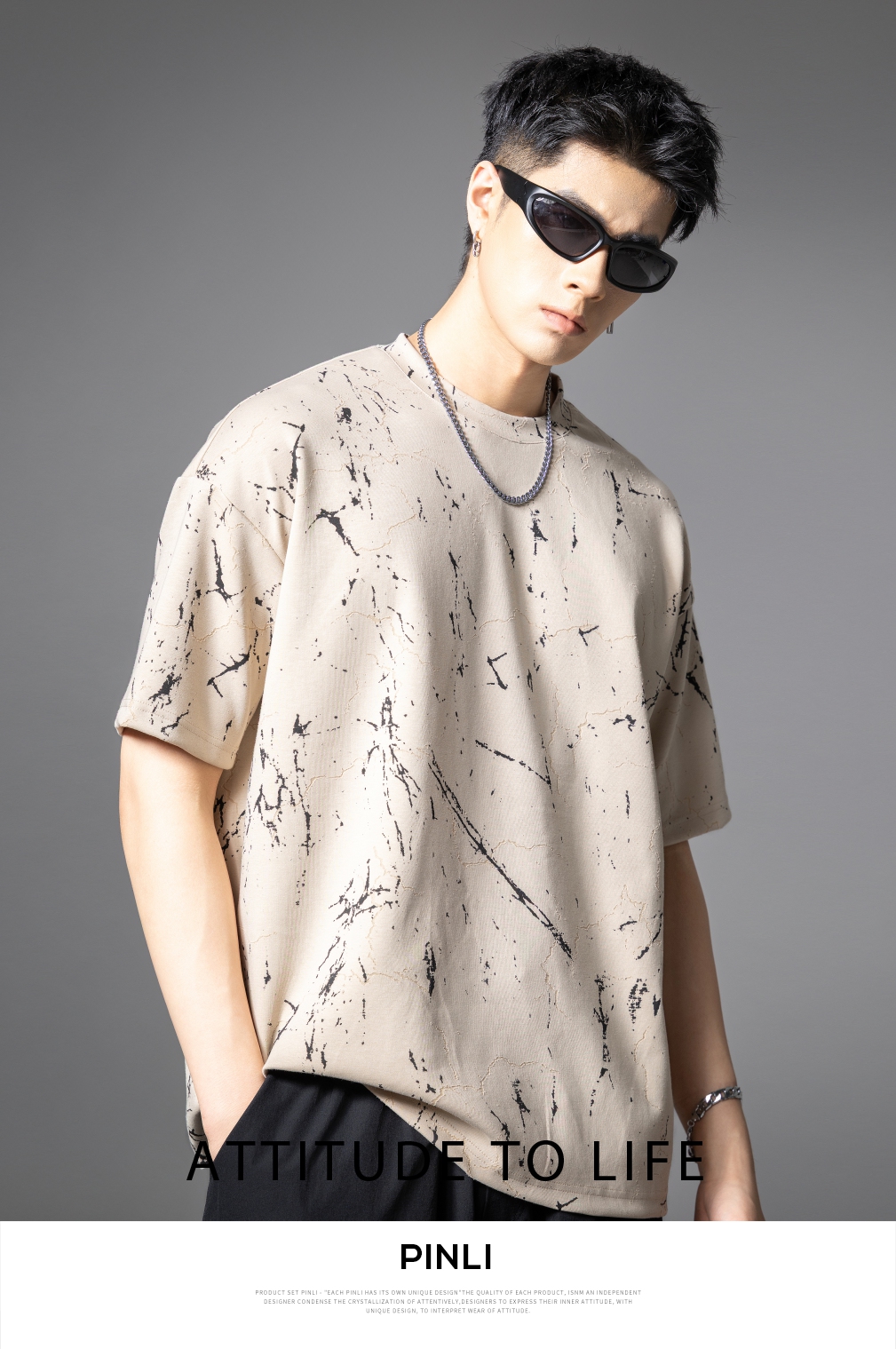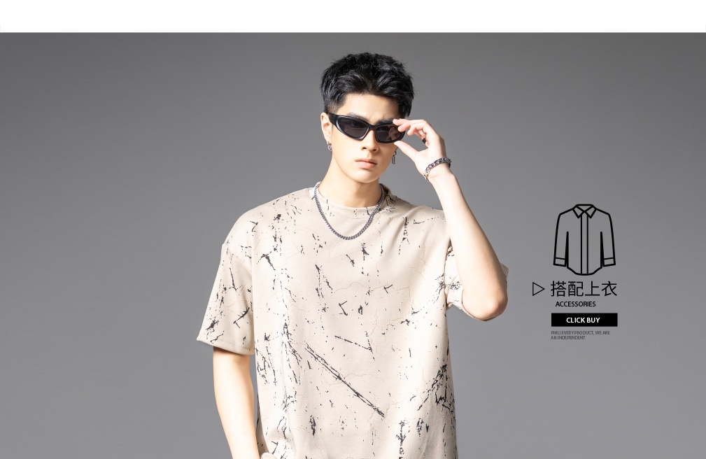 PINLI品立2025夏季新款宽松短袖T恤裂纹肌理烧花扎染印花男士上衣B252111065
