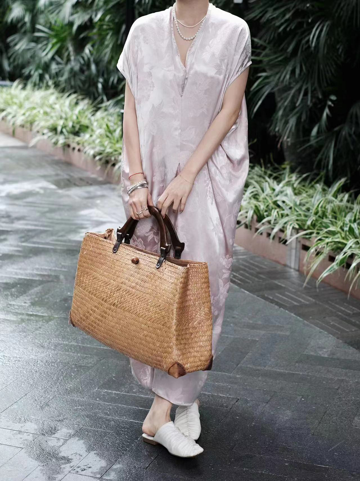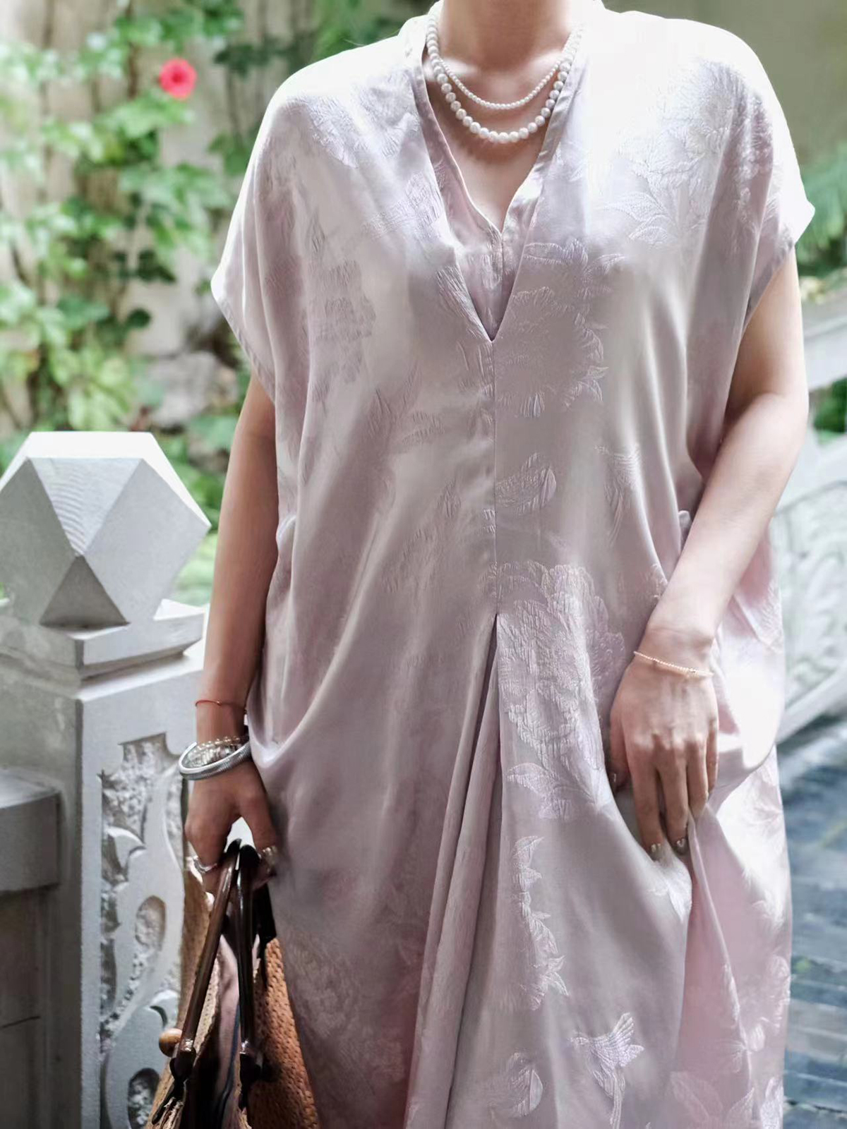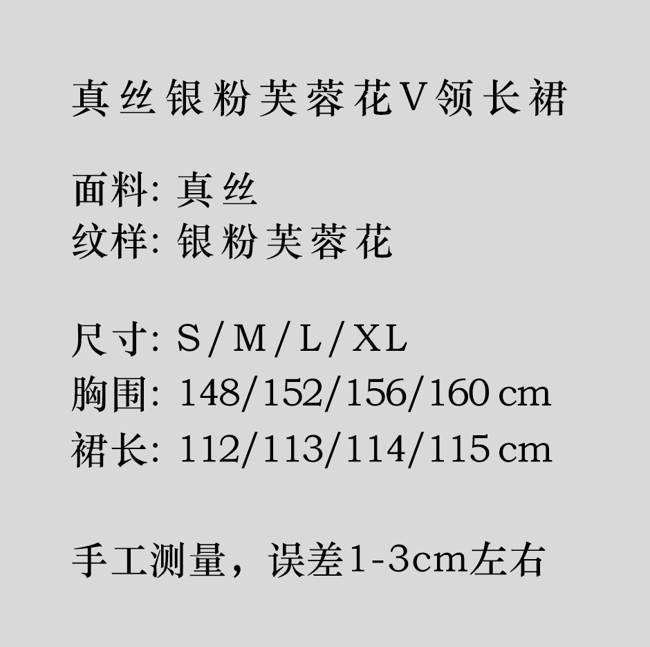 盛唐牡丹 |真丝银粉芙蓉花V领长裙