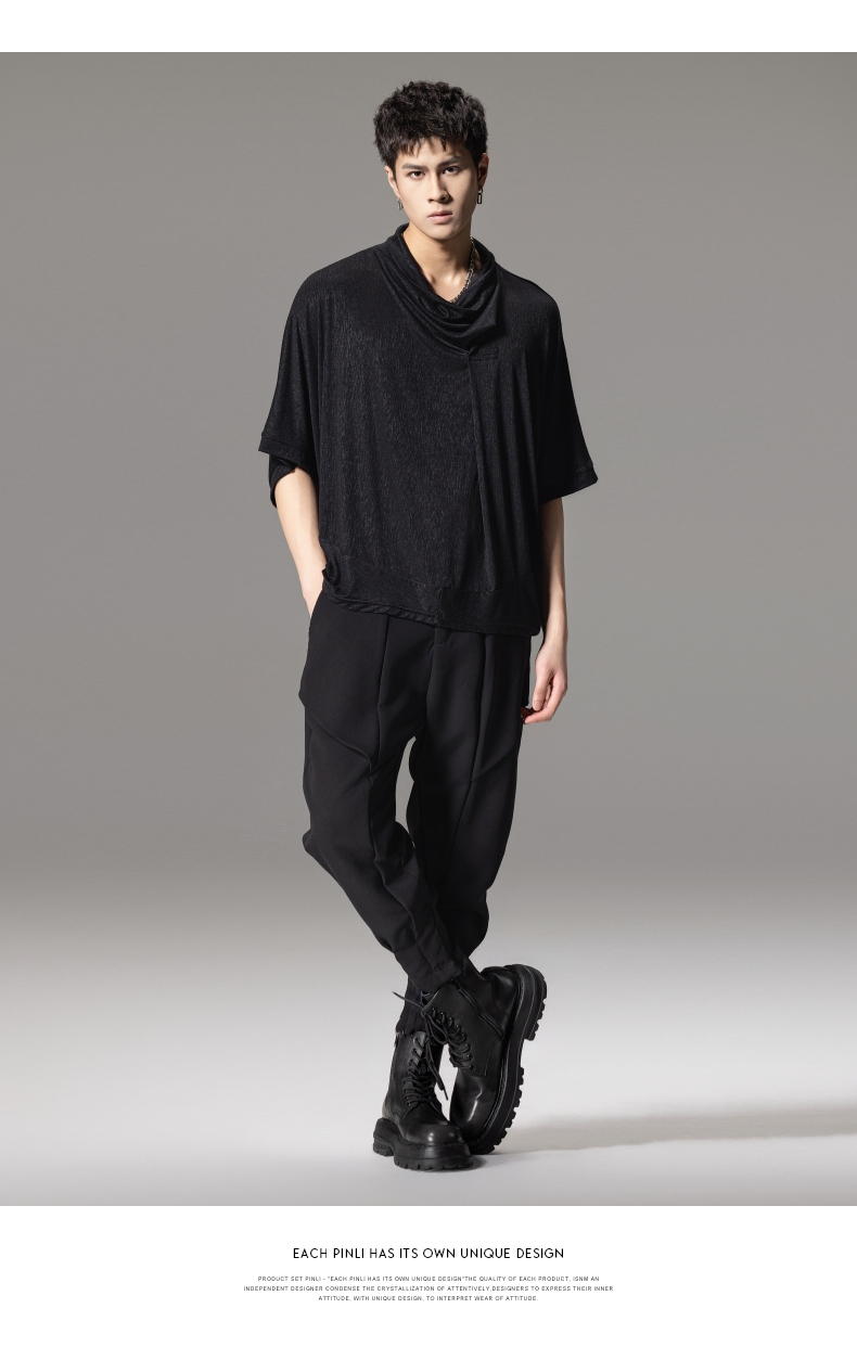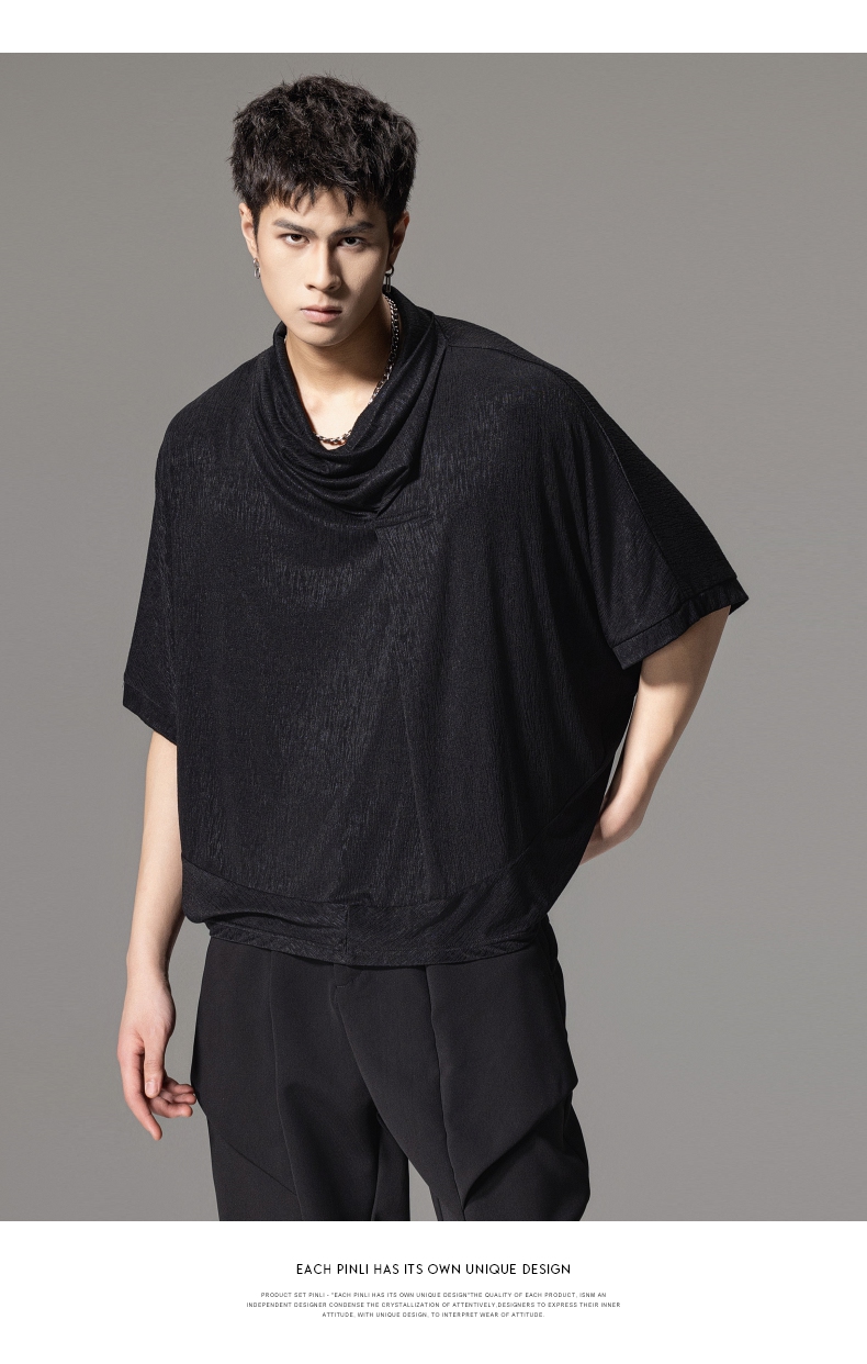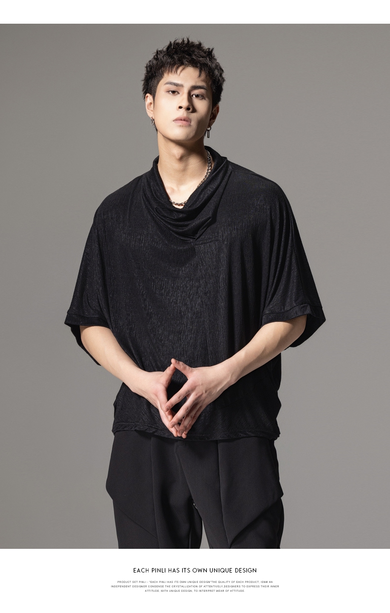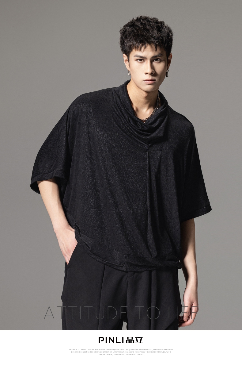 PINLI品立夏季新款堆堆领暗黑T恤潮流时尚宽松休闲短袖男上衣B242111005
