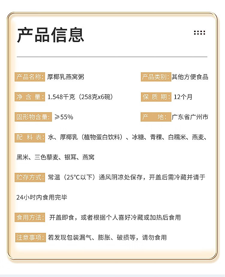 福东海 厚椰乳燕窝粥1548克(258克*6碗)/盒