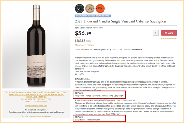 雅拉谷传奇/年度鼎级酿酒师 千烛单一园赤霞珠 Thousand Candles Single Vineyard Cabernet Sauvignon 2021