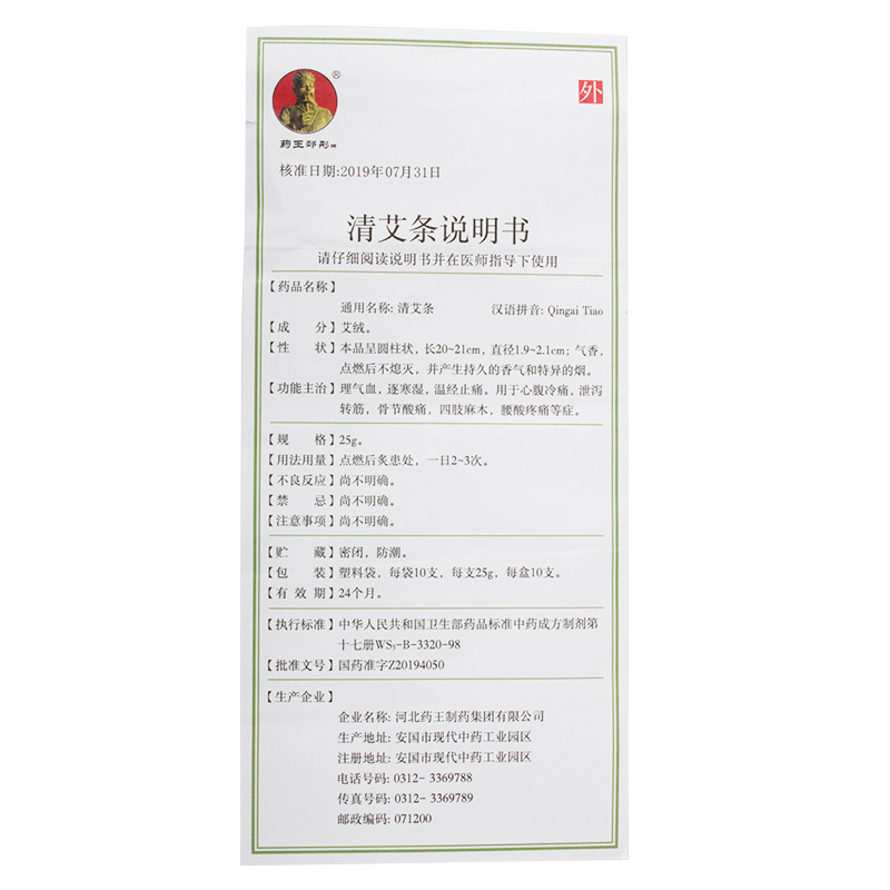 药王邳彤牌 25g*10支/盒 清艾条 理气血,逐寒湿,温经止痛。用于心腹冷痛,泄泻转筋,骨节 酸痛,四肢麻木,腰酸疼痛等症
