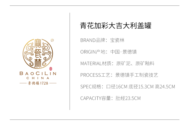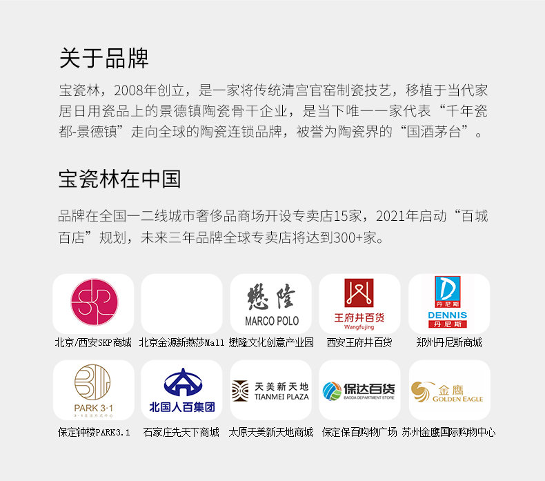 - 宝瓷林,2008年创立,是一家将传统清宫官窑制瓷技艺,移植于当代家居日用瓷品上的景德镇陶瓷骨干企业,是当下唯一一家代表“千年瓷都-景德镇”走向全球的陶瓷连锁品牌,被誉为陶瓷界的“国酒茅台”。