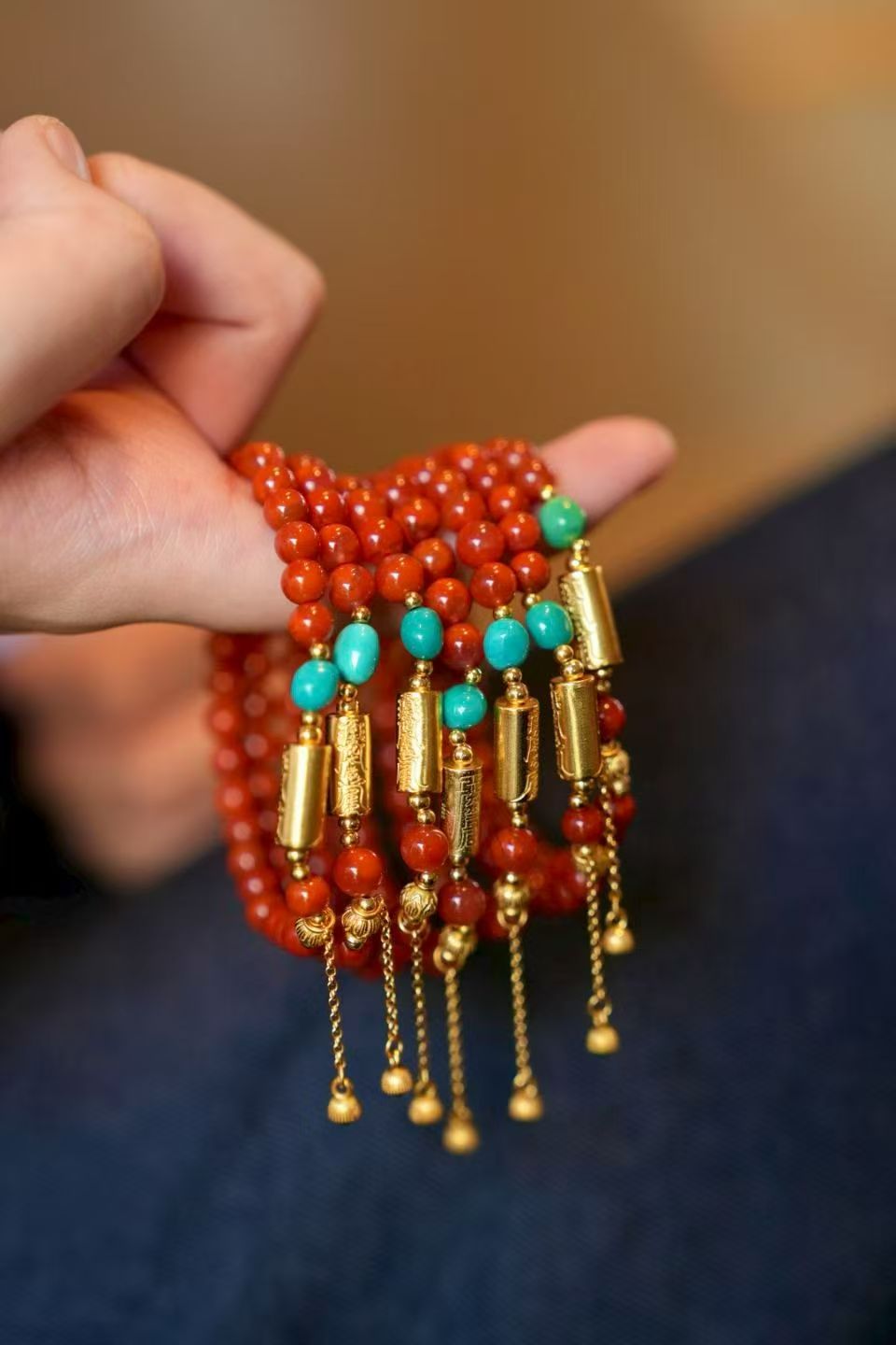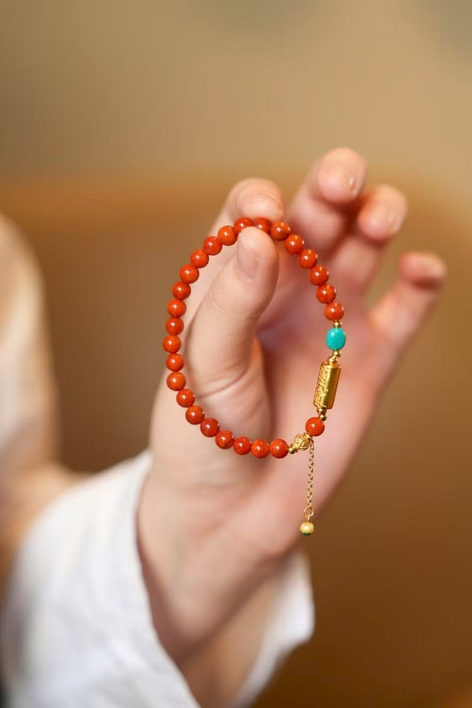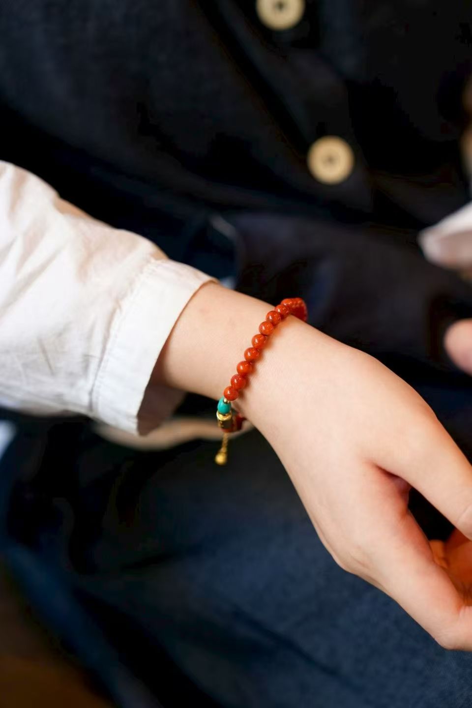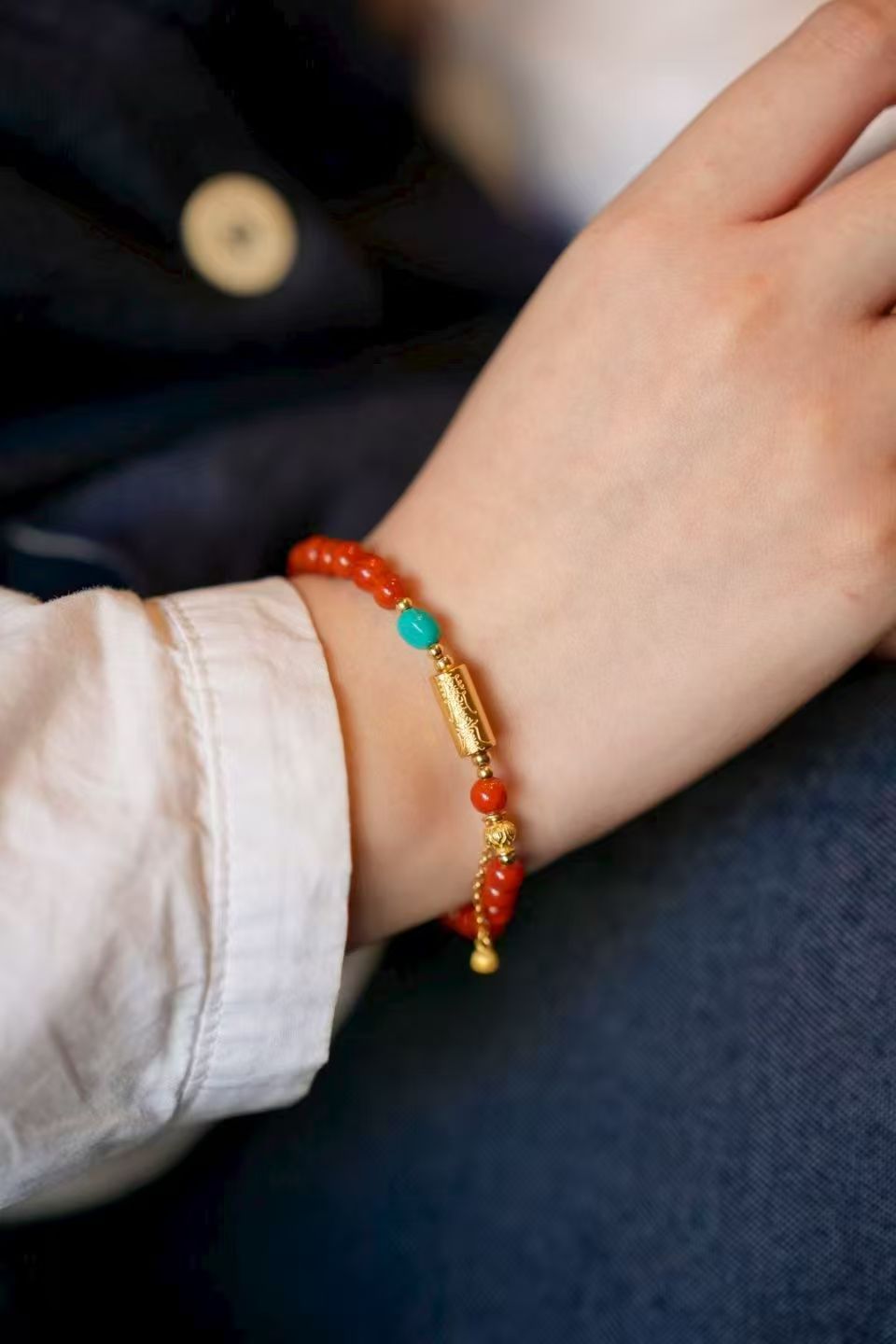 南红新中式手串,锦色圆珠 搭配古法银太岁管,玉化料暴力蓝绿松黄色。翡翠绿灯泡滴溜点缀,上手贵气喜庆 古典灵动~