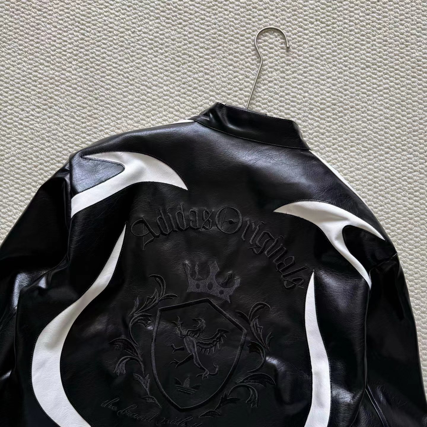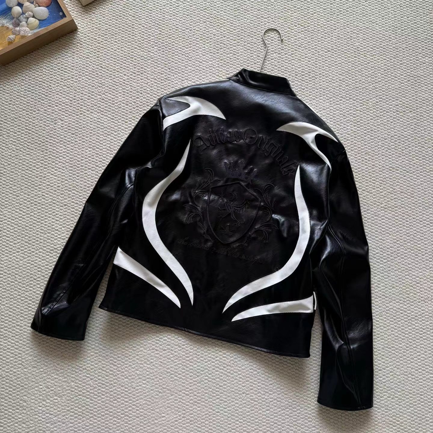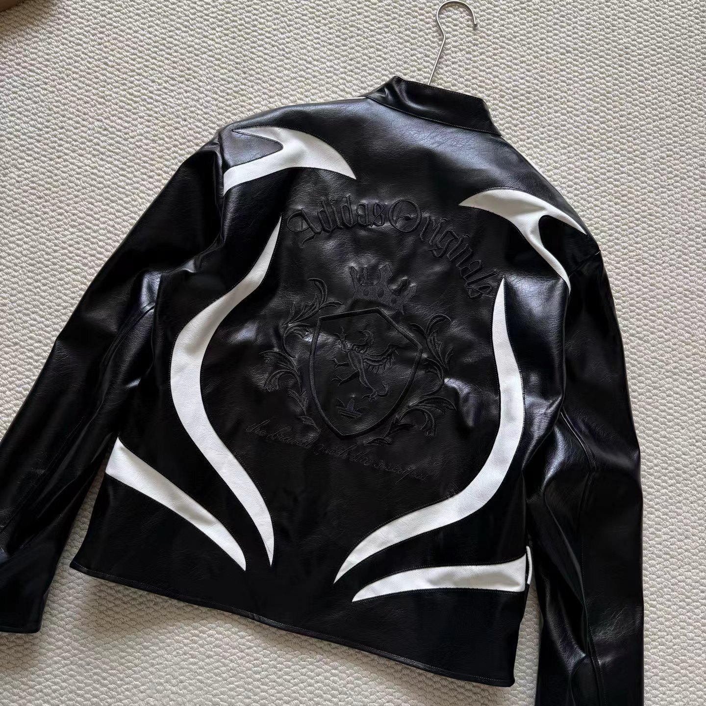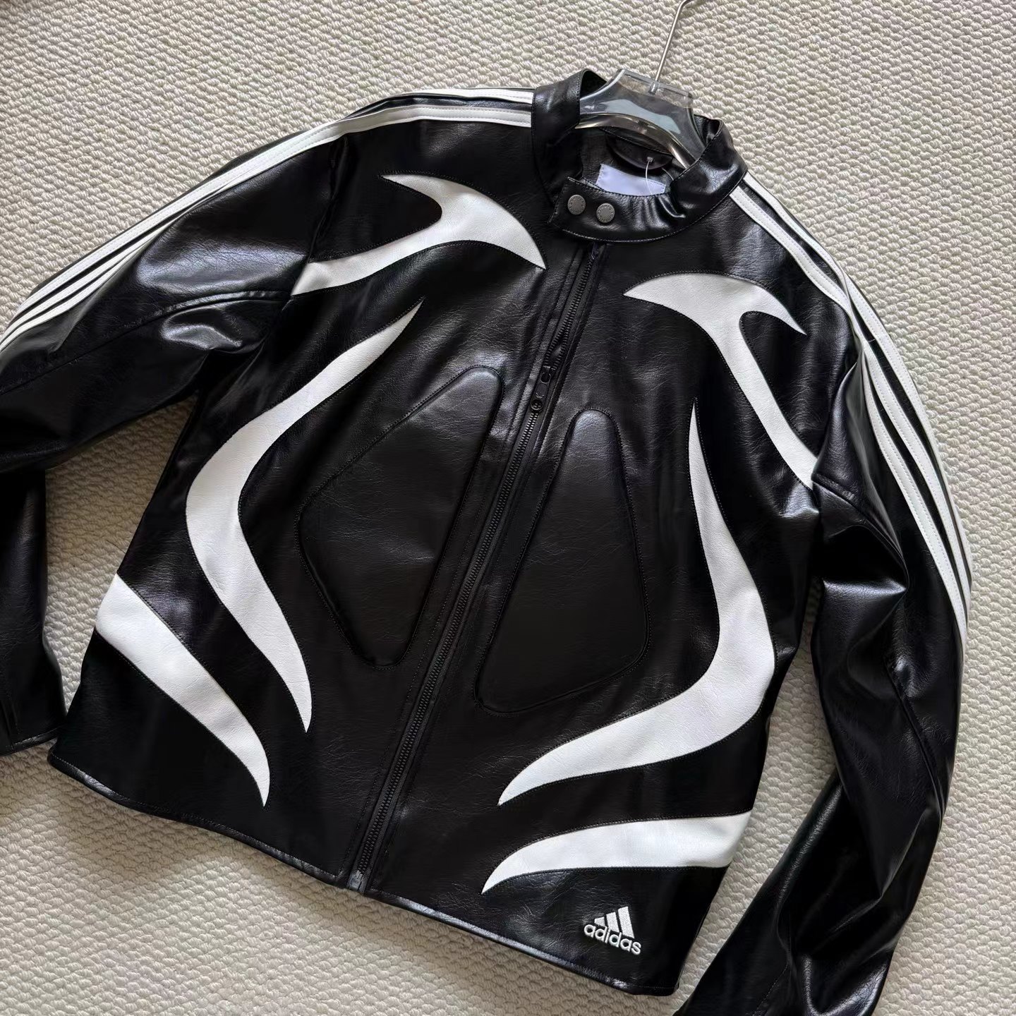 舒适亲肤立领宽松拉链夹克 男女同款!!机车皮衣,黑色皮质+白色线条,视觉冲击力满分!3D立体图案+流线型拼接,层次感十足,硬挺又细腻。后背jing致刺绣Logo,细节控必入!秀场款,街头风与jing致感兼具。复古or甜酷都能轻松驾驭,是潮流穿搭单品。
