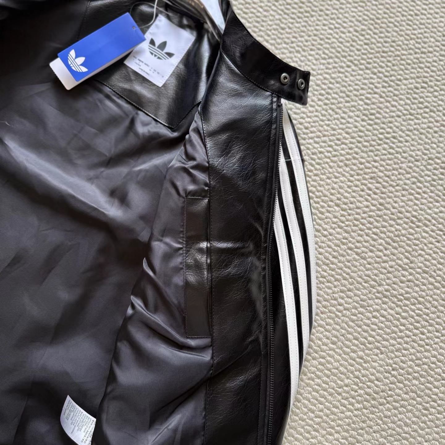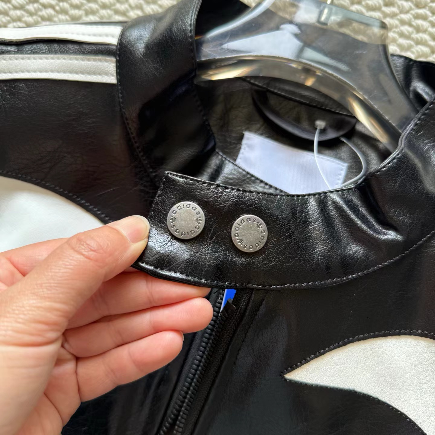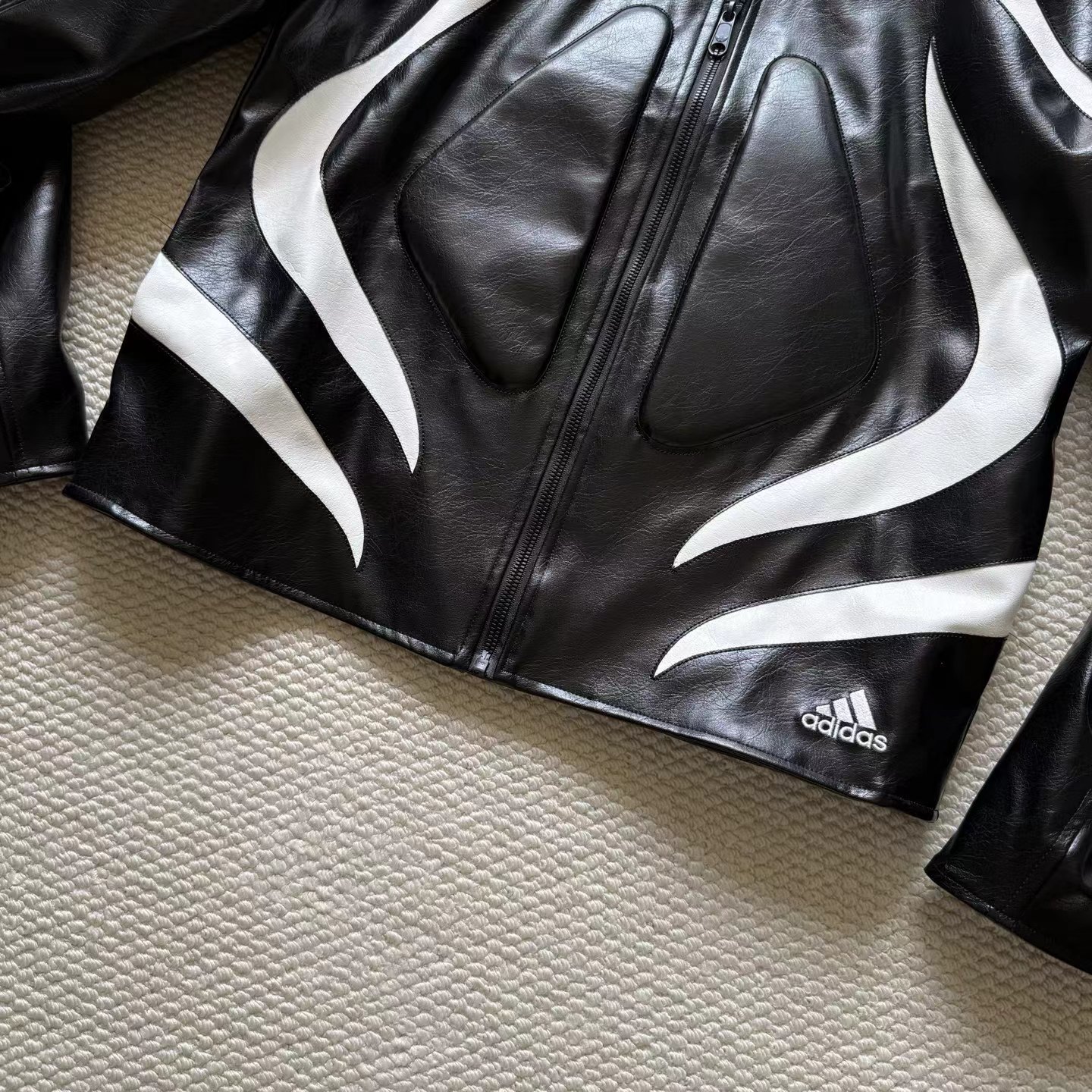 舒适亲肤立领宽松拉链夹克 男女同款!!机车皮衣,黑色皮质+白色线条,视觉冲击力满分!3D立体图案+流线型拼接,层次感十足,硬挺又细腻。后背jing致刺绣Logo,细节控必入!秀场款,街头风与jing致感兼具。复古or甜酷都能轻松驾驭,是潮流穿搭单品。