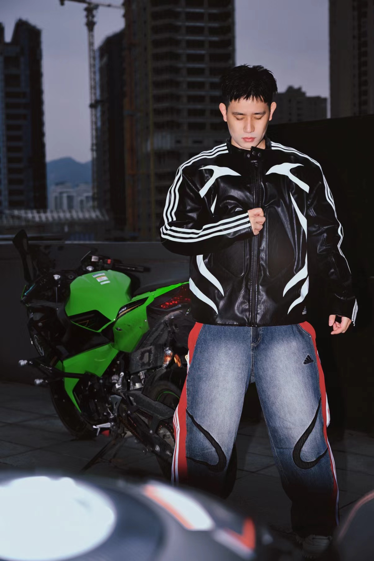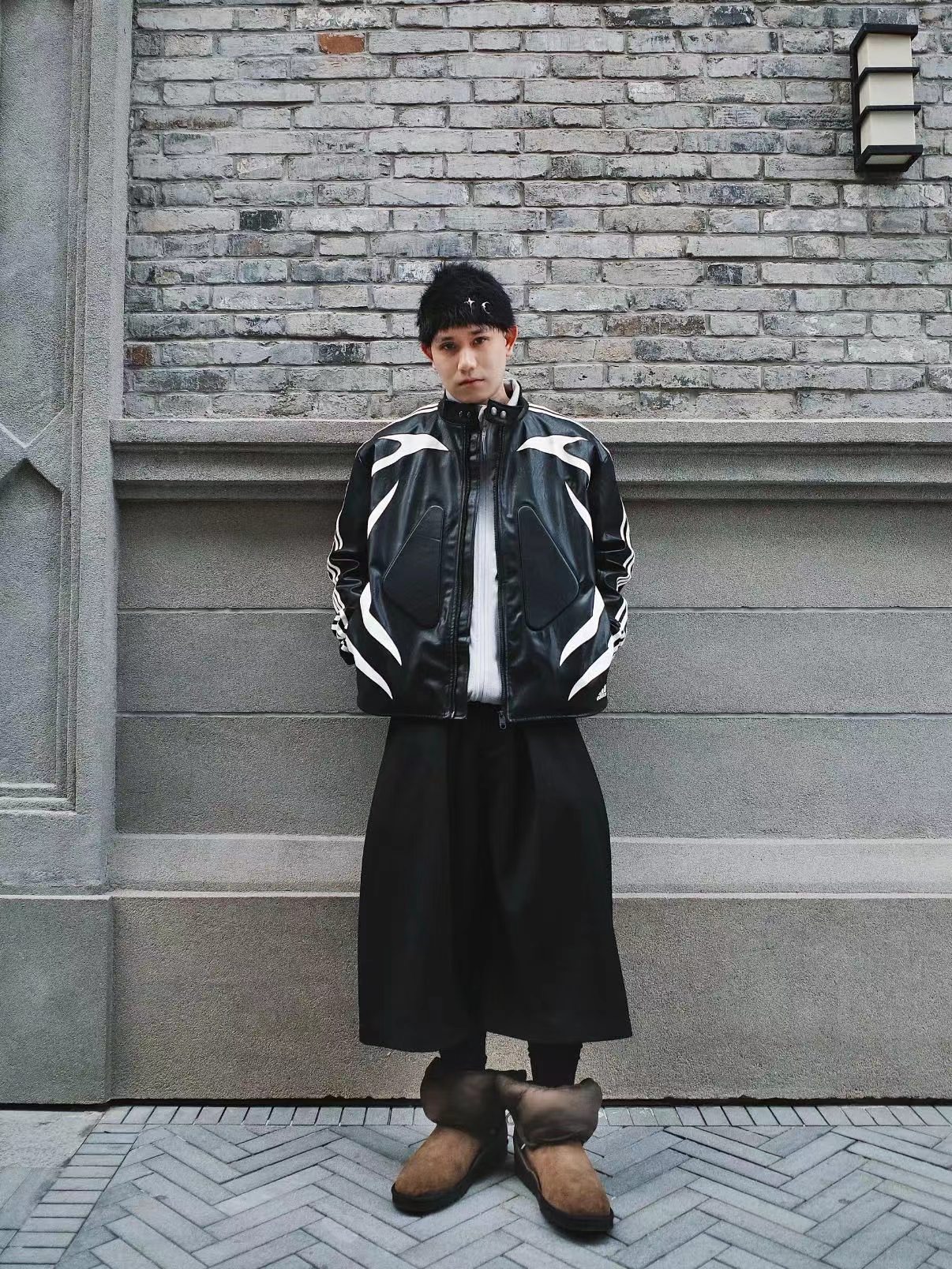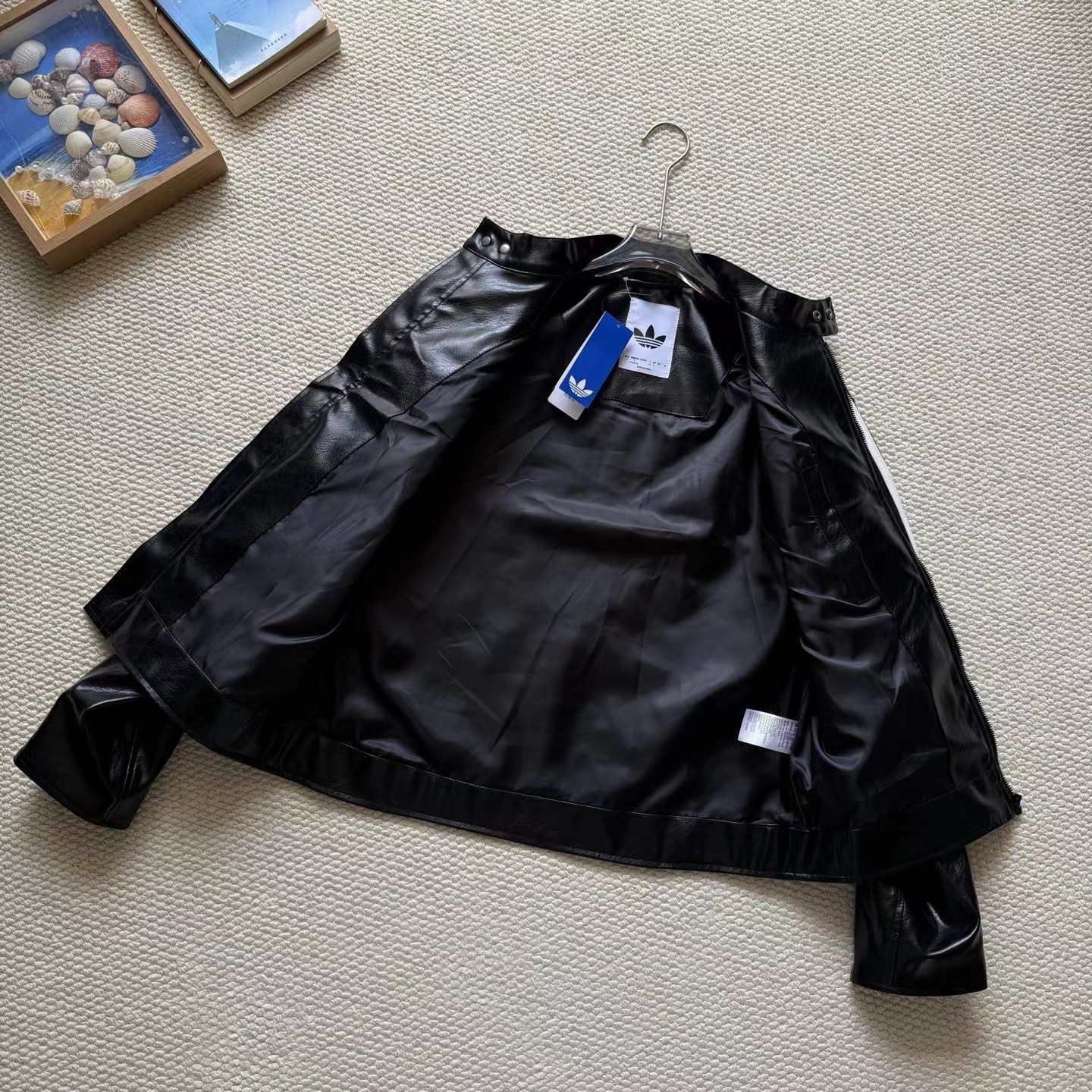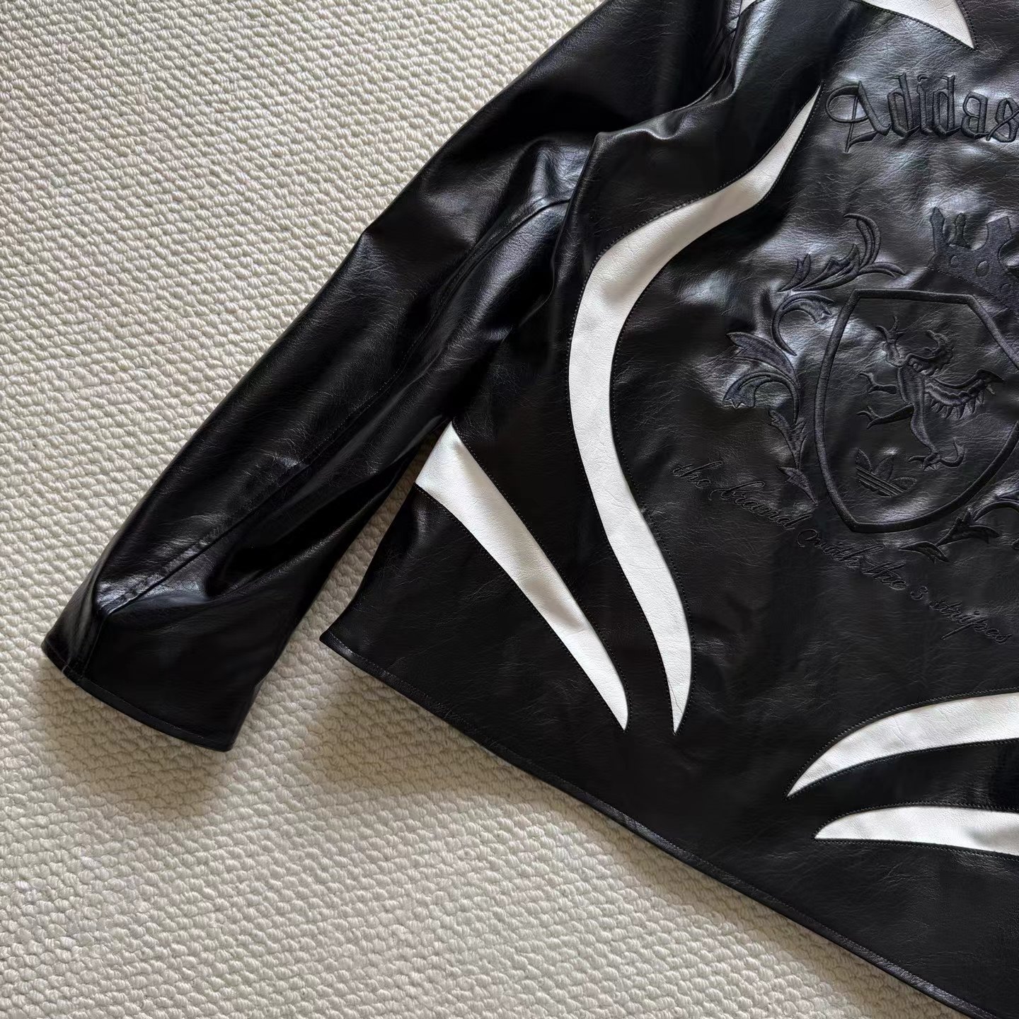 舒适亲肤立领宽松拉链夹克 男女同款!!机车皮衣,黑色皮质+白色线条,视觉冲击力满分!3D立体图案+流线型拼接,层次感十足,硬挺又细腻。后背jing致刺绣Logo,细节控必入!秀场款,街头风与jing致感兼具。复古or甜酷都能轻松驾驭,是潮流穿搭单品。