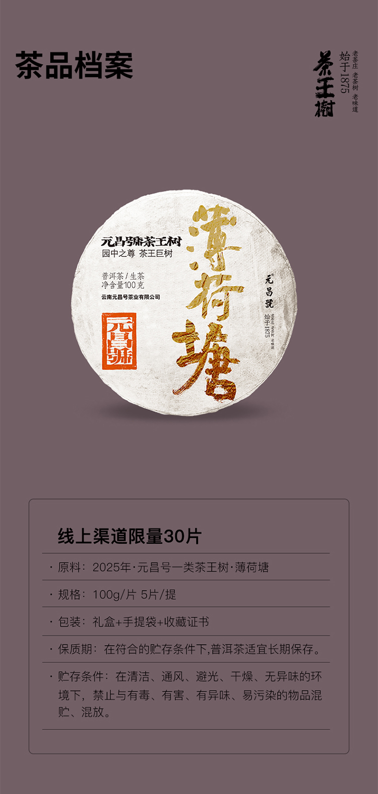 【茶王树系列】元昌号2025年薄荷塘一类茶王树100克生饼
