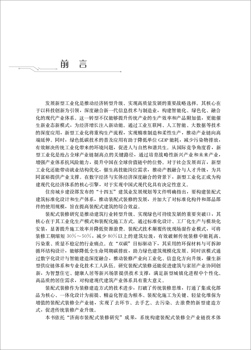 本 书 依 托 “济 南 市 装 配 式 装 修 研 究 ” 成 果 , 系 统 构 建 装 配 式 装 修 全 产 业 链 技 术 体系 , 通 过