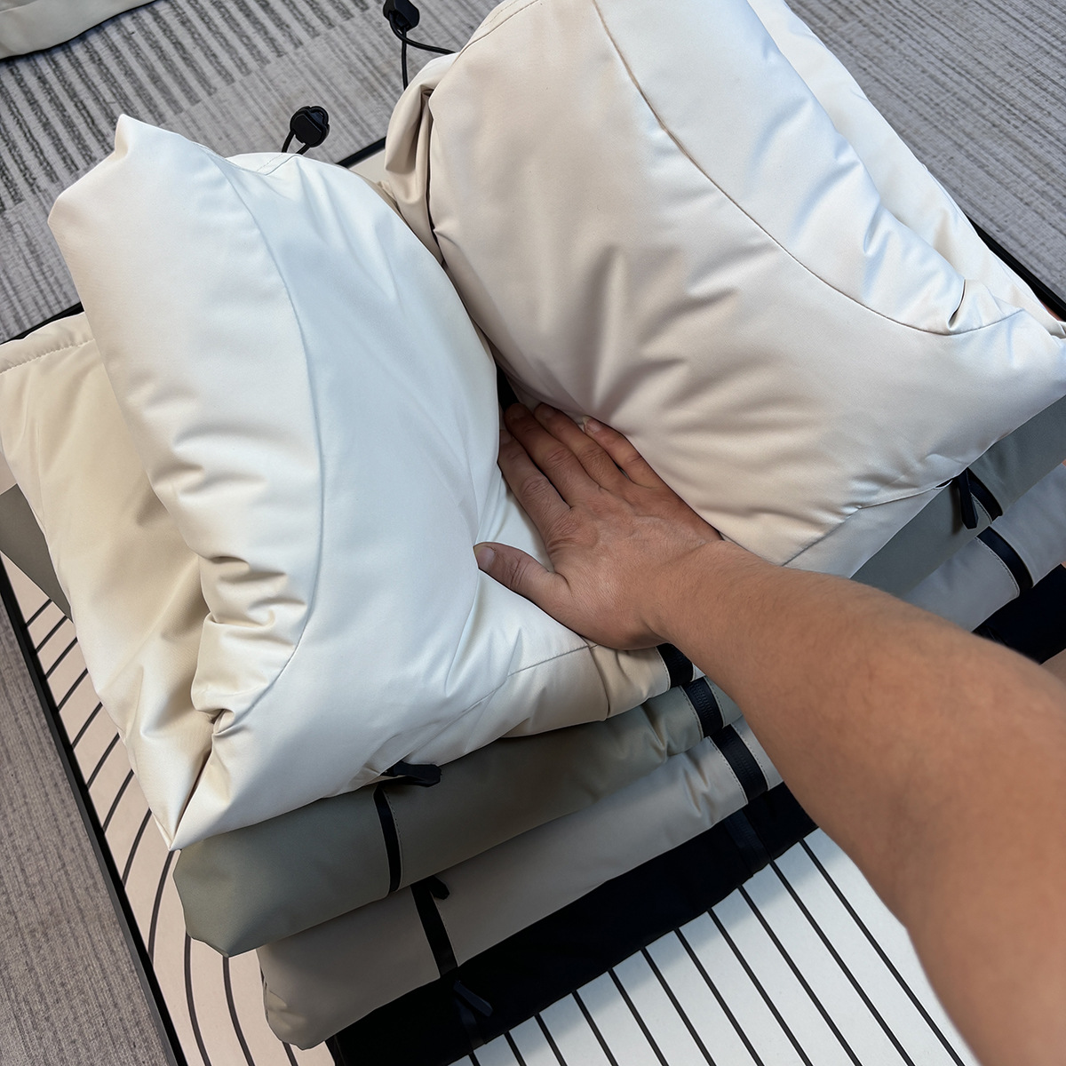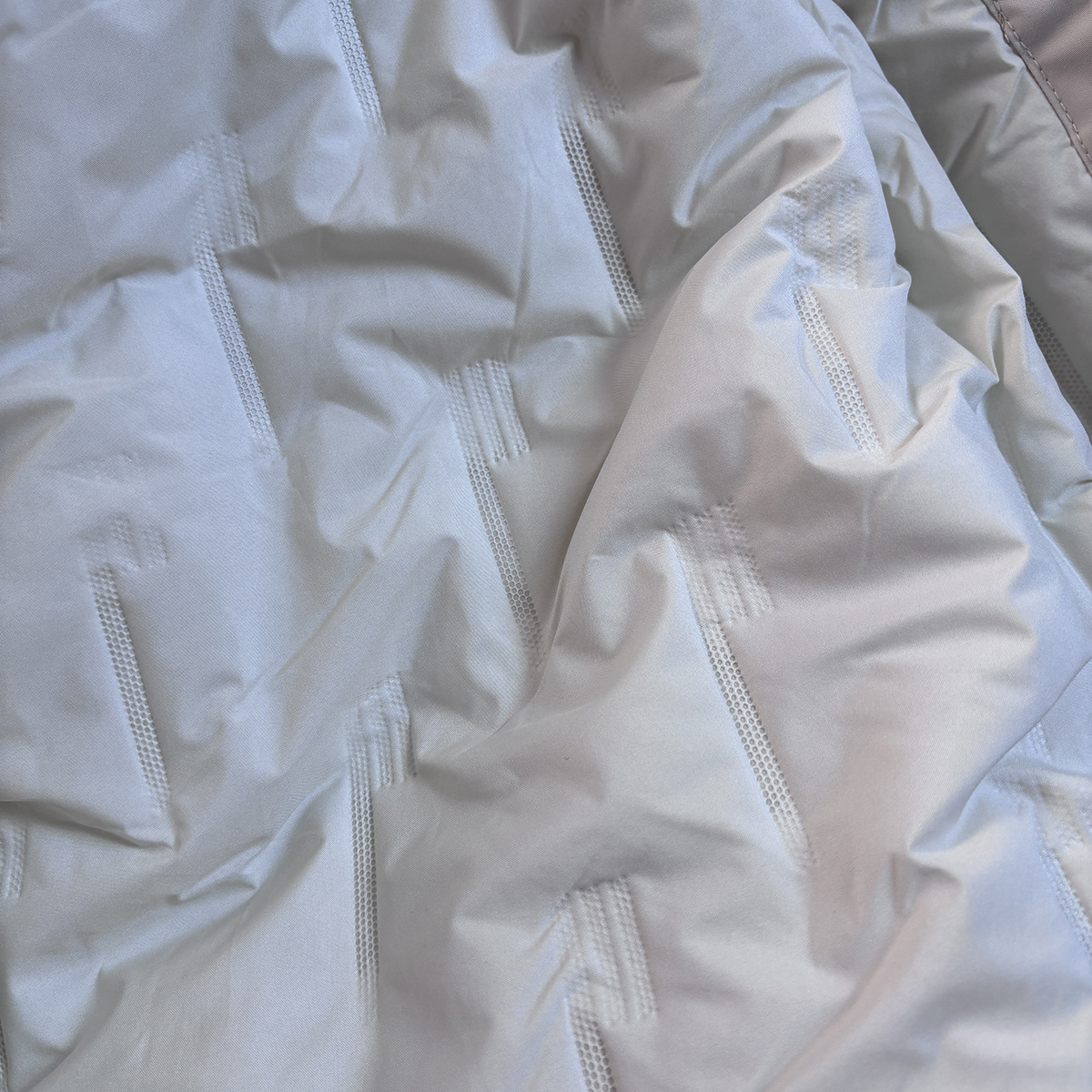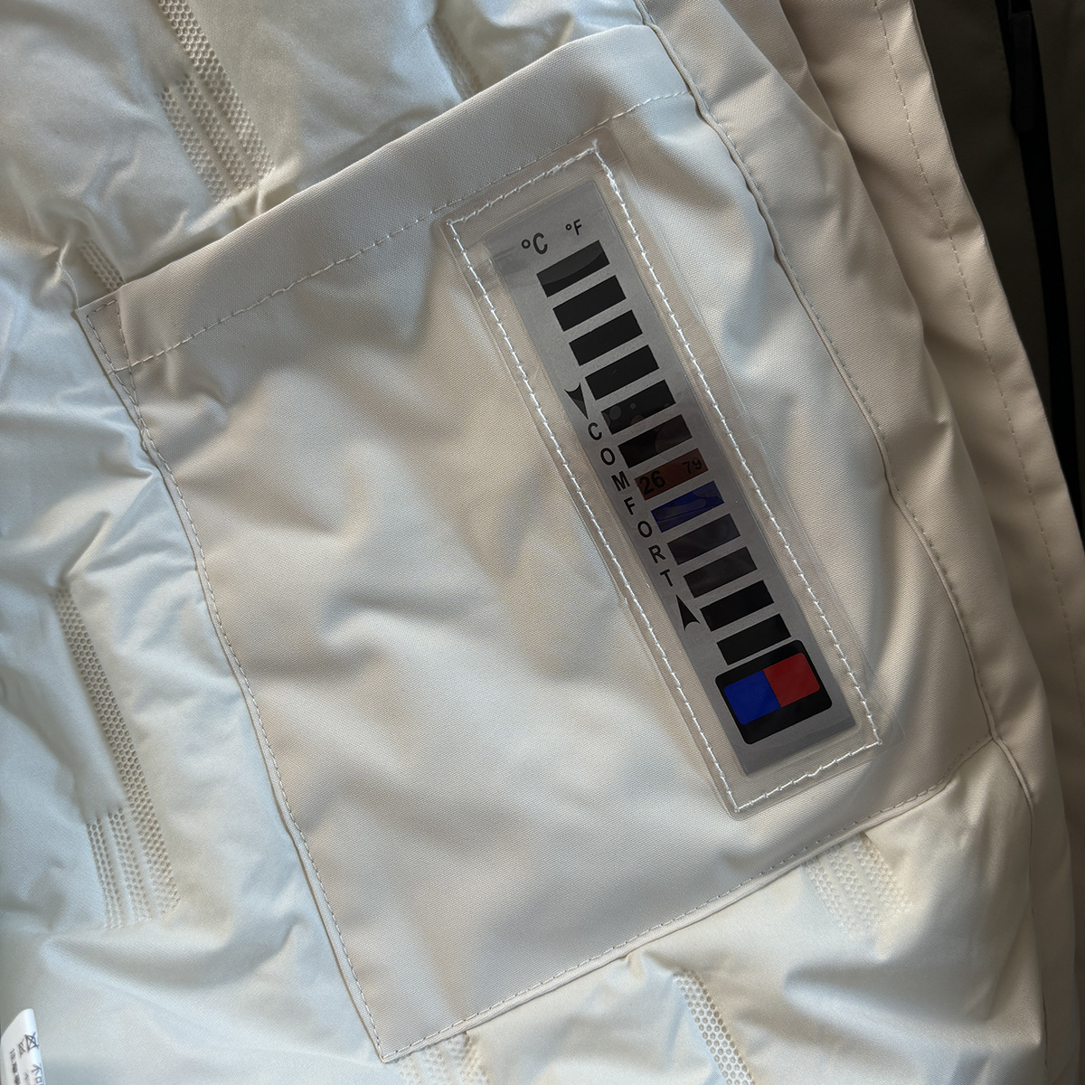 手插口袋,括号剪裁设计 ,无痕压胶边,外衣的防水层,采用仿丝棉,多层纤维结构 矩形压线工艺,填充均匀 机洗不坨绒,蓬松轻便和羽绒服一样,内里小太阳石墨烯自发热,蓄热黑科技,还配有温感变色,15秒可测出温度,有细节图