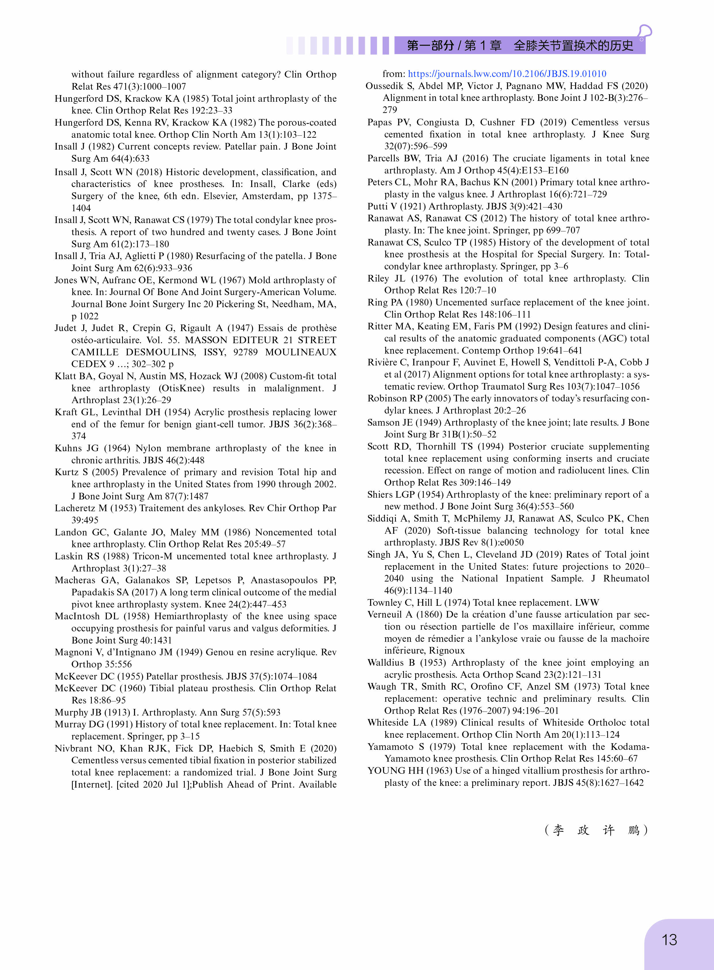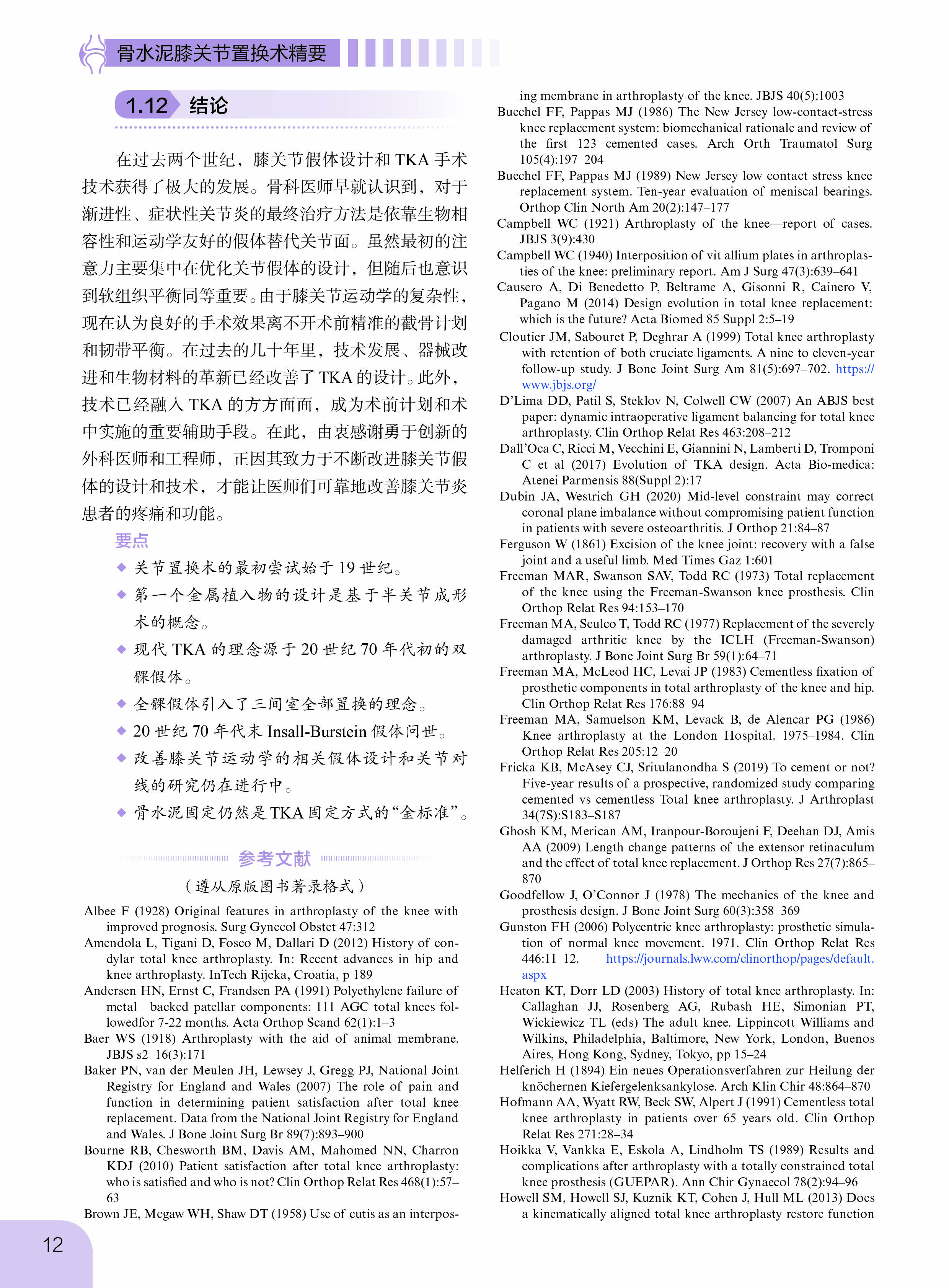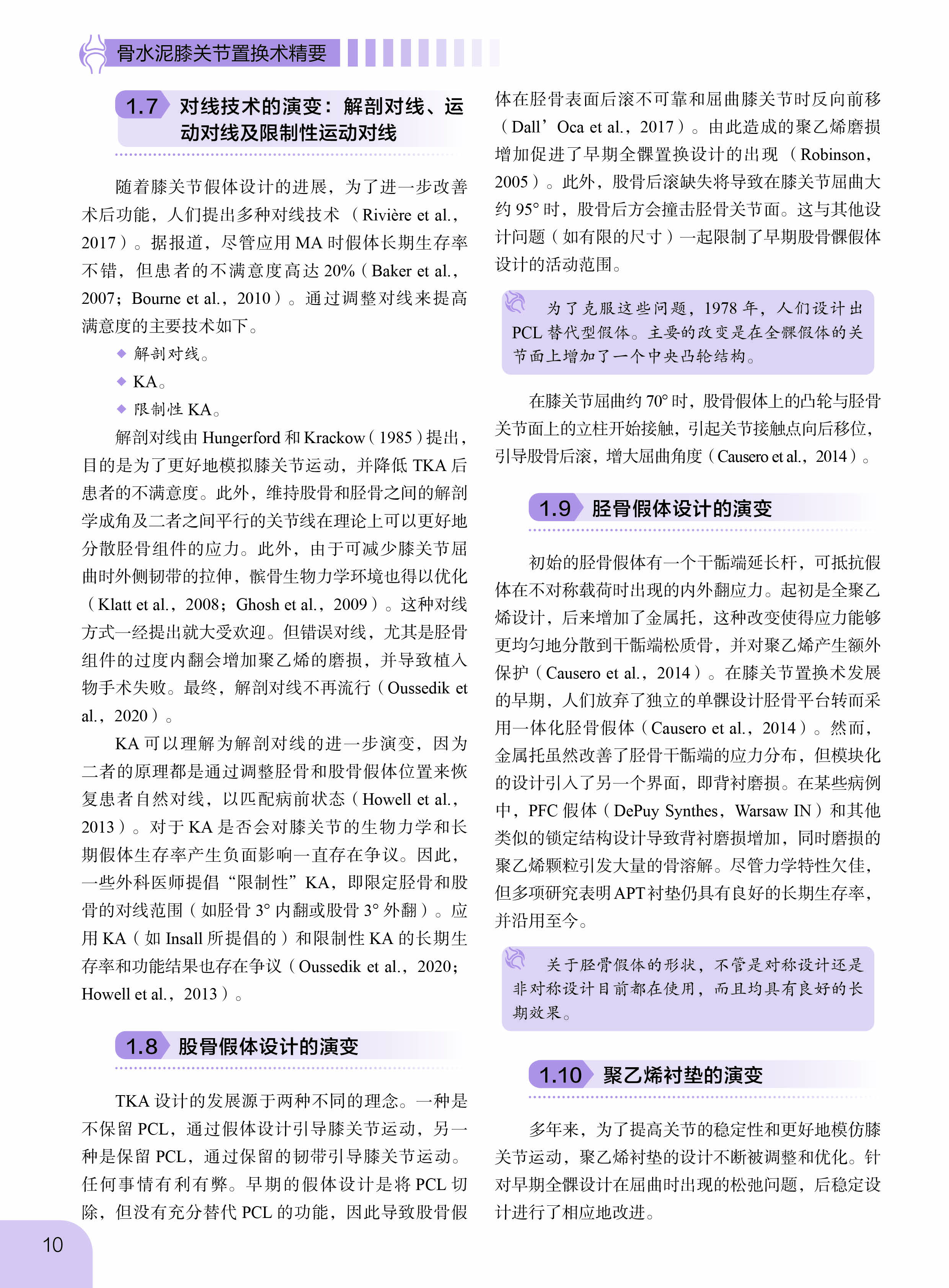 骨水泥型TKA是目前治疗终末期膝关节疾病最成功的方式,而与之伴随的争议及发展方向的探讨不仅没有停止,反而愈演愈烈。如何从纷繁复杂的观点中获得正知正见,困扰着身处信息爆炸时代的我们。了解过去才能正确认识现在,正确认识现在才能科学把握未来。本书不仅是一本全面介绍TKA知识的学术专著,更可贵之处在于其介绍知识的方式颇具启发性,如在关节假体的设计及固定方式方面,本书首先提出在发展与改进过程中前辈遇到的问题,以及针对该问题所提出的解决方案,并对此种解决方案的效果进行评估,继而讨论新解决方法所面临的新问题。这种“问题产生-解决方案-新问题产生”的探讨模式及多种观点碰撞的介绍方式,更让人醍醐灌顶,豁然开朗。