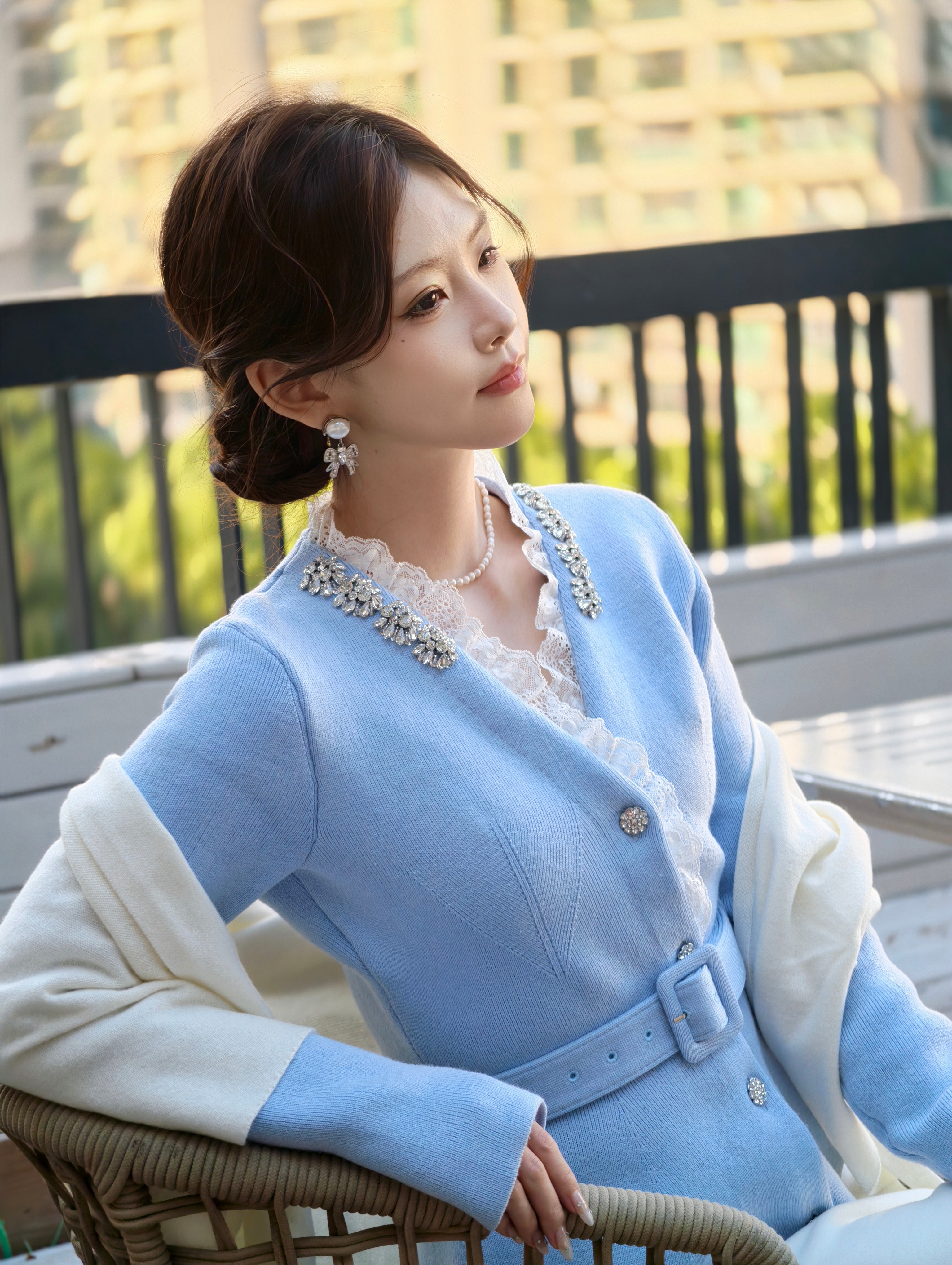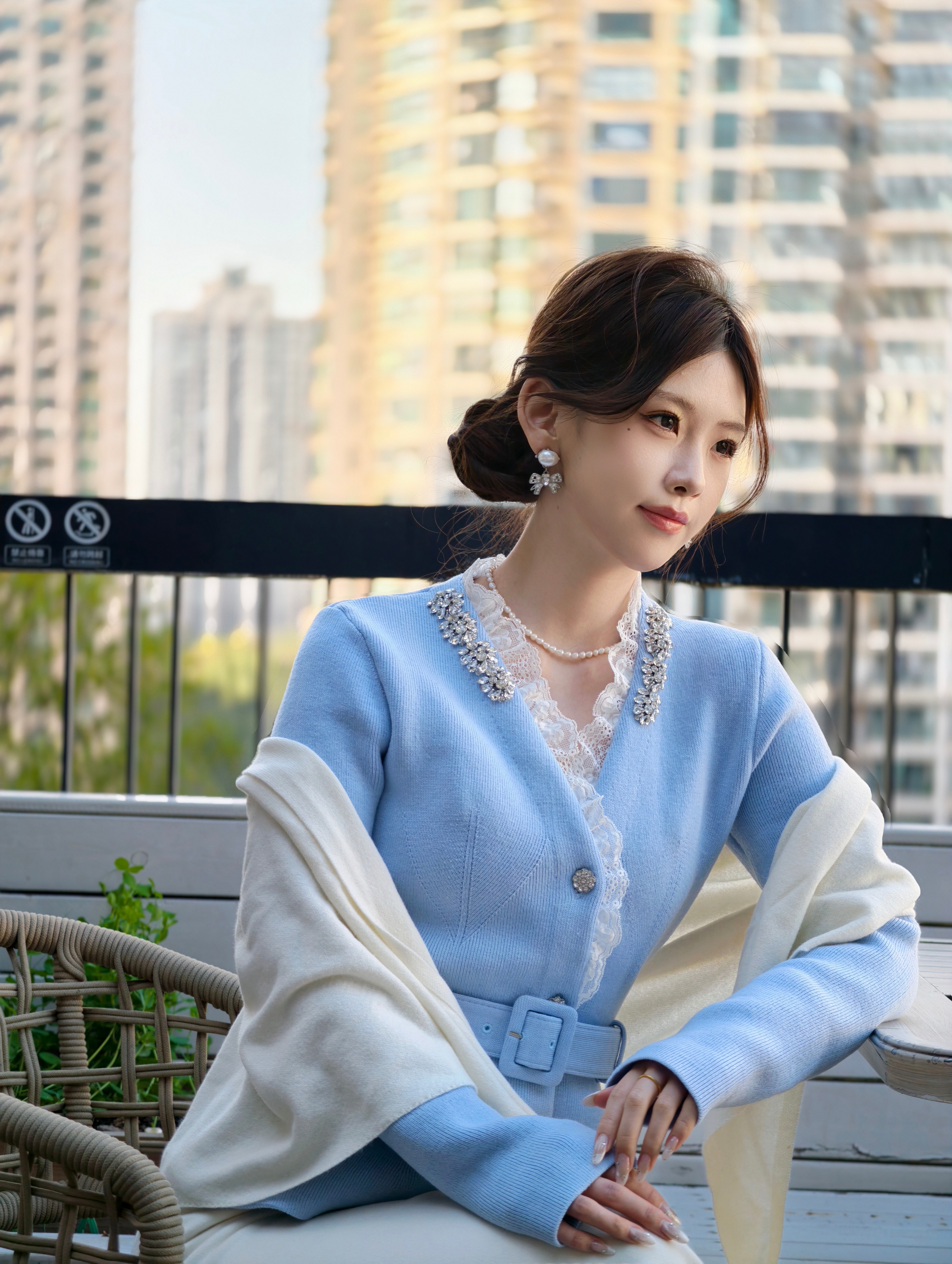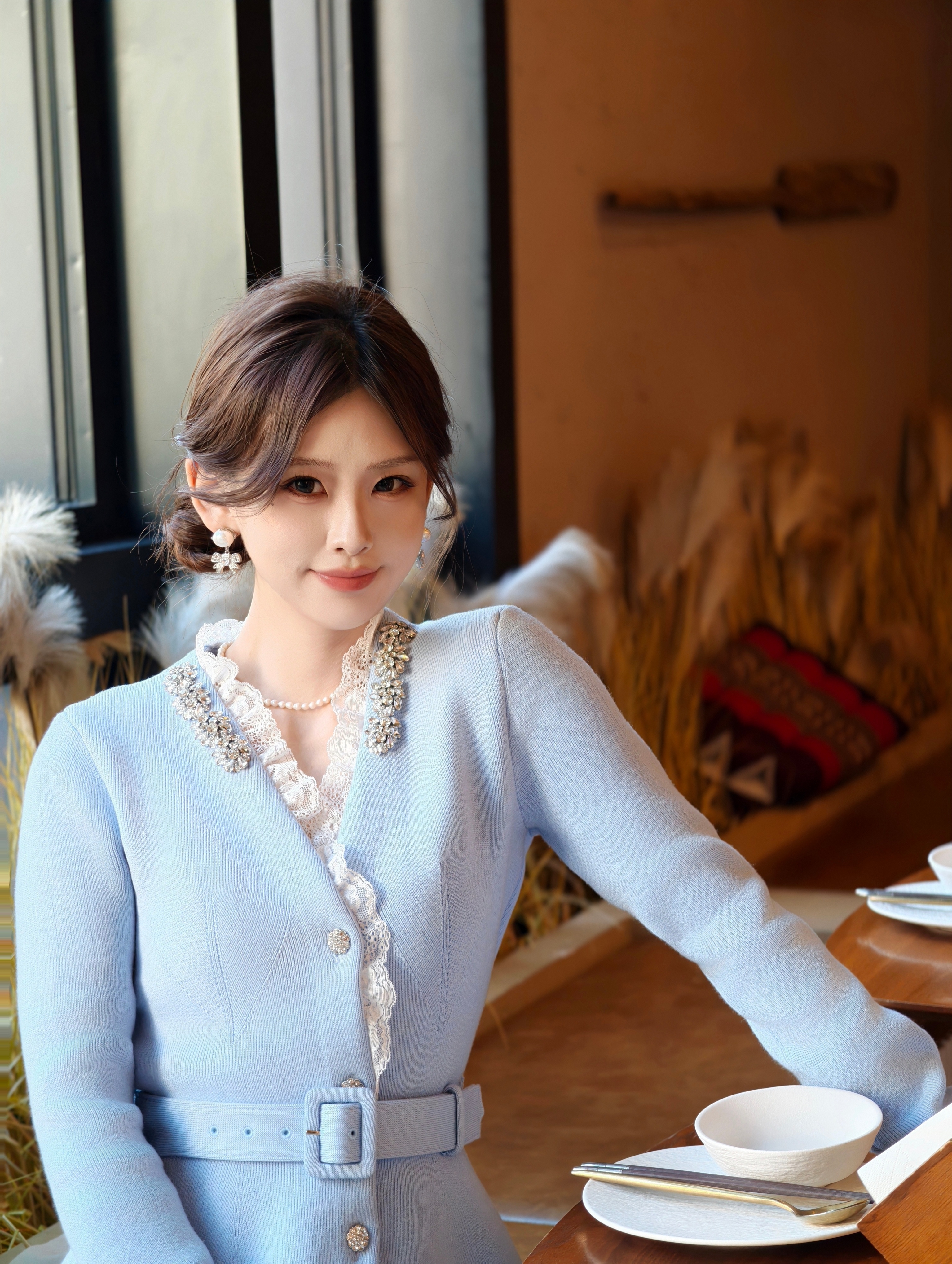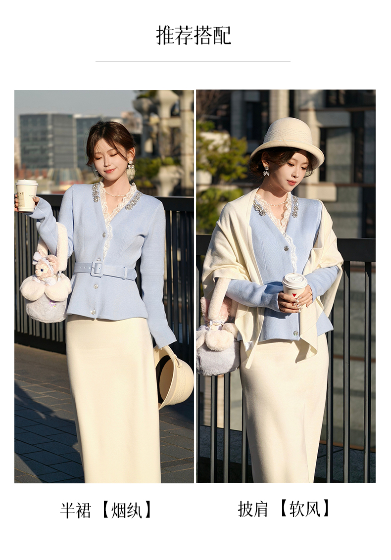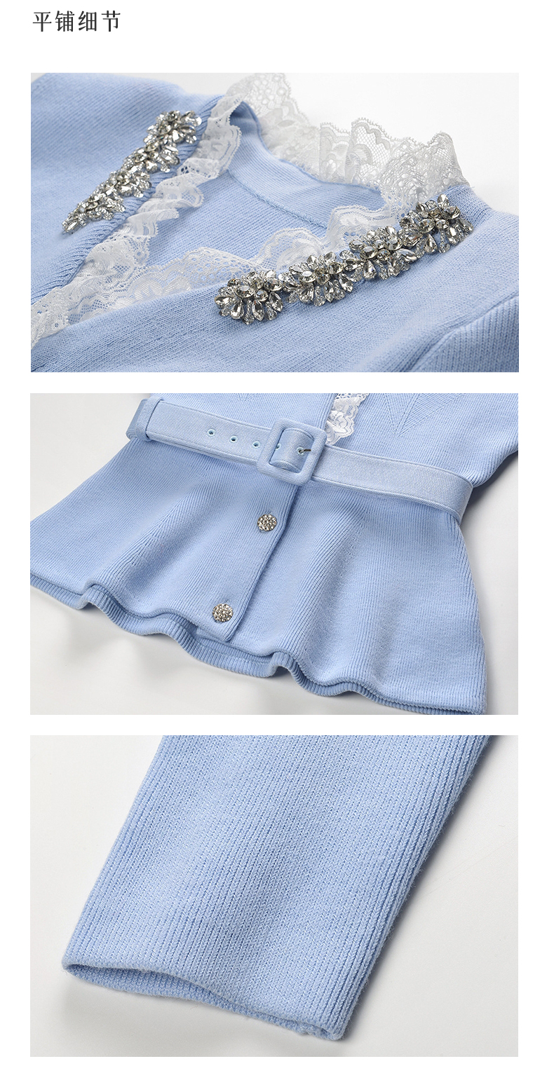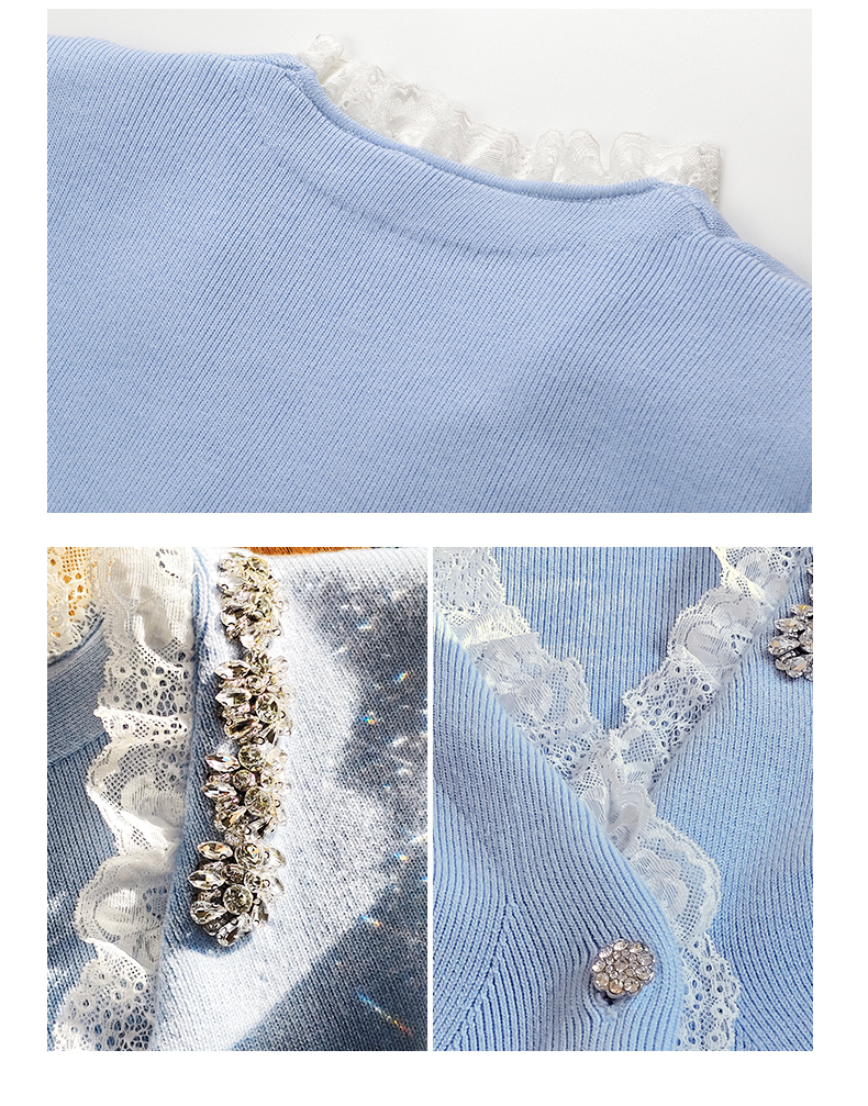 ✨ 拼接蕾丝:选用进口软蕾丝,云朵的柔软触感,亲肤柔软,贴身完全不扎!白色蕾丝的存在,也让蓝色毛衣更加日常,而且V领也不用担心过于暴露哦~~