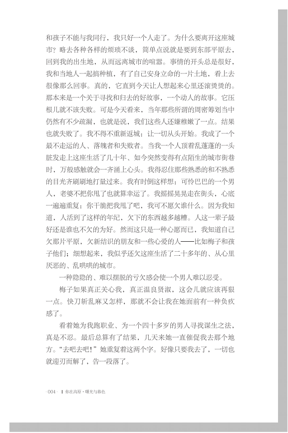 这本超长的小说《你在高原》便是张炜的燃烧着的心灵长旅,这十部作品以其思想和艺术的纯正,为我们这个时代的文学竖起了一座精神的碑石。为我们时代的某些严重缺失提供精神滋养。张炜的道德建构并不是机械的说教和宣谕,是一种潜移默化般的道德心灵化,是一种形象和诗意的建构,夹杂着愤怒、呐喊、冥思和激情,书中多次出现的;燃烧意象和;火戒引文,既是对我们时代疯狂欲望的生动概括,盈满了悲愤,又将其提到原罪的层面进行彻底的道德审判。