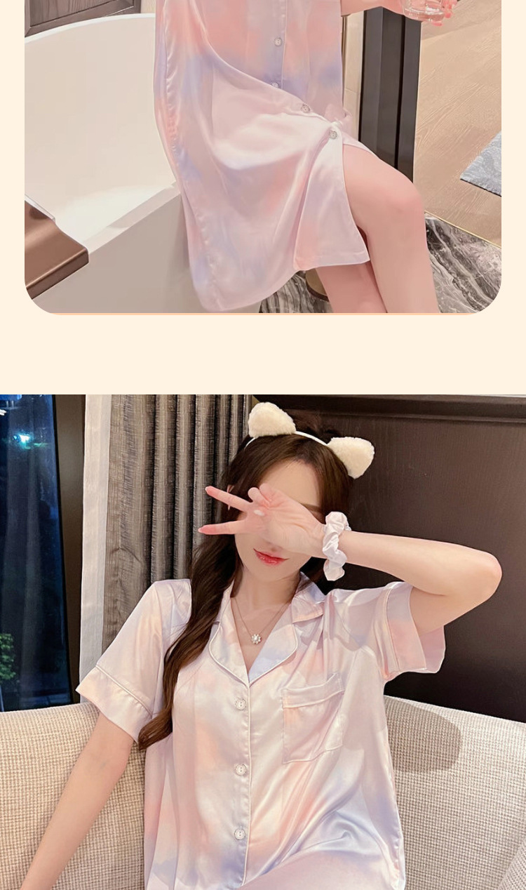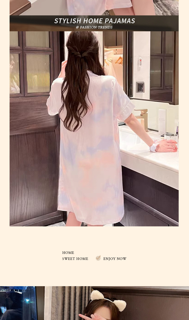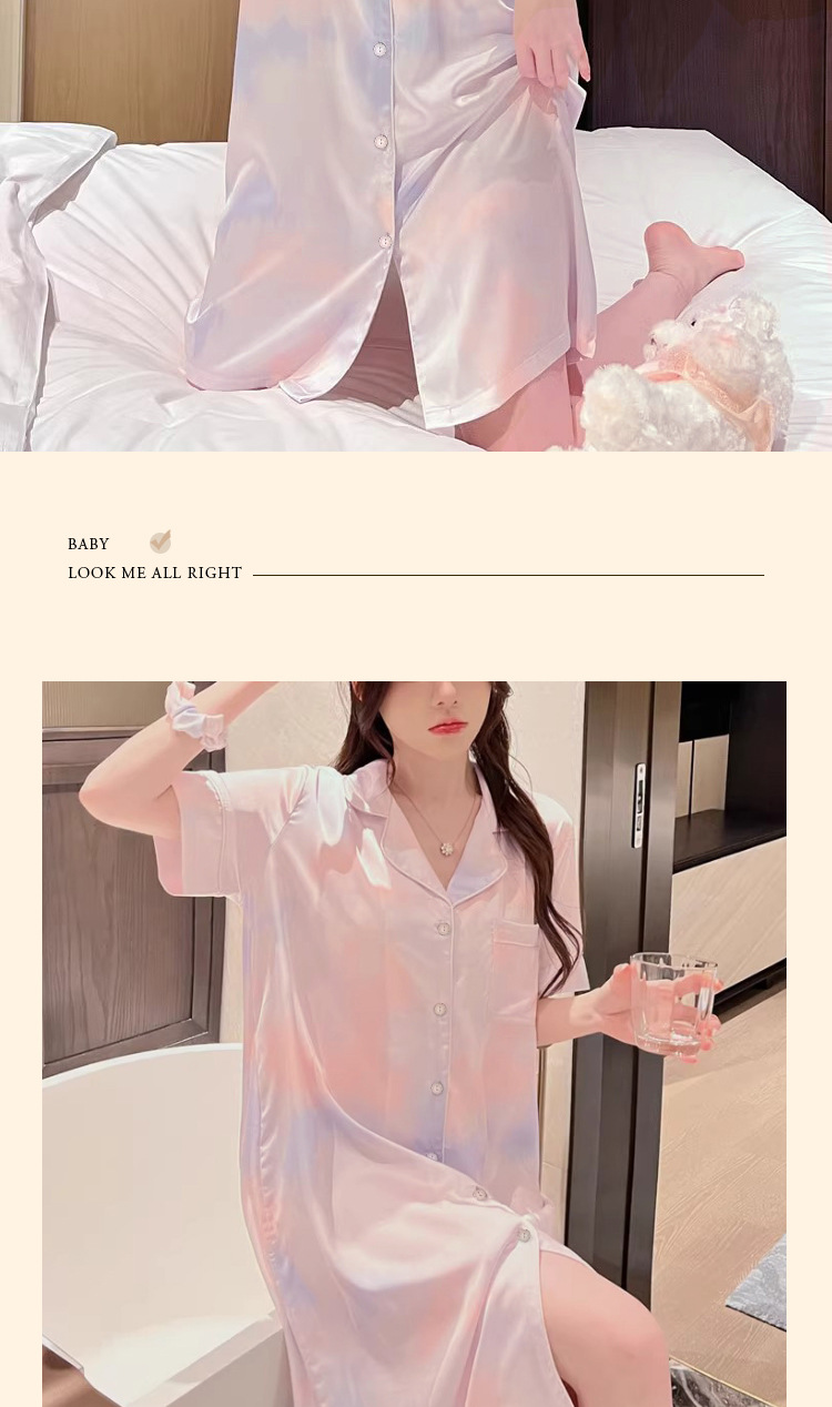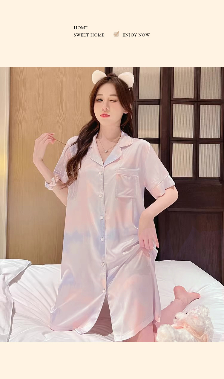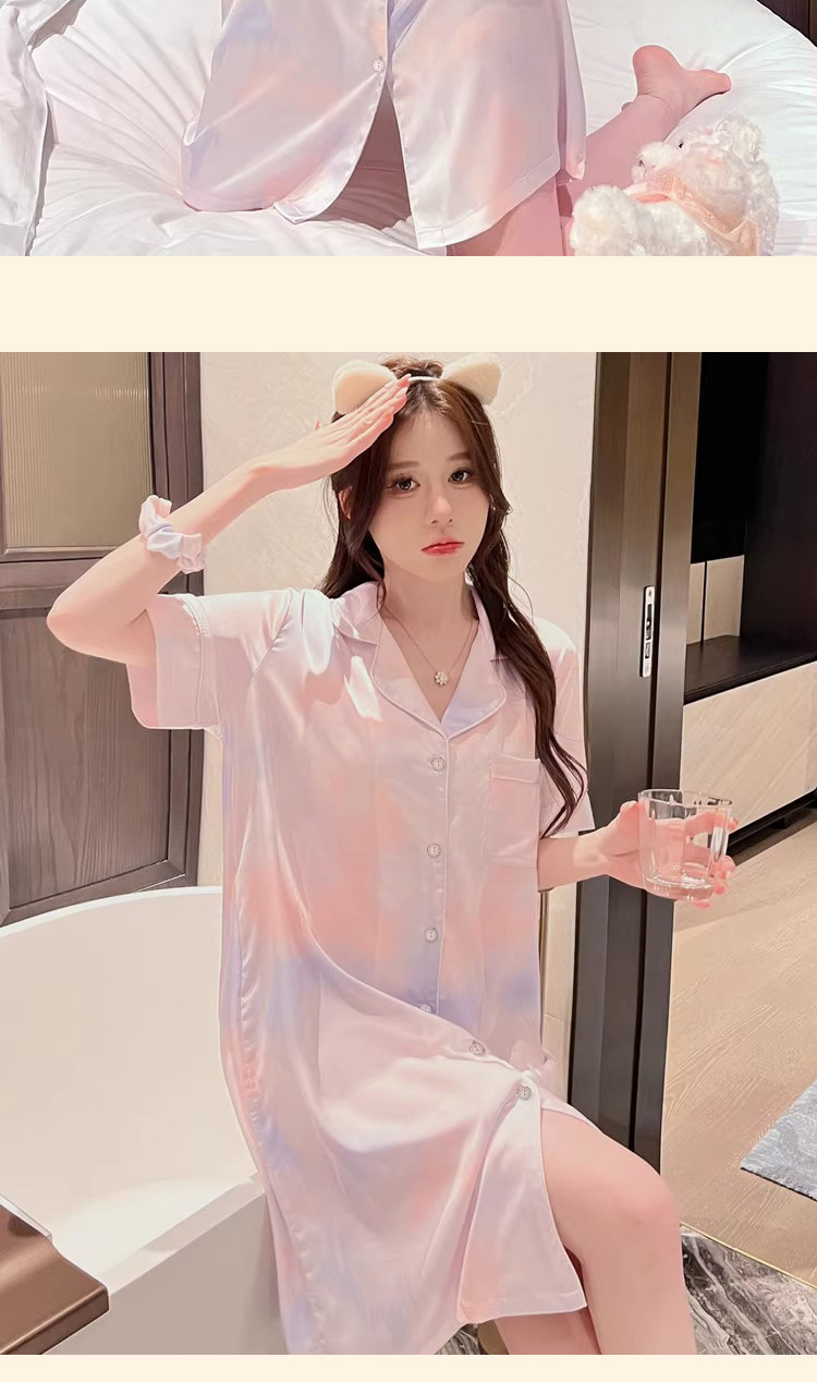 冰丝睡裙女夏季短袖中长款宽松简约彩色晕染休闲甜美女士睡衣批发