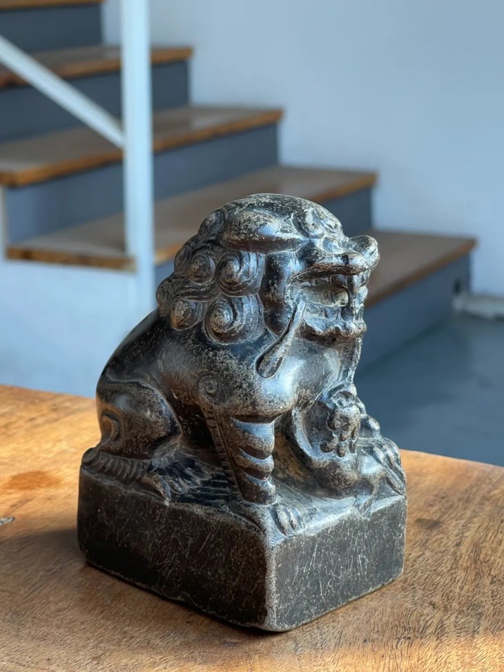 青石子母瑞狮案头摆件